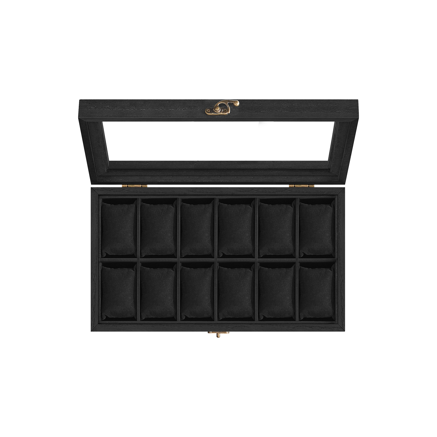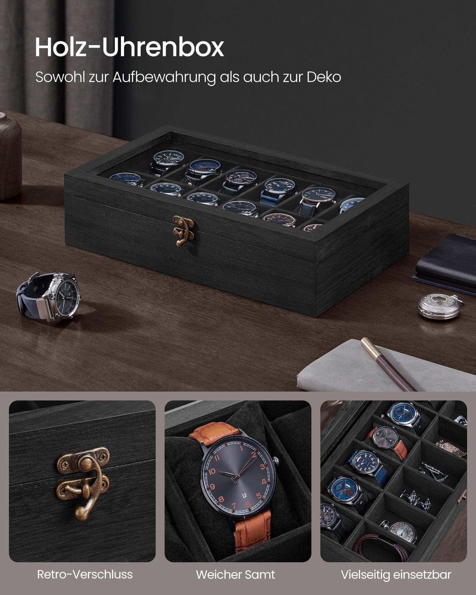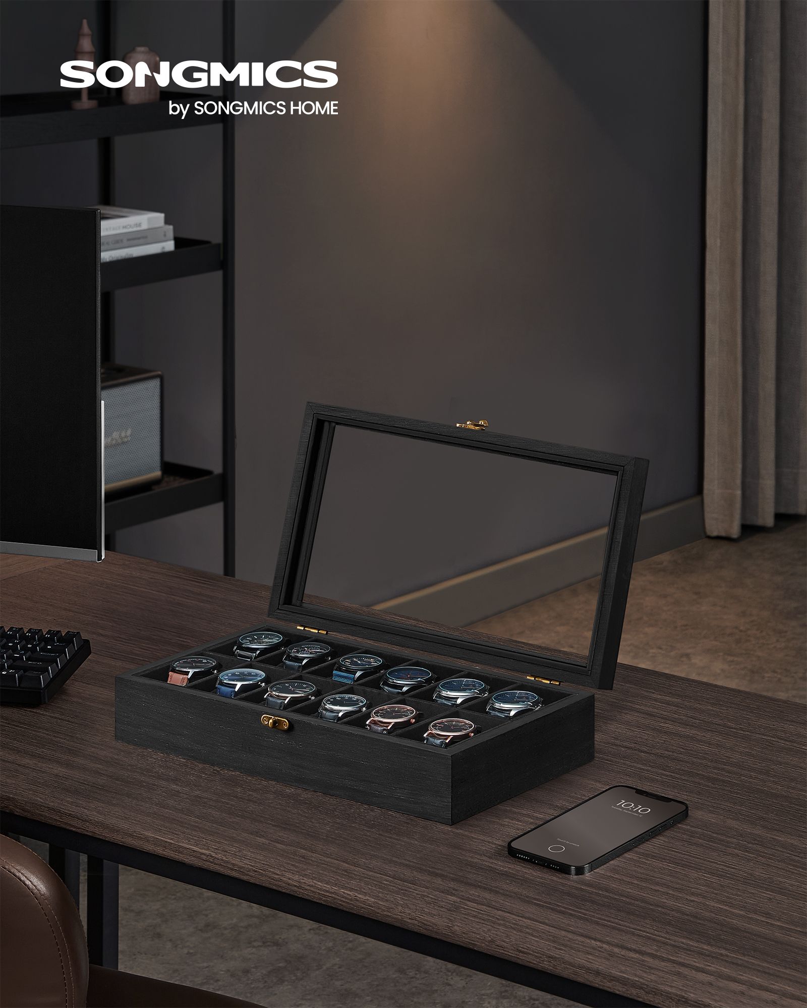 SONGMICS kellolaatikko 6 lokerolla, massiivipuinen kellokotelo, lasikansi, kellotyyny, lahja rakkaillesi, pähkinänruskea JOW006K01