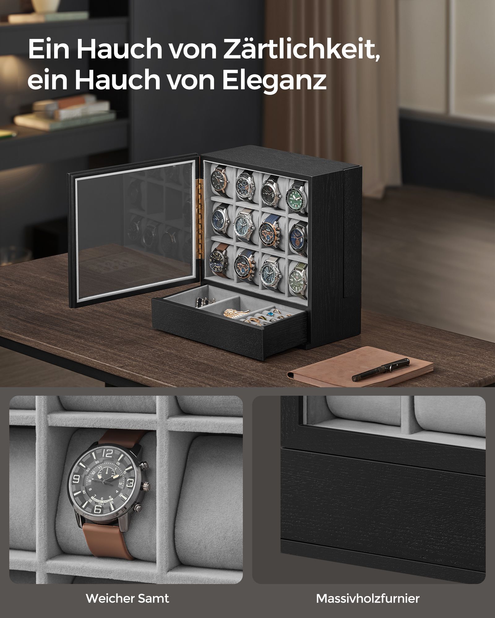 SONGMICS kellolaatikko 12 lokeroa, kellolaatikko ikkunalla, kellojen esittely, puukuviopinta, samettivuori, pystysuora säilytys, tilaa säästävä