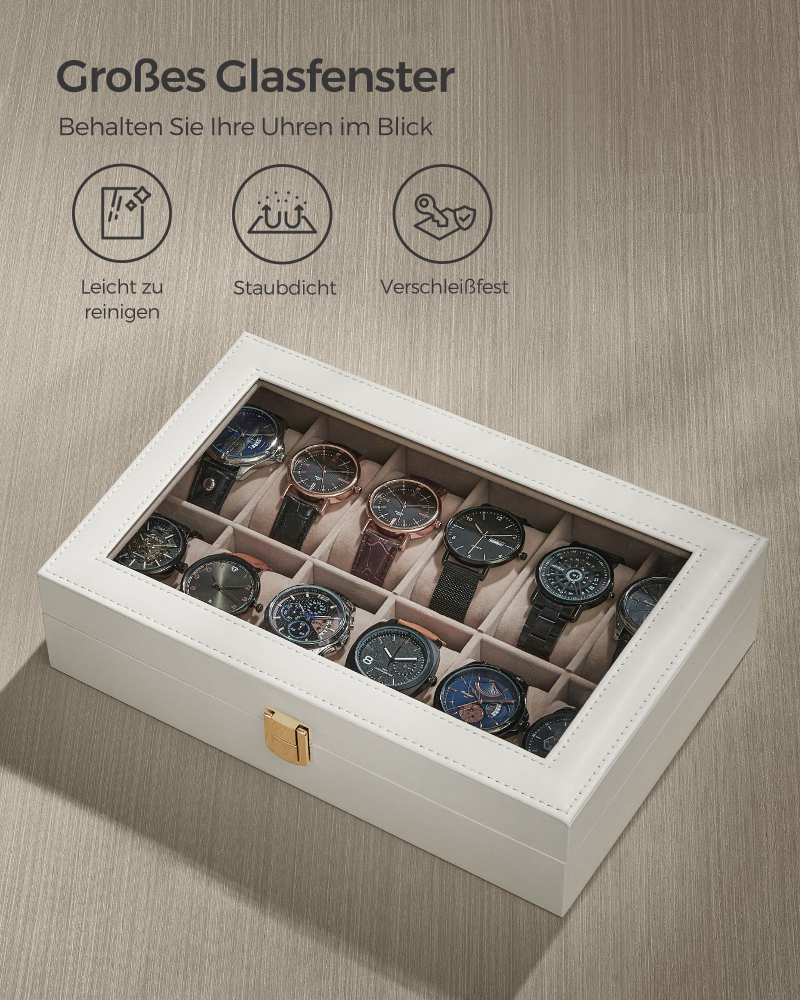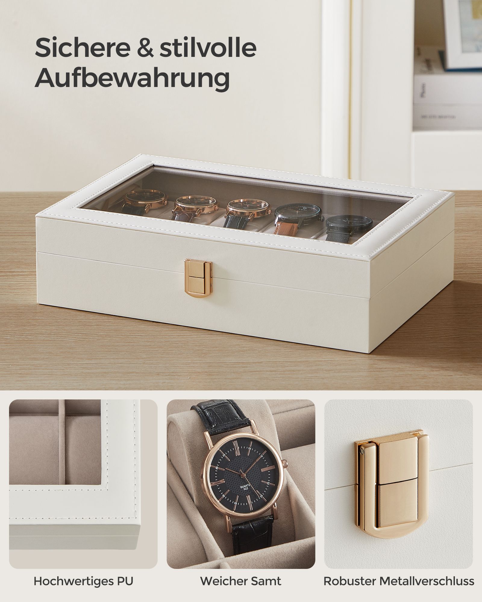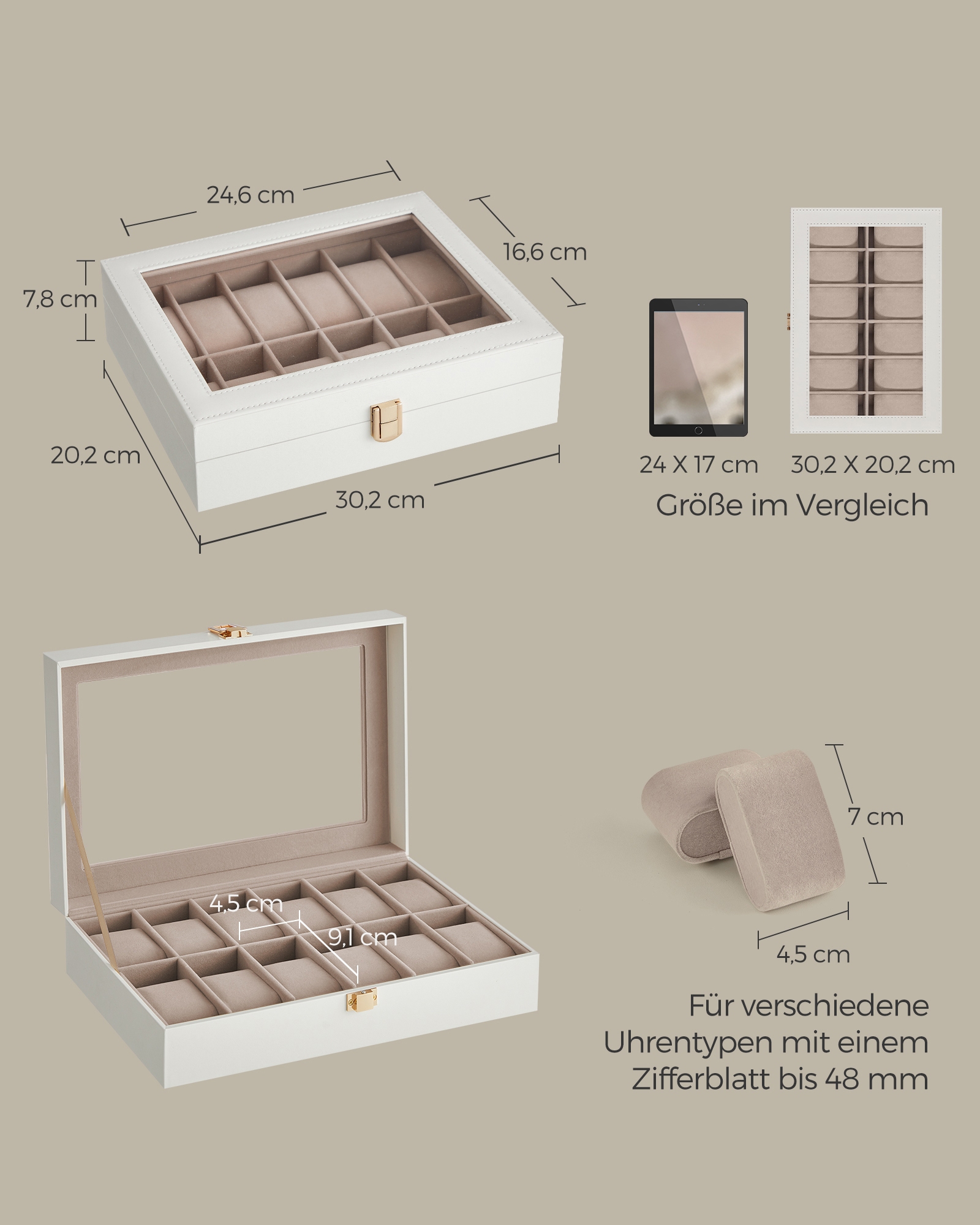 SONGMICS kellolaatikko, 12 lokeroa, kellokotelo, lasikansi, kellokotelo, irrotettavat kellotyynyt, metallinen lukko, lahjaidea, PU-päällinen pilvivalkoinen