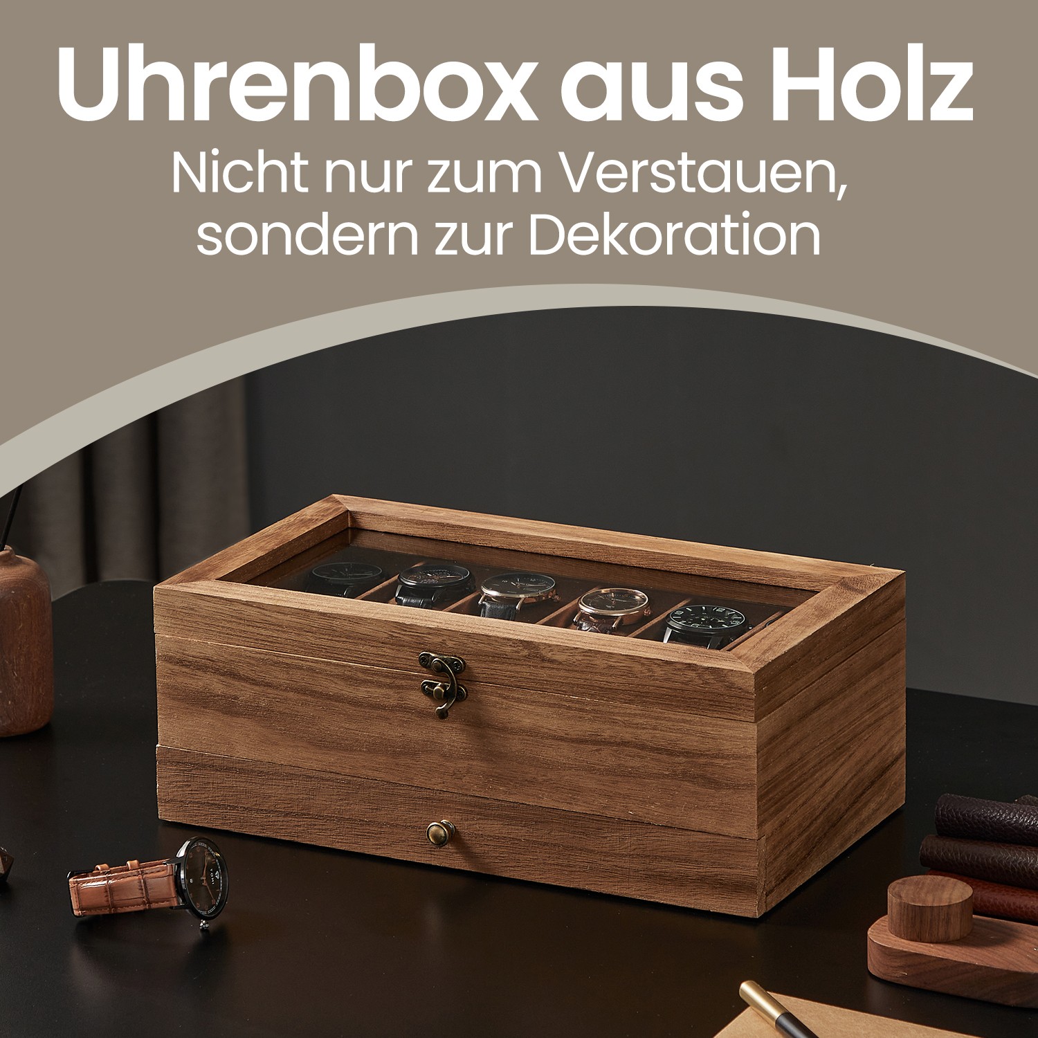 SONGMICS kellolaatikko, 12 lokeroa, massiivipuinen kellolaatikko, lasikansi
