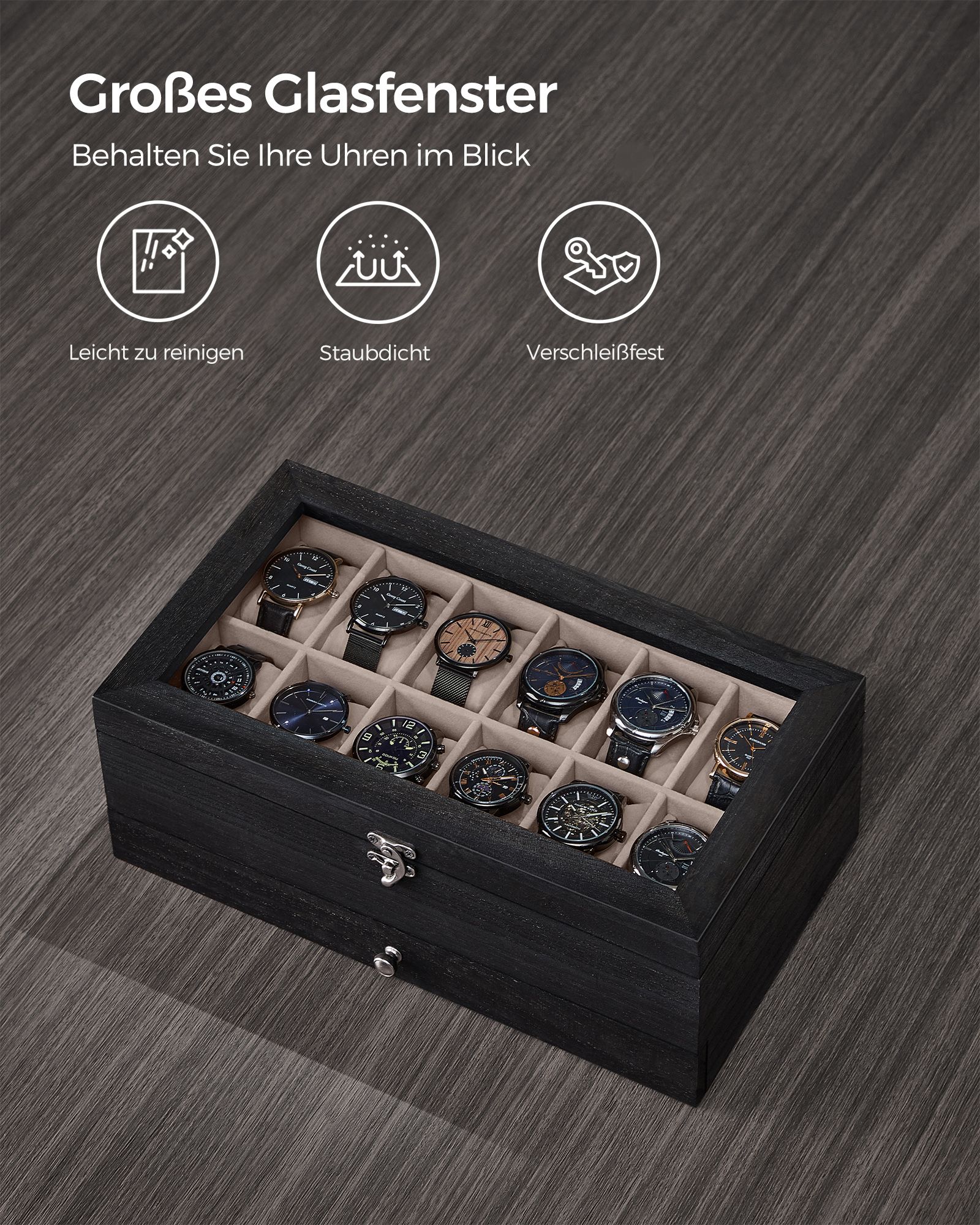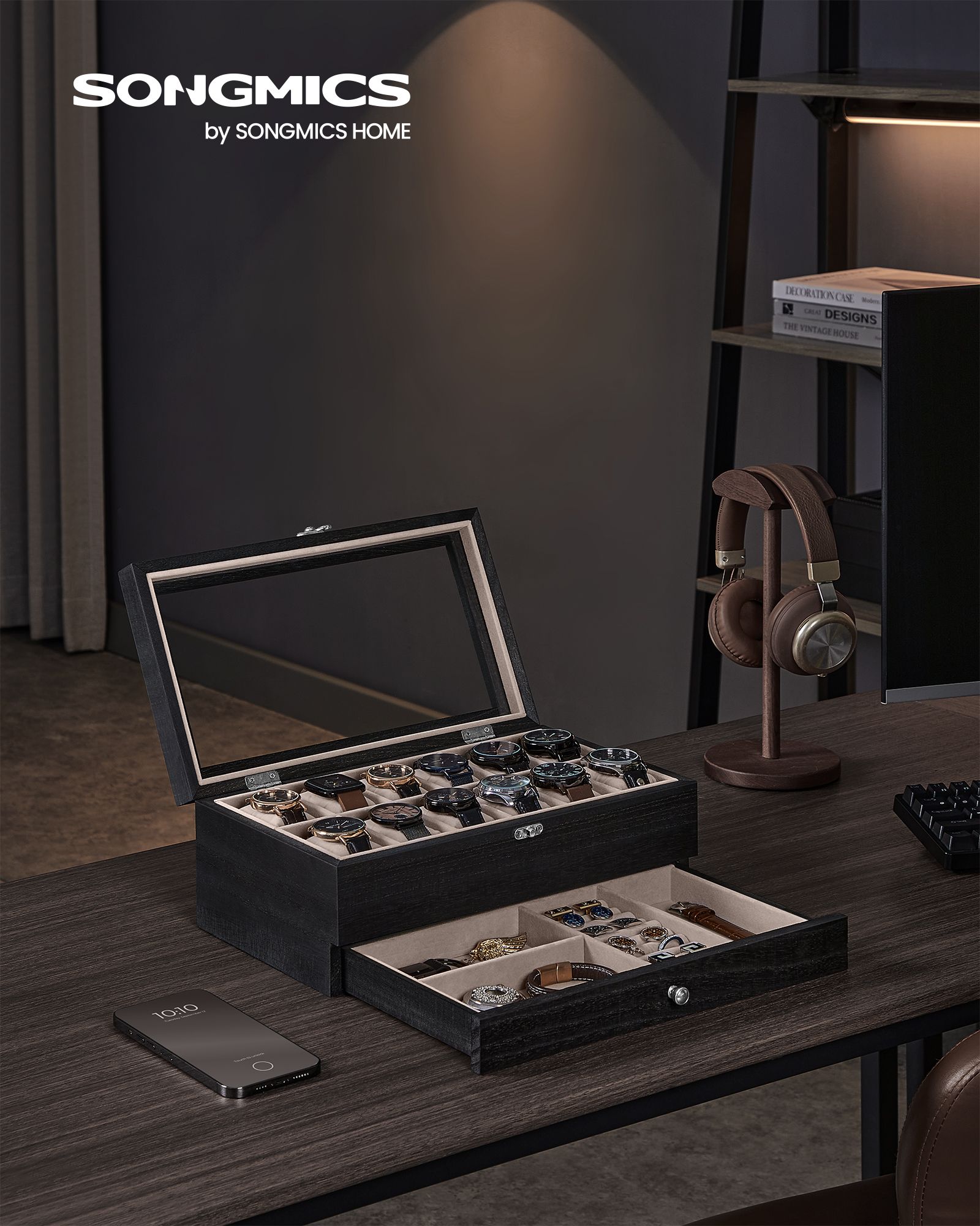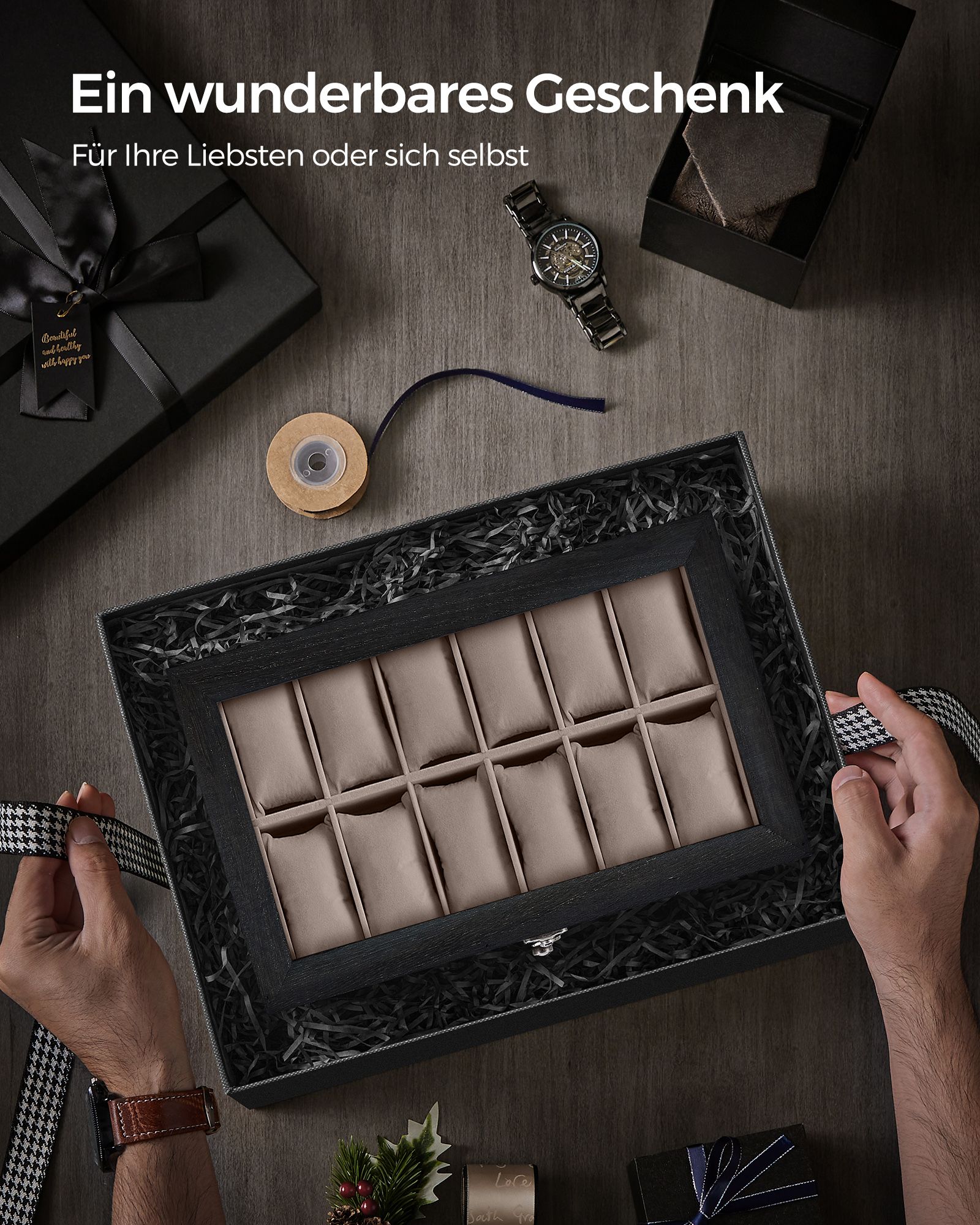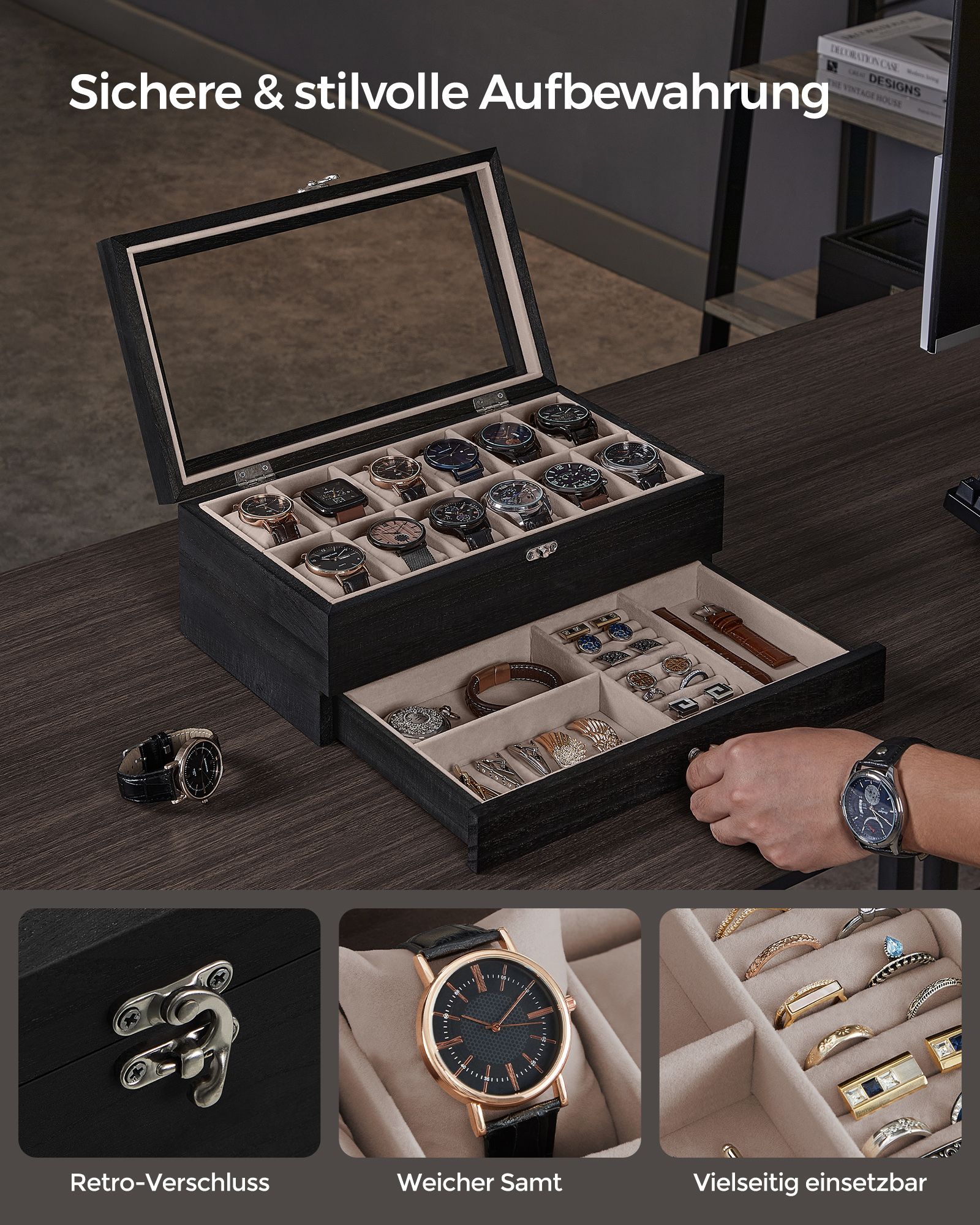 SONGMICS kellolaatikko, 8 lokeroa, massiivipuinen kellolaatikko, lasikansi, renkaille, rannekoruille ja kaulakoruille, joulu, pähkinänruskea JOW008K01