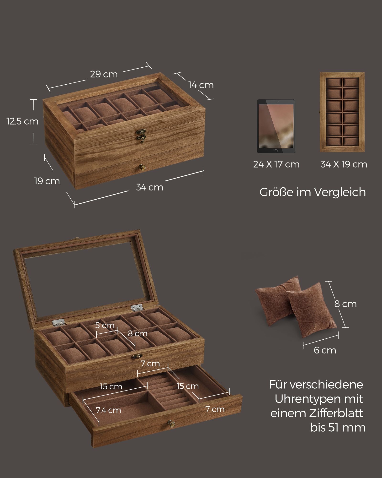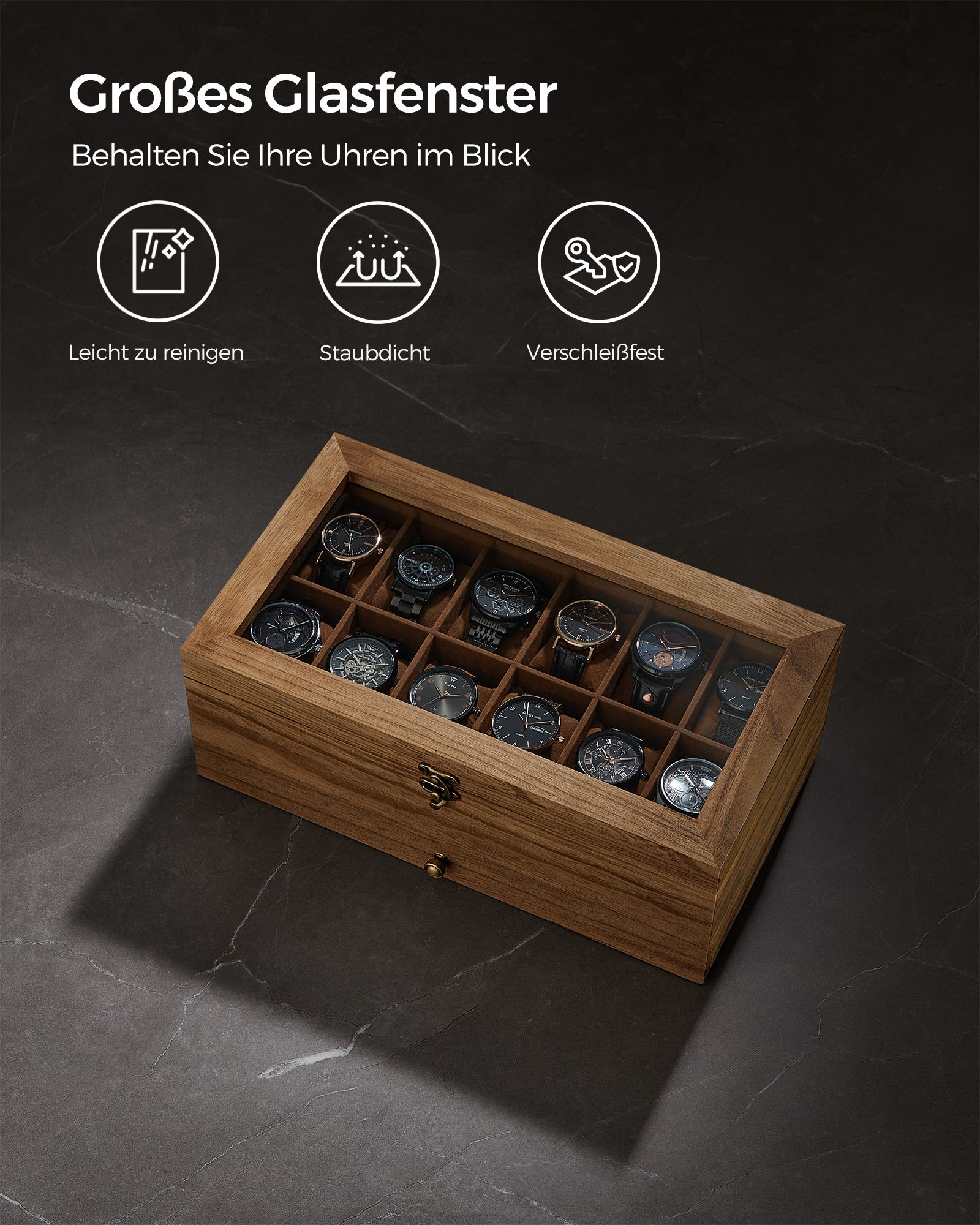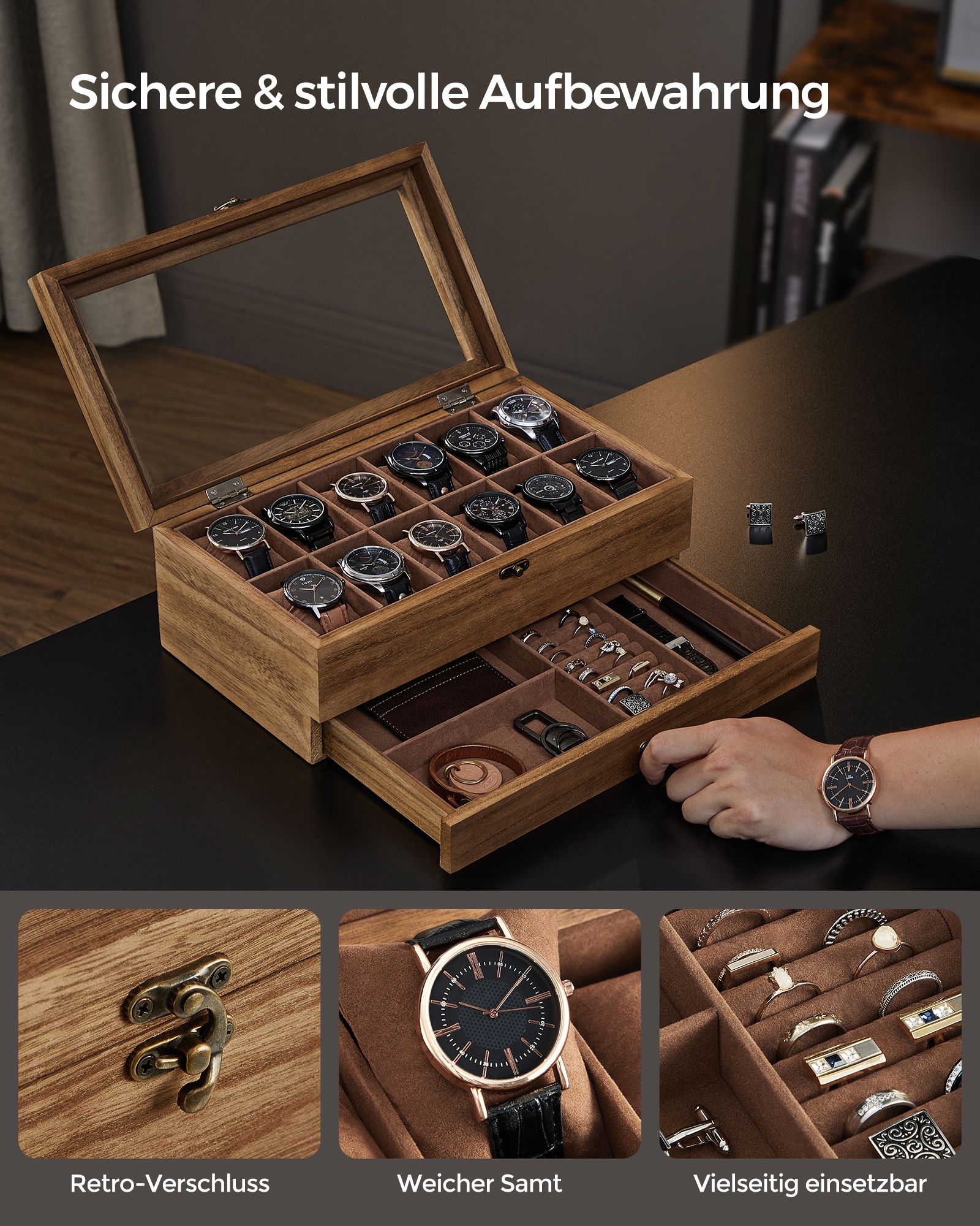 SONGMICS kellolaatikko, 8 lokeroa, massiivipuinen kellolaatikko, lasikansi, renkaille, rannekoruille ja kaulakoruille, joulu, pähkinänruskea JOW008K01