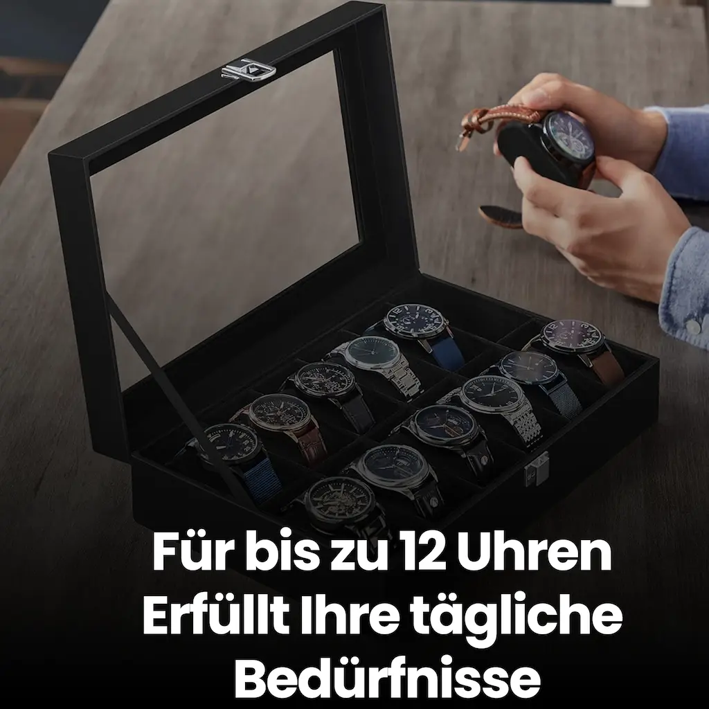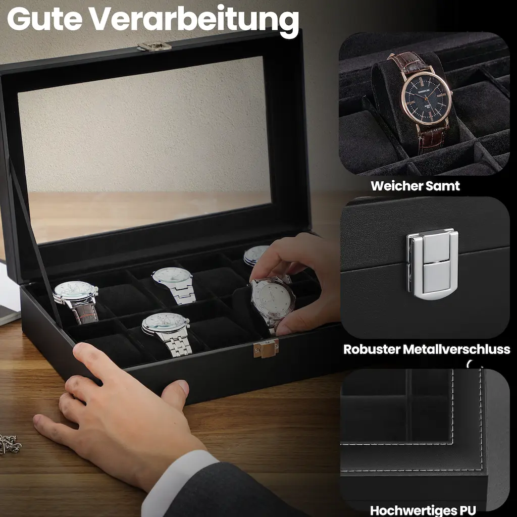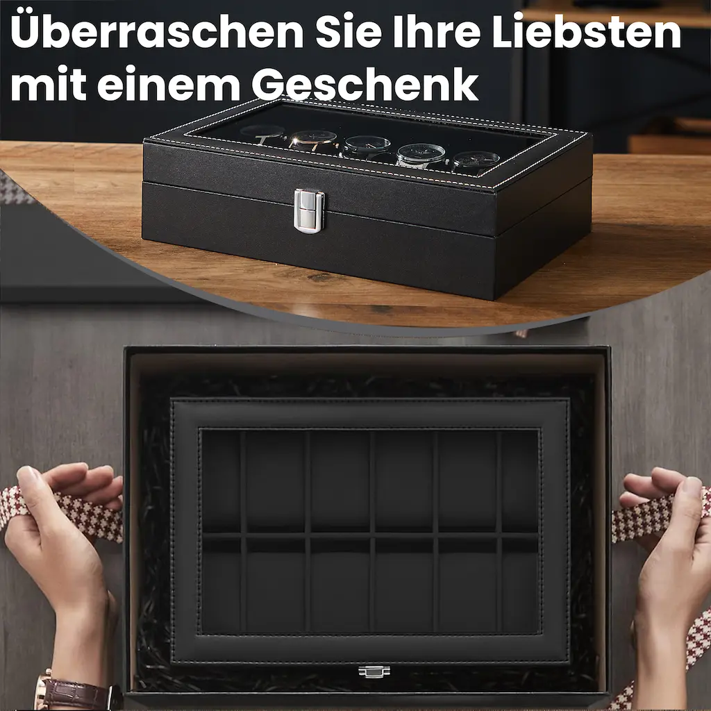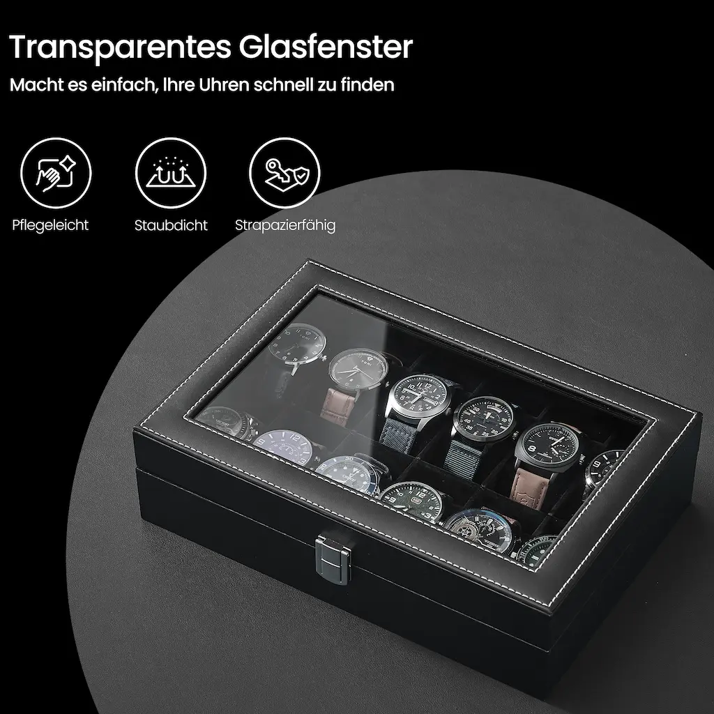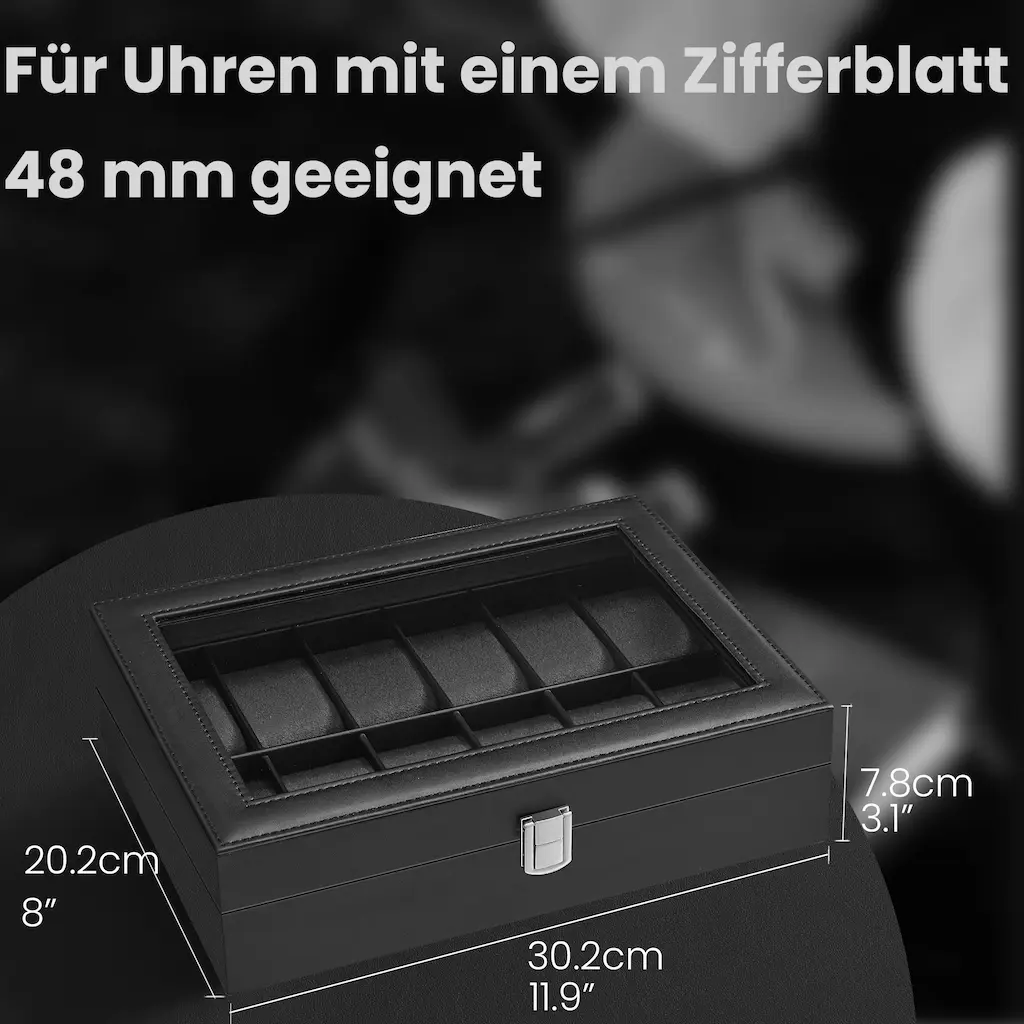 Menestyksen avain piilee yksityiskohdissa: tämä SONGMICS-kellolaatikko on suunniteltu viimeistä yksityiskohtaa myöten. Kellojen suojaamiseksi vieraiden käsiltä se on varustettu lukolla. Lisäksi olemme vahvistaneet kellokoteloiden välisiä väliseiniä, mikä antaa kelloillesi tukevan pidon.Yksinkertaisen ulkokuoren takana piilee kellojen unelmakoti: kellolaatikko näyttää yksinkertaiselta ja hillityltä, mutta kun avaat kannen, sen ylellinen sisustus yllättää sinut: laatikko on vuorattu pehmeällä samettivuorauksella ja myös kellotyynyt on päällystetty sametilla. Täältä kellosi tai rannekellosi löytävät sopivan kodin. Irrotettavien kellotyynyjen ansiosta voit säilyttää laatikossa myös muita koruja, mikä on toinen tämän laatikon kohokohta. Investointi kannattaa: kellolaatikko suojaa arvokkaita kelloja lialta, naarmuilta, vaurioilta jne. Näin säästät kellon korjaus- tai huoltokustannuksissa. Ei siis ole epäilystäkään siitä, että kellolaatikon ostaminen on järkevä sijoitus. Tuotetiedot: Väri: musta Materiaali: MDF, PU, sametti, lasi Kokonaismitat: 30 x 21 x 8,5 cm (P x L x K) Mitat kellokoteloa kohti: 7 x 4,8 cm Mitat kellotyynyä kohti: 7 x 3,5 x 4,8 cm (L x K x S) Paino: 1,12 kg Toimitus sisältää: 1 x kellolaatikko