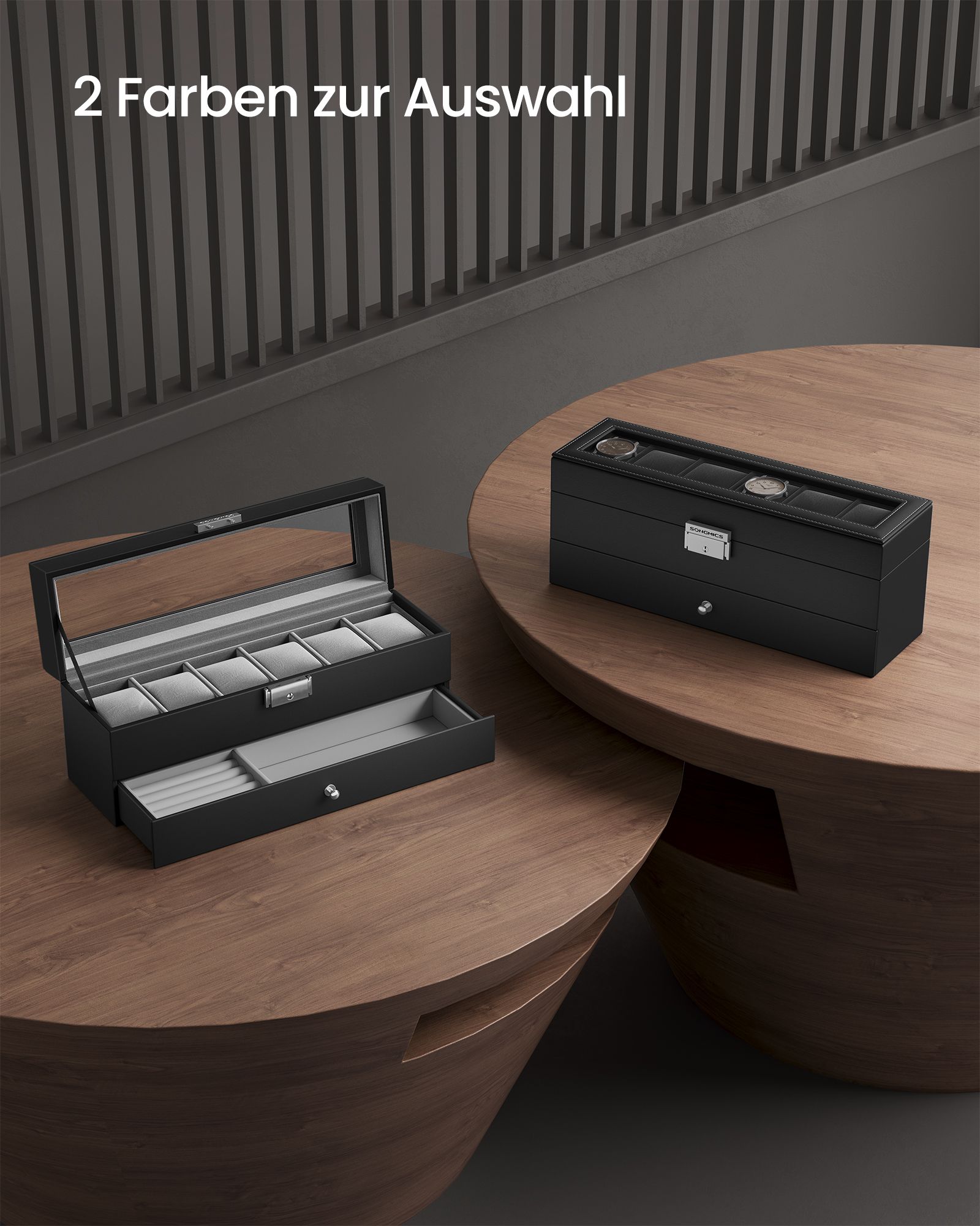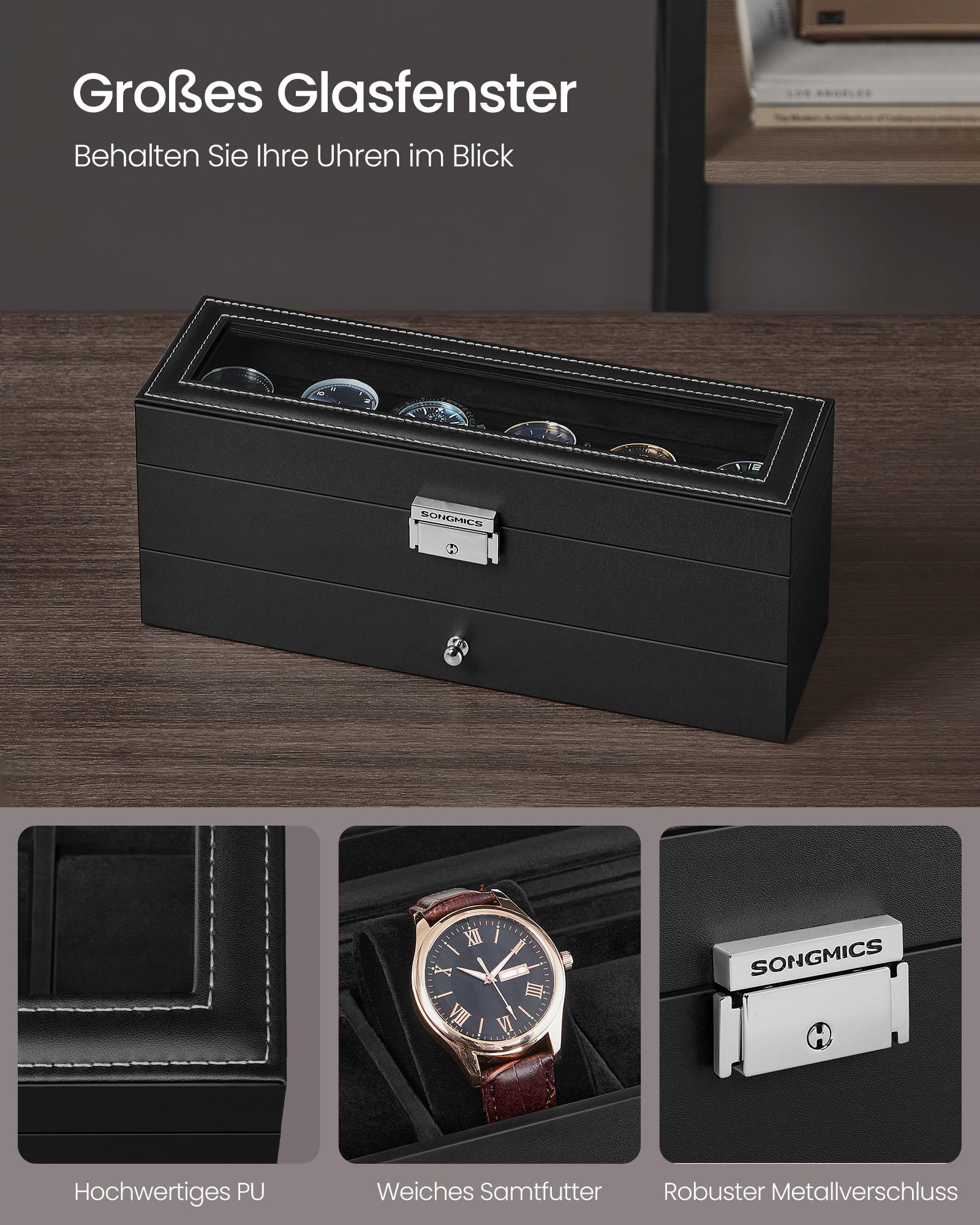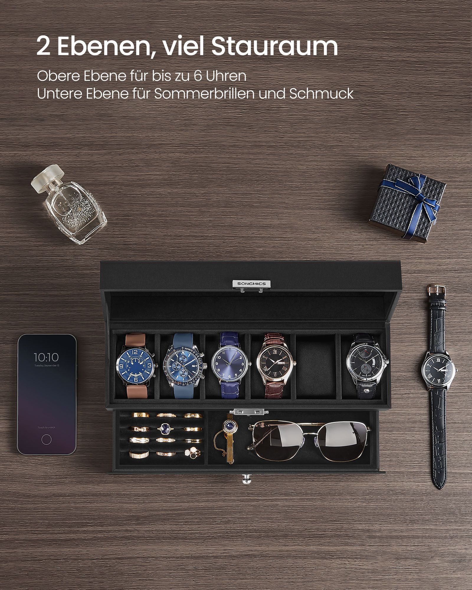 SONGMICS kellolaatikko, kellokotelo lasikannella, 2 tasoa, 6 kellolle, lukittava, 1 laatikko, sormuksille, rannekoruille, lahjaidea, PU-päällinen musta, sisävuori musta JWB060B02