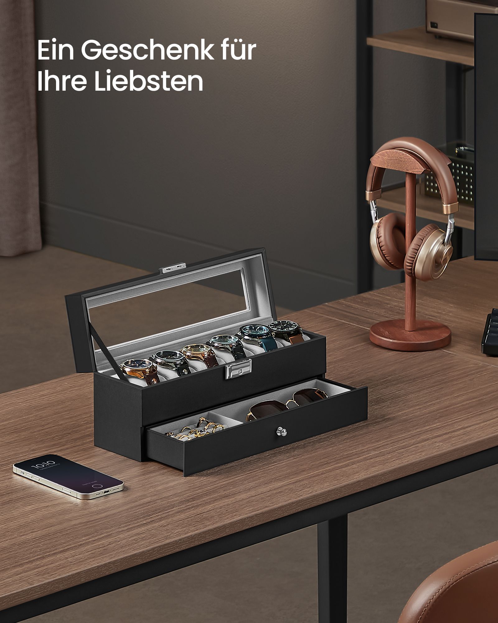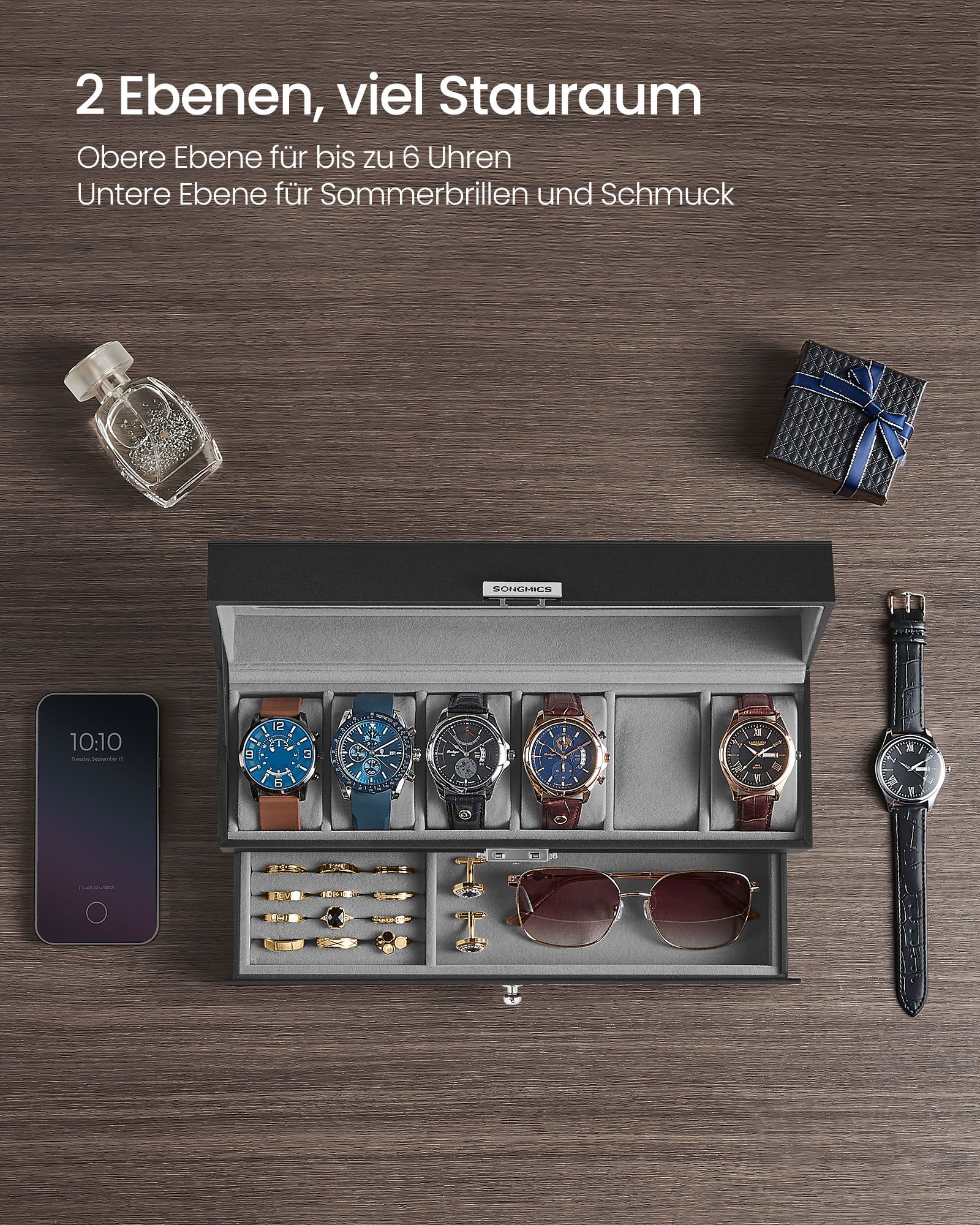 SONGMICS kellolaatikko, 2 tasoa, PU-päällyste ja harmaa sisävuori