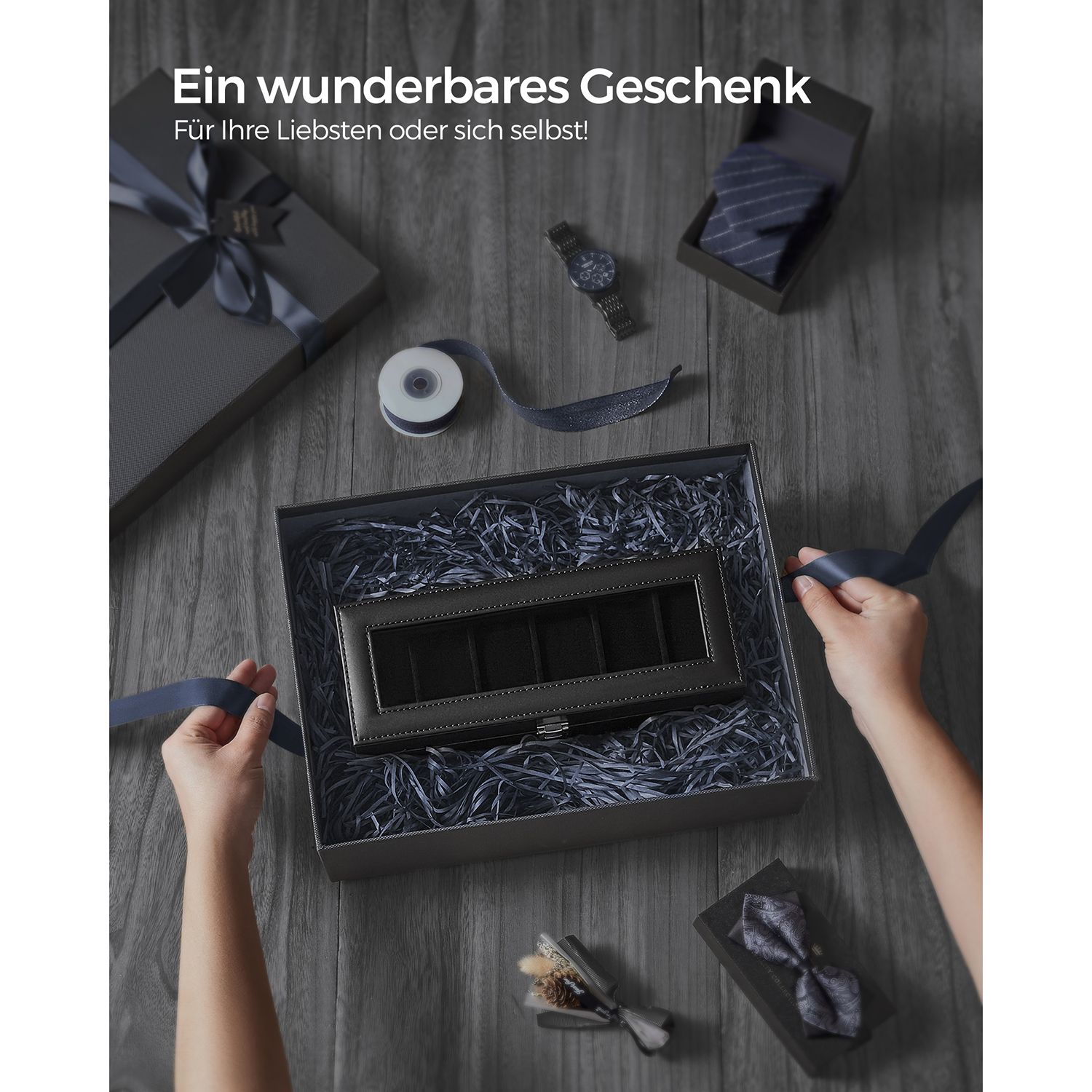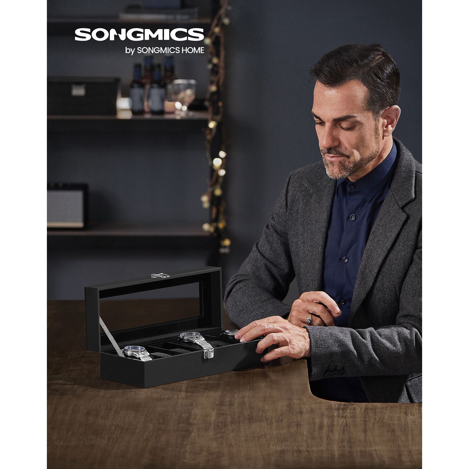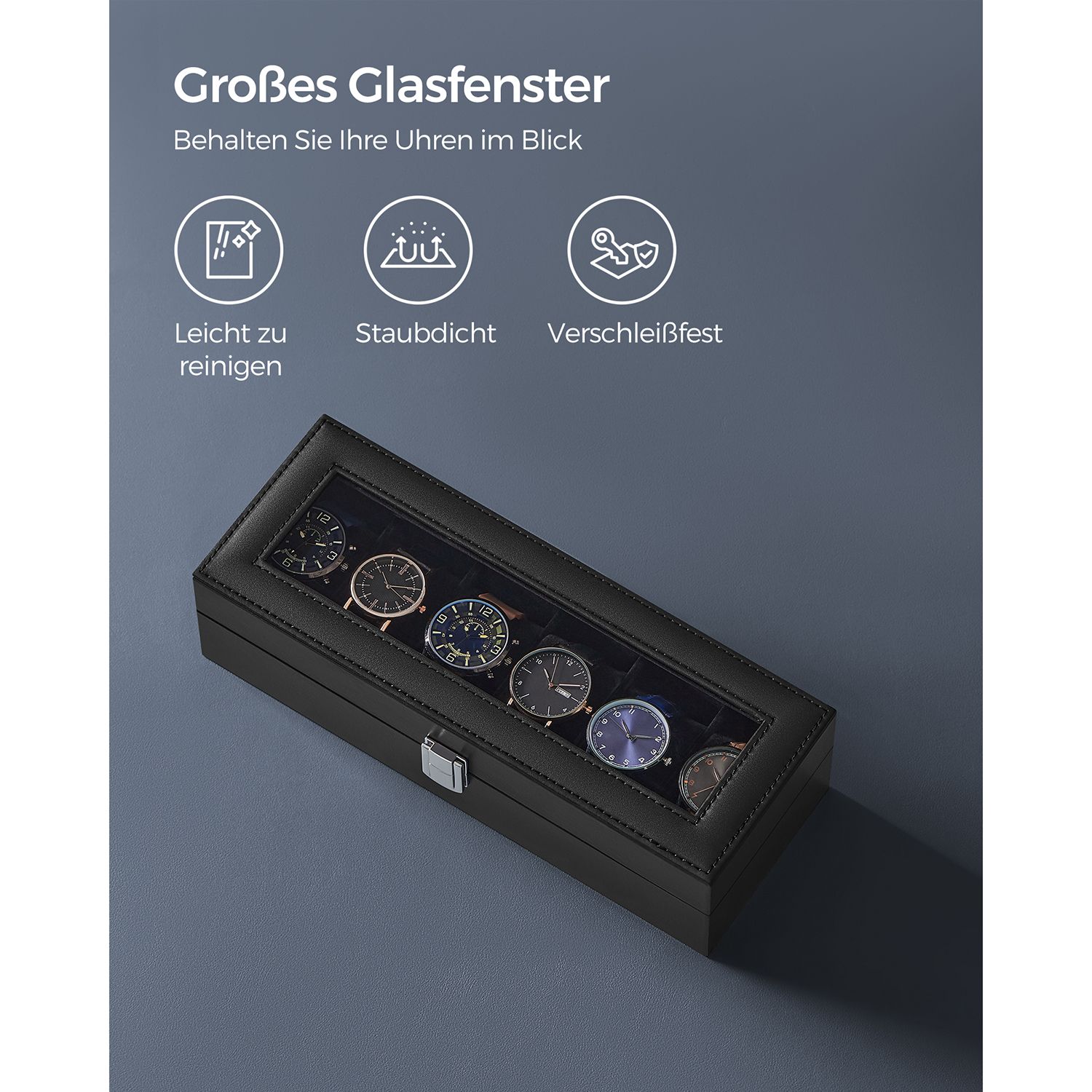 SONGMICS kellolaatikko 6 kellolle, kellolaatikko lasikannella, samettiset kellotyynyt, kellokotelo lukolla, 30 x 11,2 x 8 cm, musta JWB06BK