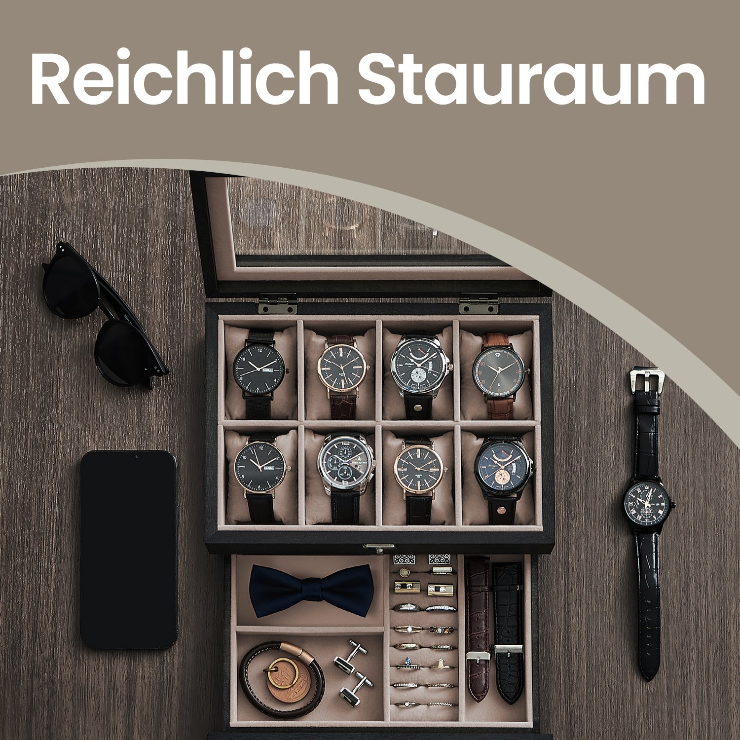 Kellolaatikko, 8 lokeroa, massiivipuinen kellolaatikko, lasikansi, kellotyynyt, korujen säilytys, eebenpuunmusta