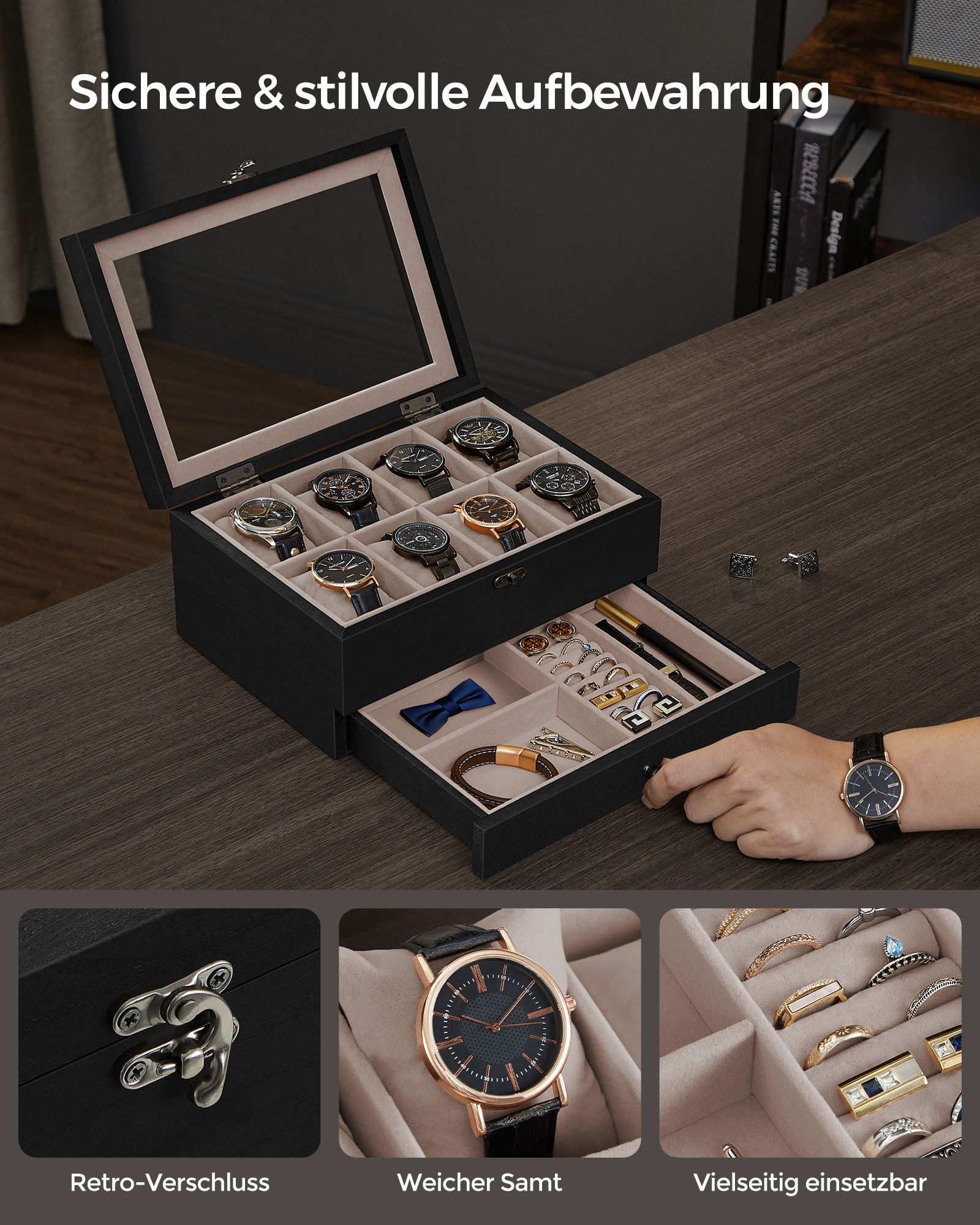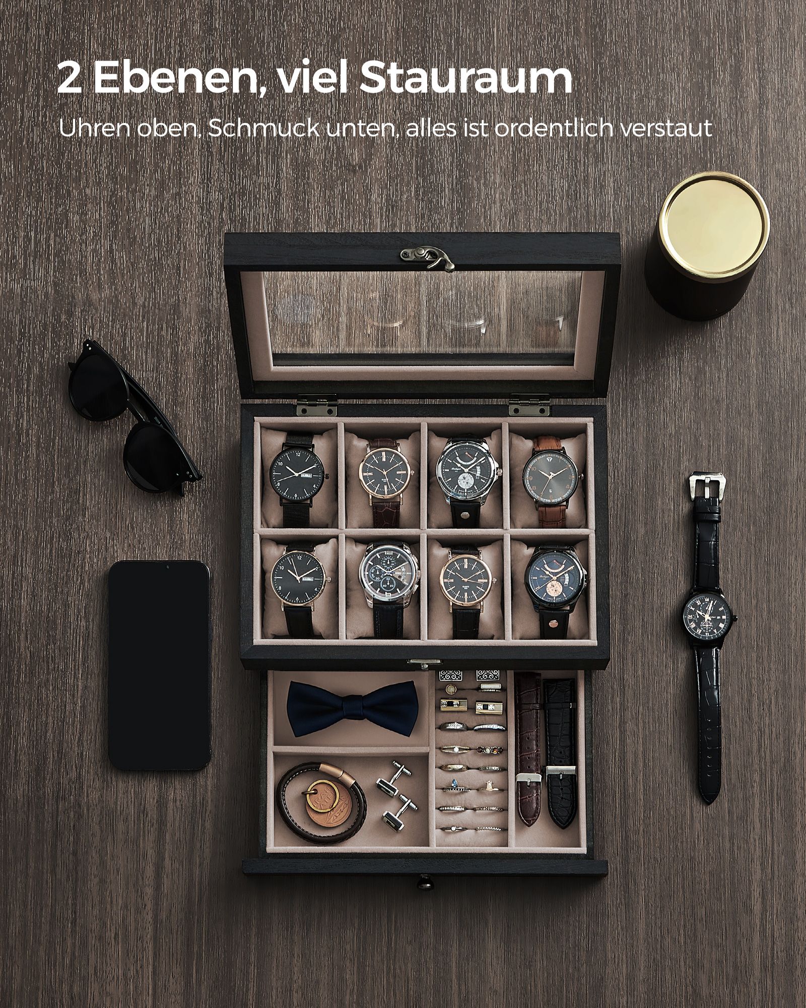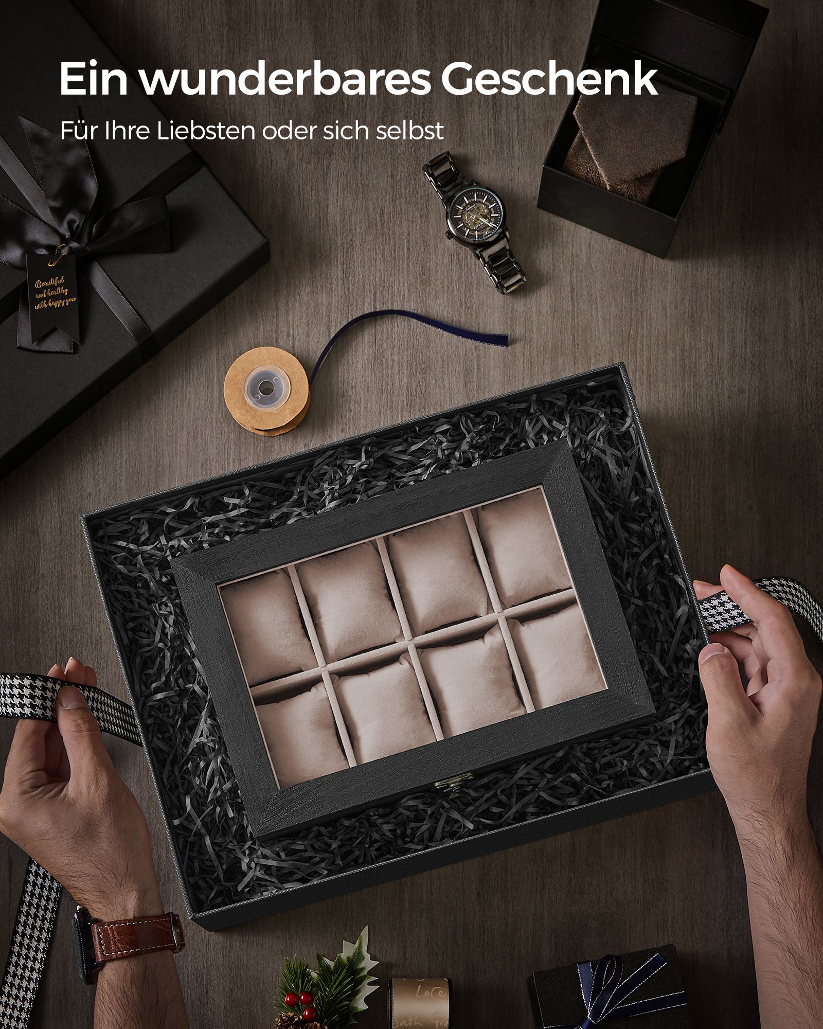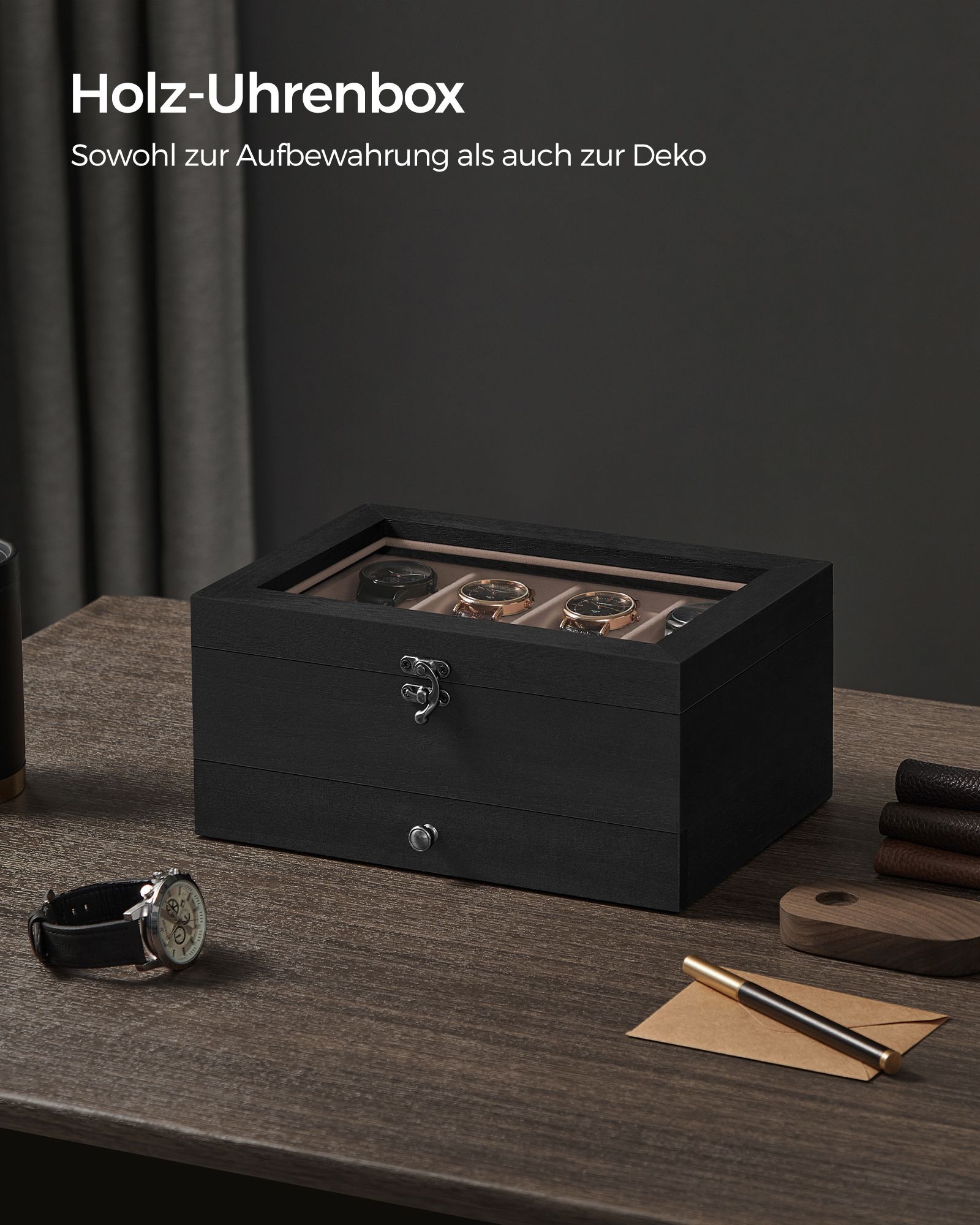 SONGMICS kellolaatikko, 8 lokeroa, massiivipuuta, musta