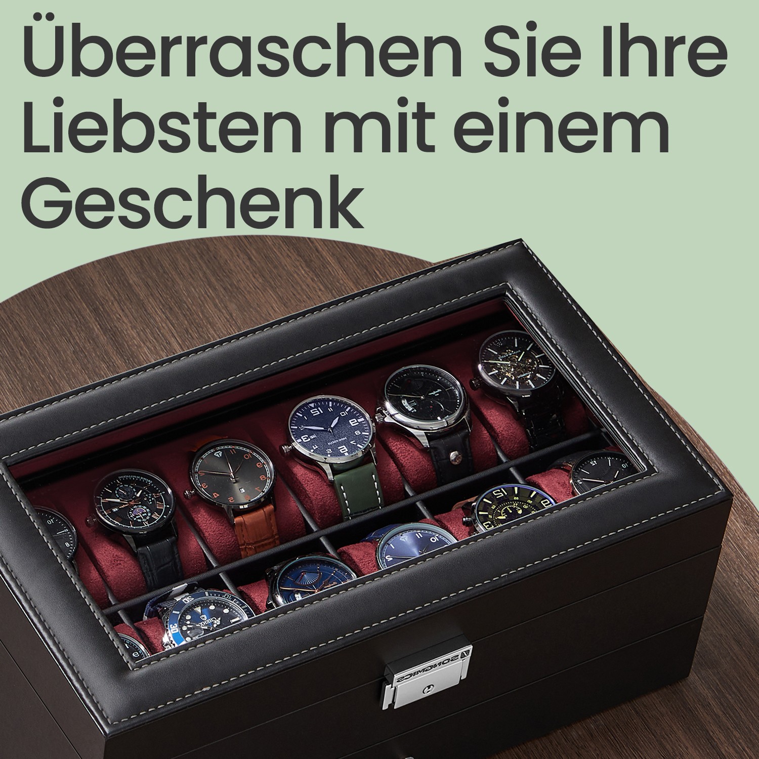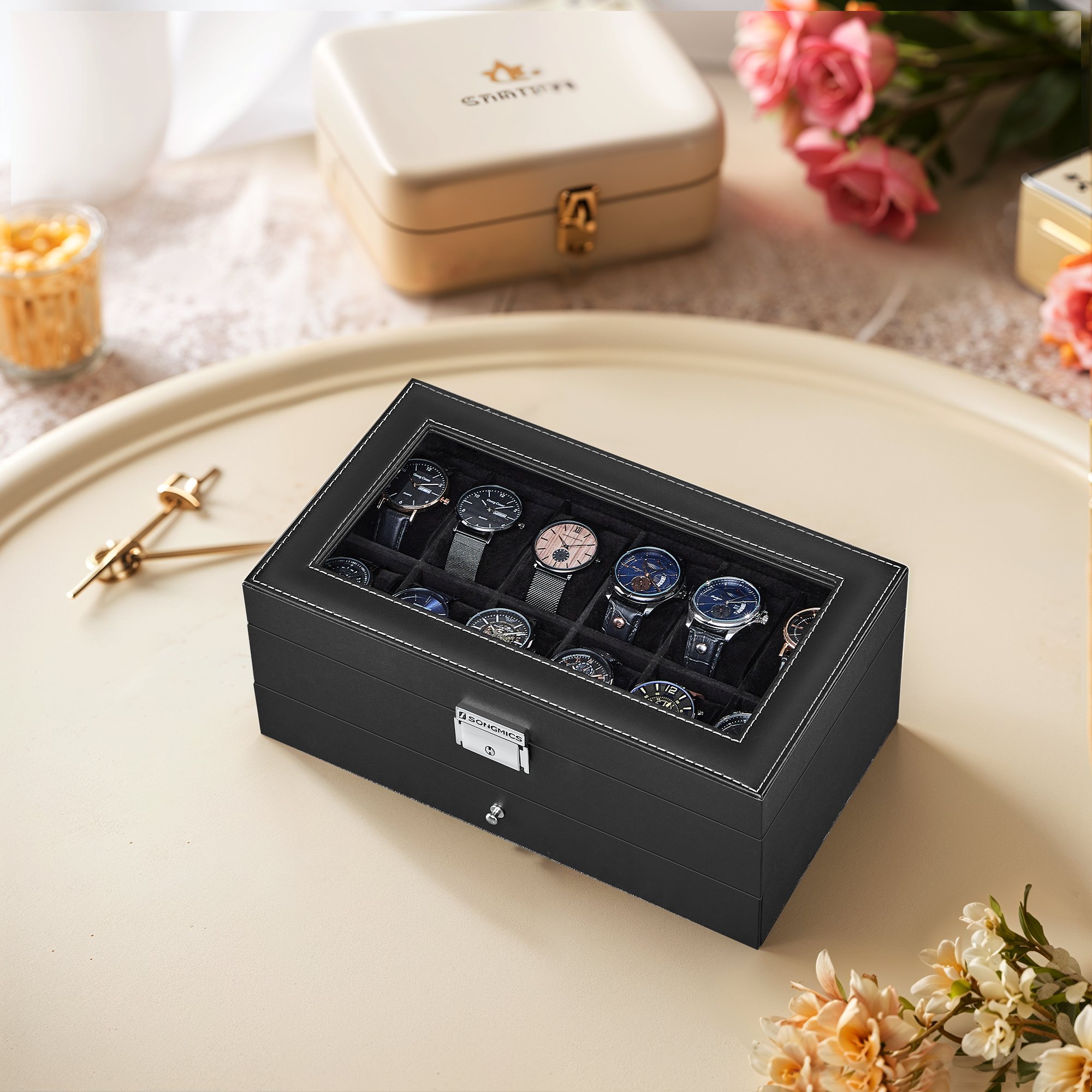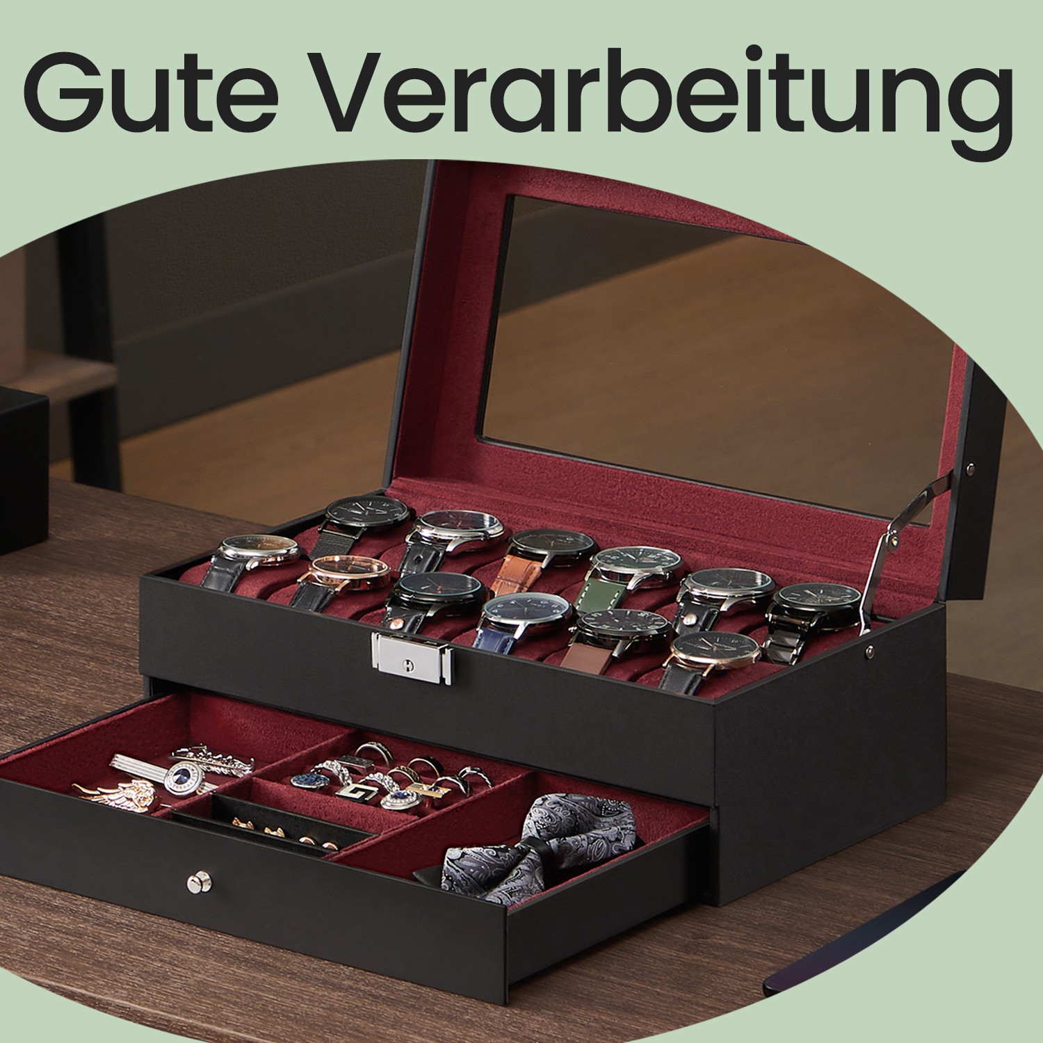 Kellolaatikko, kellokotelo lasikannella, 2 tasoa, 12 kellolle, lukittava, 1 laatikko, sormuksille, rannekoruille, ruskea PU-päällinen, ruskea sisävuori