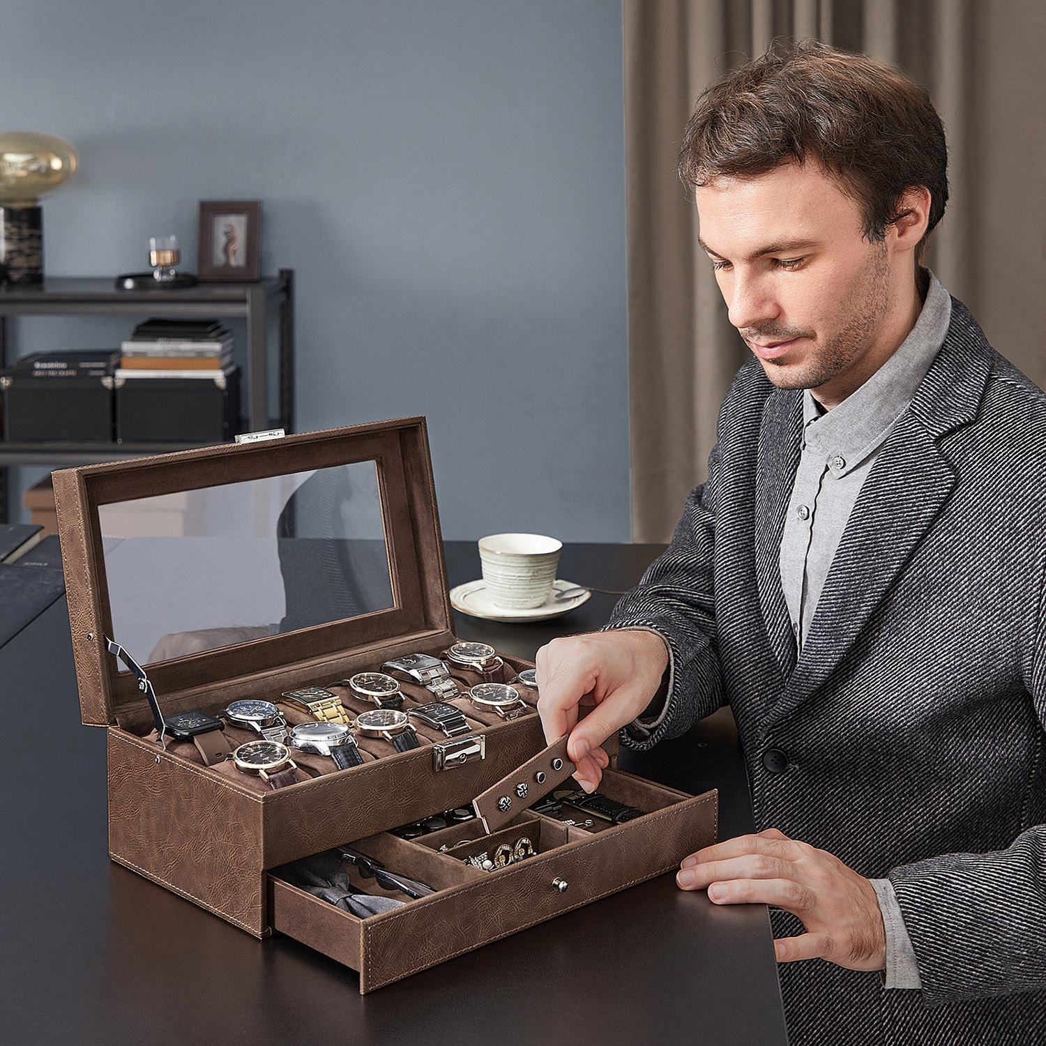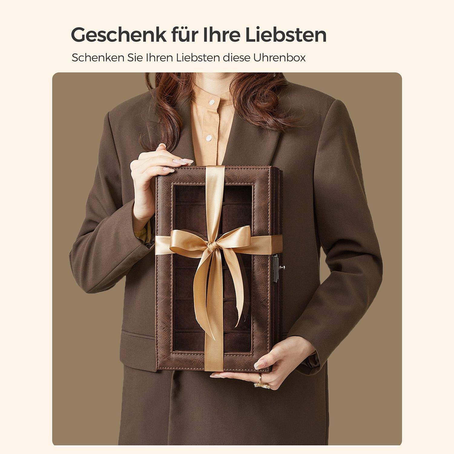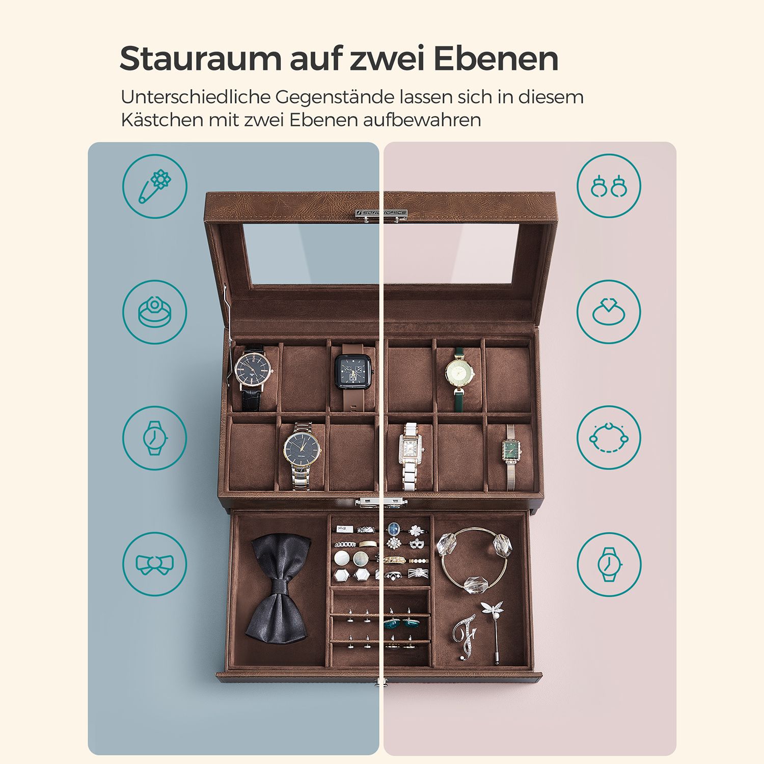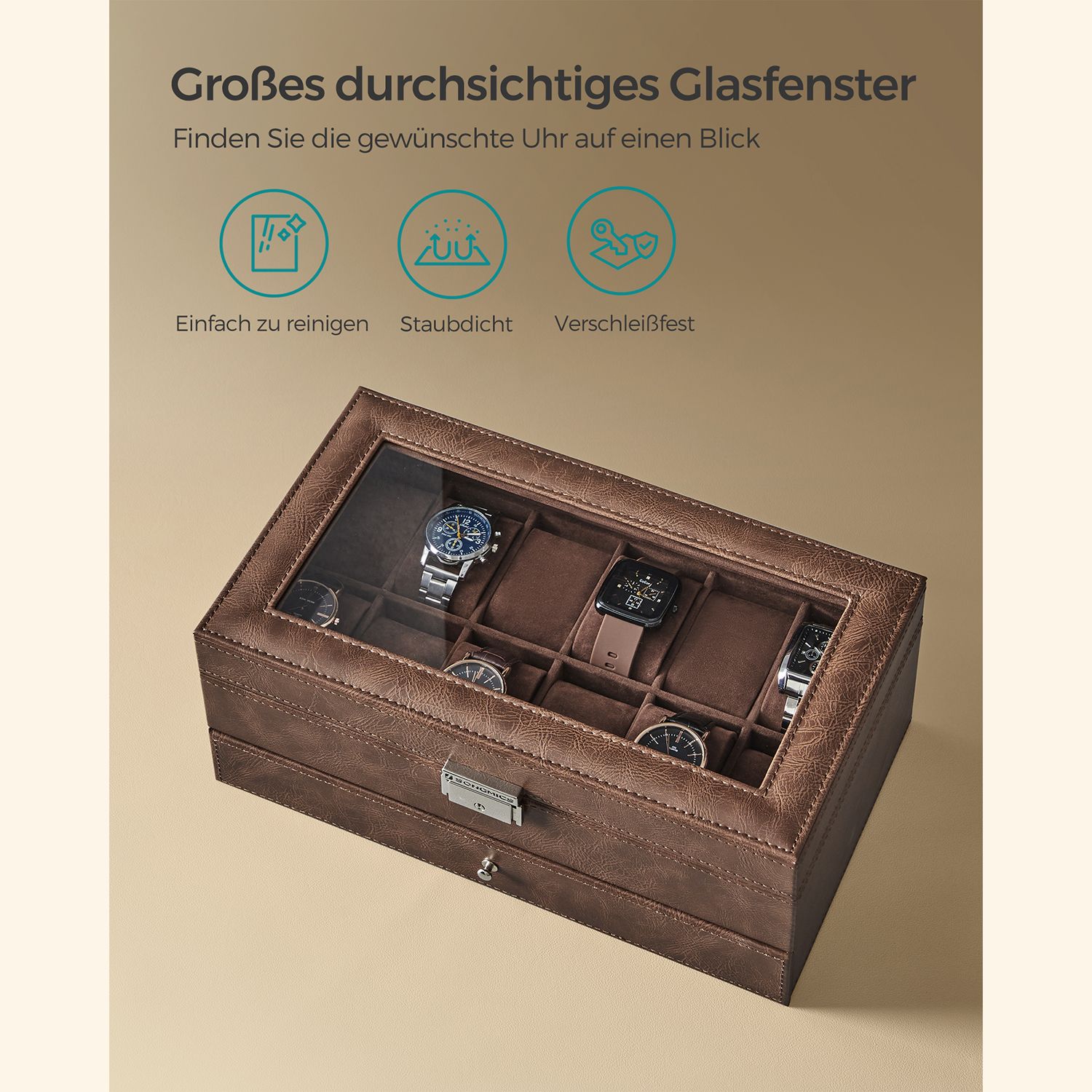 Arvokas kellokokoelmasi ansaitsee korkealaatuisen kellolaatikon. Tämä SONGMICS-kellolaatikko on ihanteellinen valinta kaikille, joilla on paljon rannekelloja. Tämän klassisen 2-tasoisen kellolaatikon edut yhdellä silmäyksellä: – Kellotyynyillä: Kellotyynyt ovat pehmeitä ja tukevia ja tukevat kelloja hyvin, jotta ne pysyvät muodossaan. – Tilava: Yläkerroksen 12 lokeroon mahtuu erilaisia rannekelloja. Alakerrassa voi säilyttää kalvosinnappeja, sormuksia, silmälaseja ja kaulakoruja. – Ihanteellinen lahjaidea: Kellolaatikko sopii lahjaksi hääpäivänä tai valmistumisen kunniaksi. – Metallilukko: Metallilukko on helppo avata yhdellä kädellä, mikä on erittäin käytännöllistä. – Mukana 2 avainta: Yläosan lukko ja 2 mukana toimitettua avainta suojaavat kelloja vieraiden käsiltä. Tuotetiedot: – Väri: ruskea PU-päällinen, ruskea sisävuori – Materiaali: MDF (keskitiheä kuitulevy), PU, sametti, lasi – Koko: 19,5 x 33 x 14 cm (S x L x K) – Paino: 2,2 kg Toimitus sisältää: – 1 x kellolaatikko – 2 x avainta SONGMICS-ohjeet: – Suojaa tuote kosteudelta. – Jos tuotteen pinnalla on pölyä käytön jälkeen, pyyhi pinta pehmeällä liinalla.