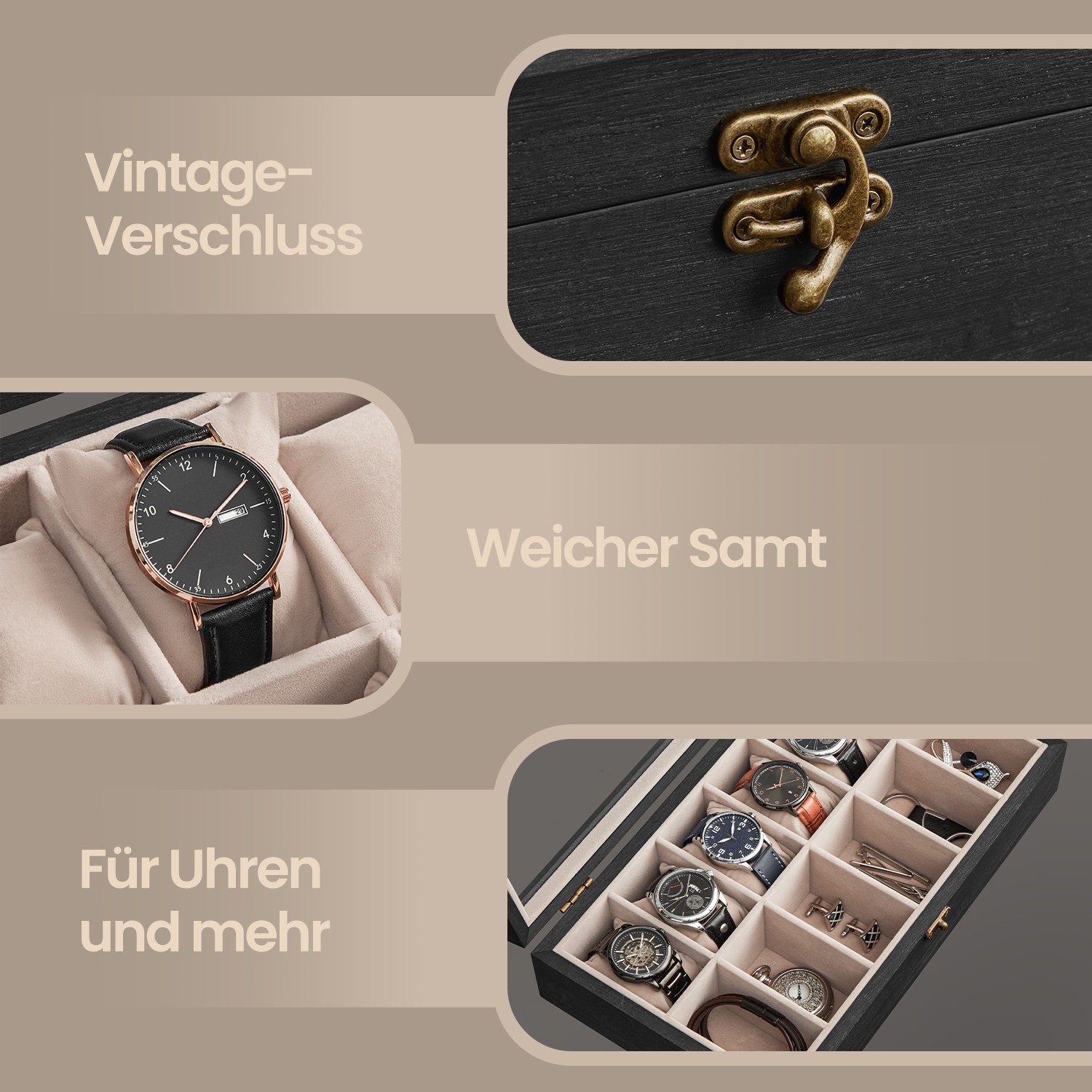 Kellolaatikko, 6 lokeroa, massiivipuinen kellokotelo, lasikansi, kellotyyny, lahja rakkaillesi, pähkinänvärinen