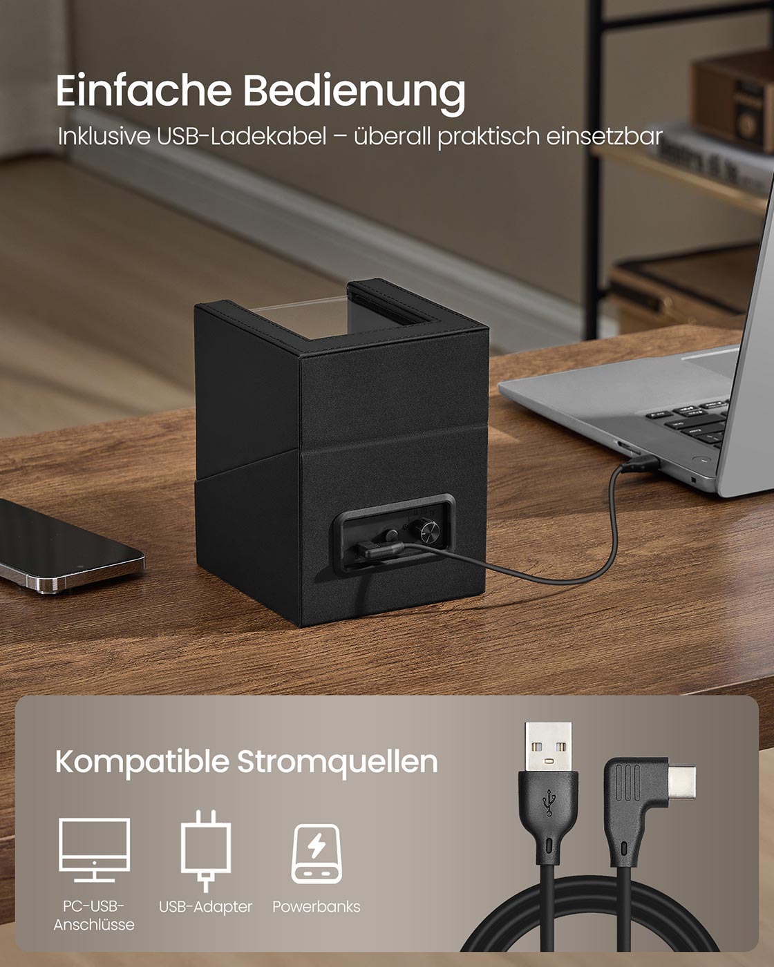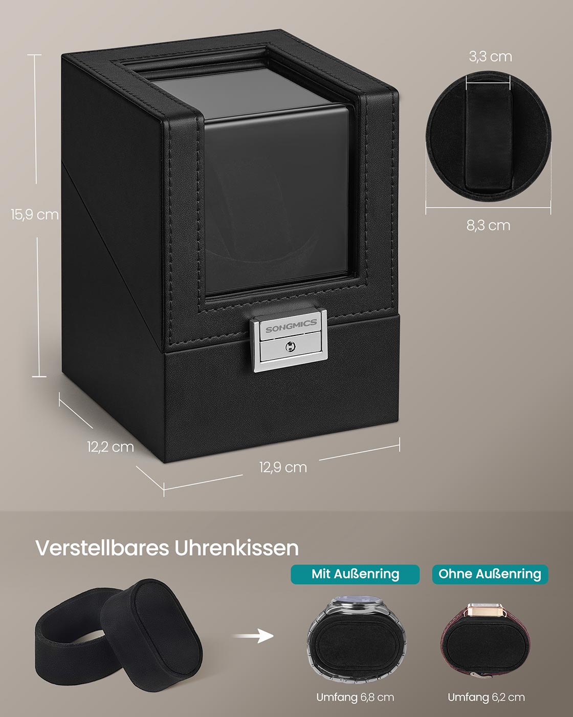 SONGMICS kellonpyörittäjä, automaattinen kellonpyörittäjä 1 kello, kellolaatikko, premium-moottori, LED-valo, säädettävä kellotyyny, lukko, 4 pyörimistilaa, USB-C-latauskaapeli, musta JWB030B01