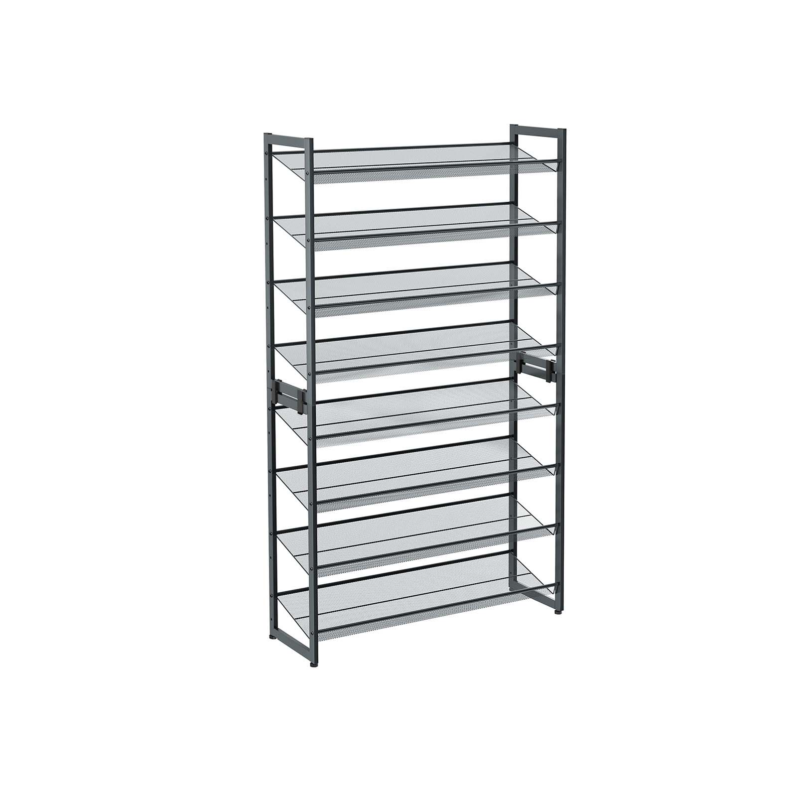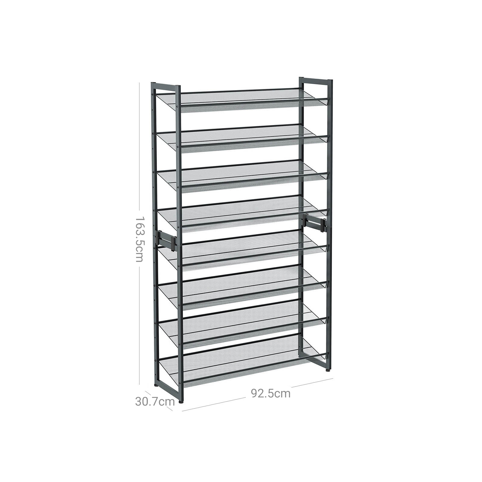 Tuotetiedot: Väri: Harmaa Materiaali: Rauta Mitat: 92,5 x 30,7 x 163,5 cm (P x L x K) Paino: 10,7 kg Maks. staattinen kantavuus hyllyä kohti: 10 kg Toimitus sisältää: 2 x 4-kerroksinen kenkähylly 4 x muoviliitin 1 x lisävarustepussi 1 x kaatumissuoja 1 x ohjeet (DE, EN, FR, ES, IT)SONGMICS Huomautukset:Kiinnitä tuote seinään mukana toimitetulla kaatumissuojalla turvallisuuden takaamiseksi käytön aikana.Jos et halua pinota hyllyjä päällekkäin, säilytä muoviset liitoskappaleet huolellisesti, jotta ne ovat helposti löydettävissä ja uudelleen käytettävissä myöhemmin.Tekstissä mainittu maks. kantavuus viittaa staattiseen maksimipainoon.