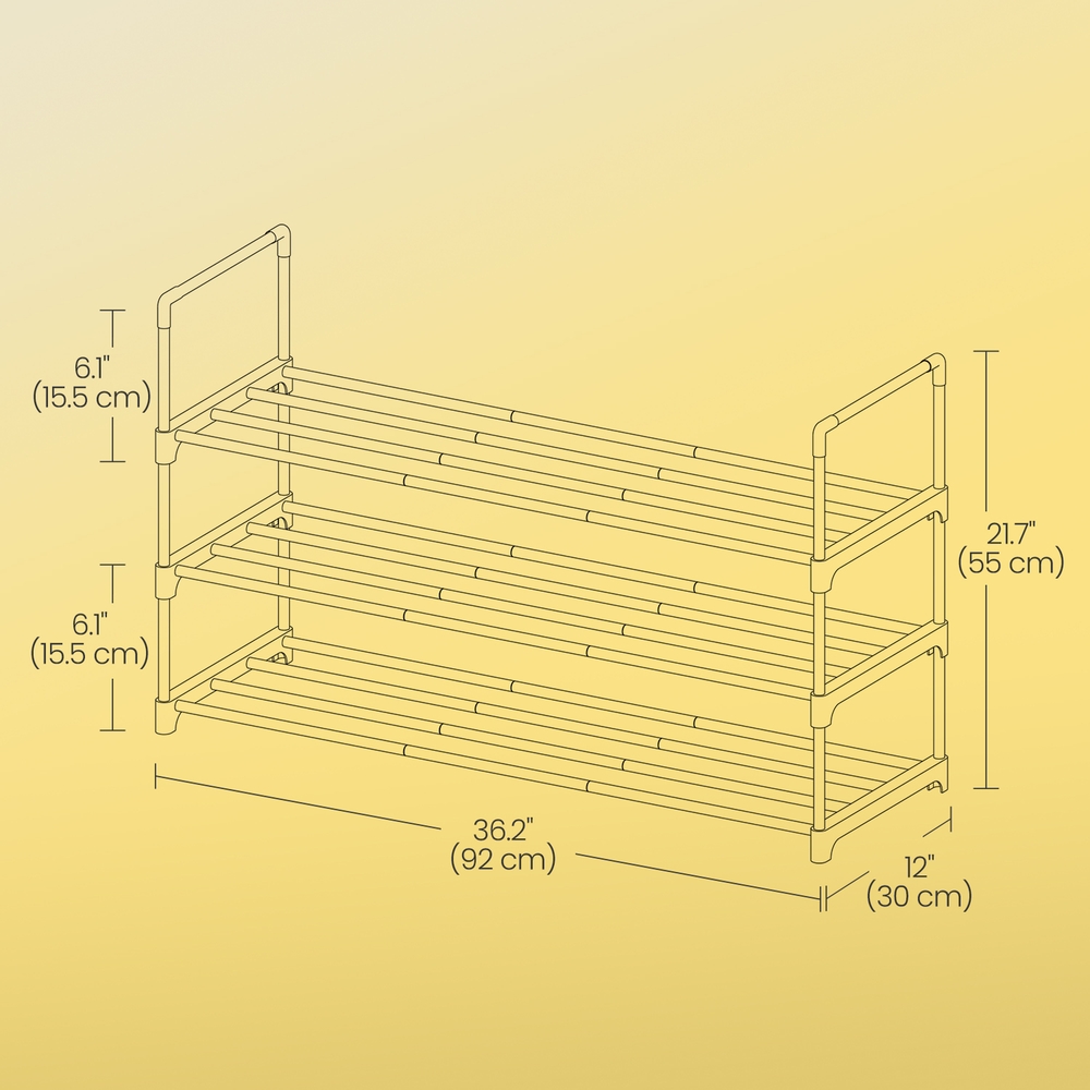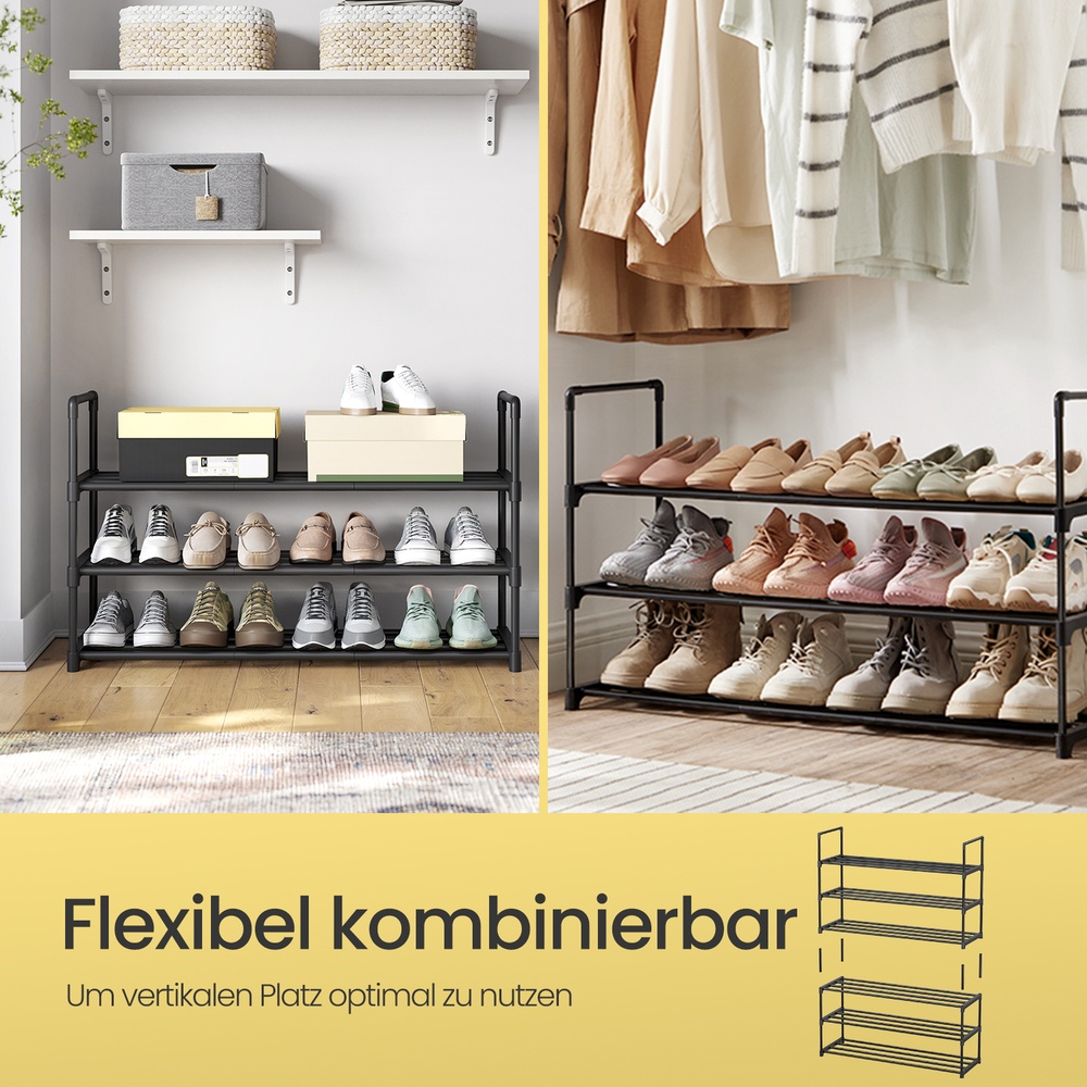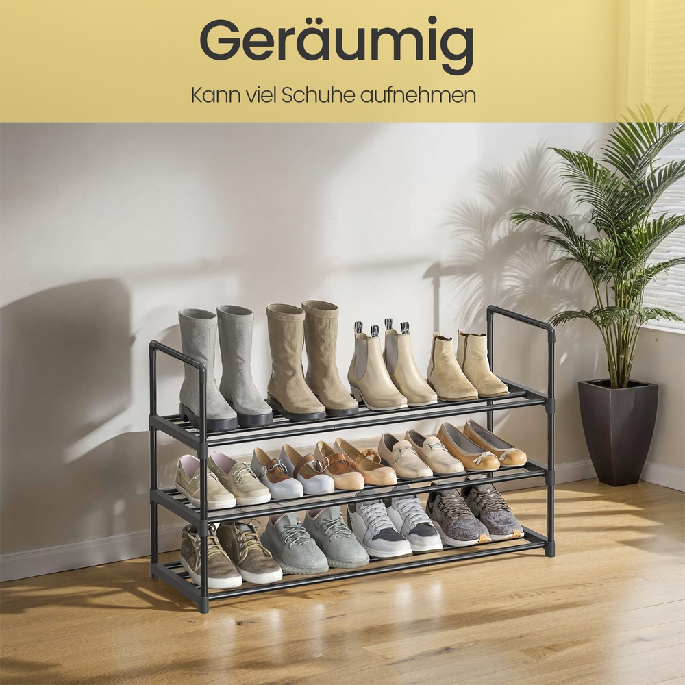 Tuhlaatko aikaa etsimällä oikeita kenkiä suuresta, sekavasta kenkäkasasta? Hyppeletkö yhdellä jalalla etsimässä toista kenkääsi ennen kuin lähdet kotoa? Tämä 3-tasoinen kenkäteline on apu, jota olet etsinyt! Pelasta kenkäsi sekamelskalta ja anna niille käytännöllinen säilytyspaikka. Tässä ovat tämän metallisen kenkätelineen edut: Korkea laatu: Metallirunko ja korkealaatuiset muoviliittimet antavat tälle kenkäsäilytysratkaisulle vankan ja vakaan rakenteen (jokainen hylly kestää jopa 5 kg:n painon). Suuri säilytystila: Voit maksimoida tilan säilytystilan sijoittamalla lenkkarit ja saappaat tähän kenkätelineeseen. Se mahtuu noin 12–15 paria kenkiä ja vie vain vähän tilaa lattialla. Yksinkertaisuus: Suoraviivaisella muotoilullaan tämä kenkäteline sopii täydellisesti huoneeseesi. Lisäksi pinottava muotoilu ja helppo asennus säästävät aikaa ja vaivaa. Tuotetiedot: – Väri: musta – Materiaali: metalliputket, muoviset liitoskappaleet – Koko: 92 x 30,5 x 55 cm (P x L x K) – Paino: 1,6 kg – Maks. staattinen kantavuus per taso: 5 kg Toimitus sisältää: – 1 x kenkähylly – 1 x ohjeet SONGMICS-ohjeet: – Turvallisuussyistä lapset eivät saa kiivetä tuotteelle tai leikkiä sillä.- Älä säädä hyllyä, kun se on täynnä.- Älä altista tuotetta suoralle auringonvalolle pitkäksi aikaa.- Älä liota tuotetta päivittäisessä puhdistuksessa. Jos tuotteessa on tahroja, pyyhi se kostealla liinalla.- Varmista, että kaikki putket on kiinnitetty muoviliittimien sisään kokonaan asennuksen jälkeen ja ennen käyttöä.
