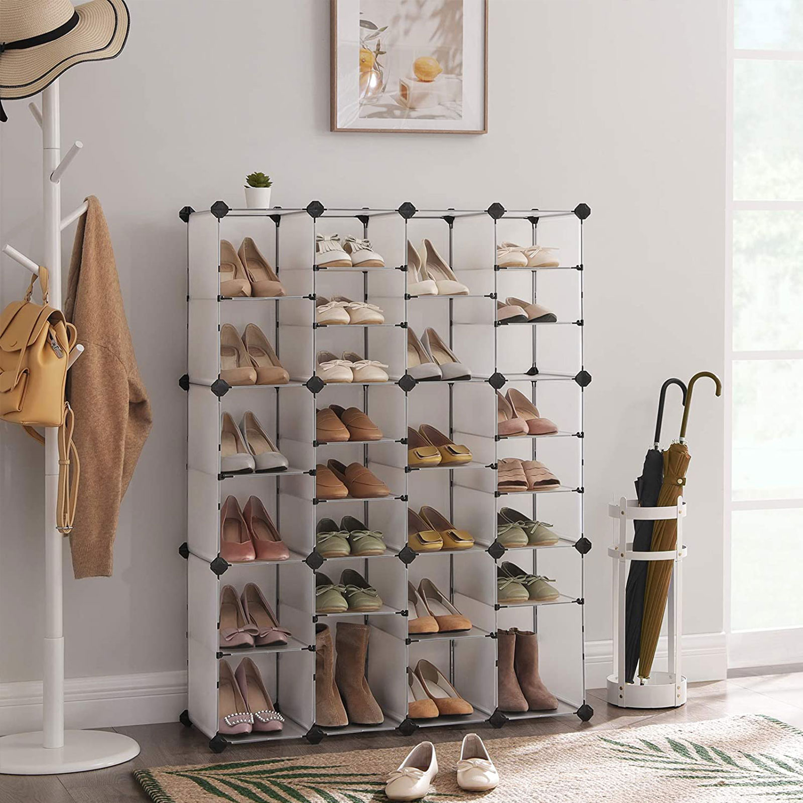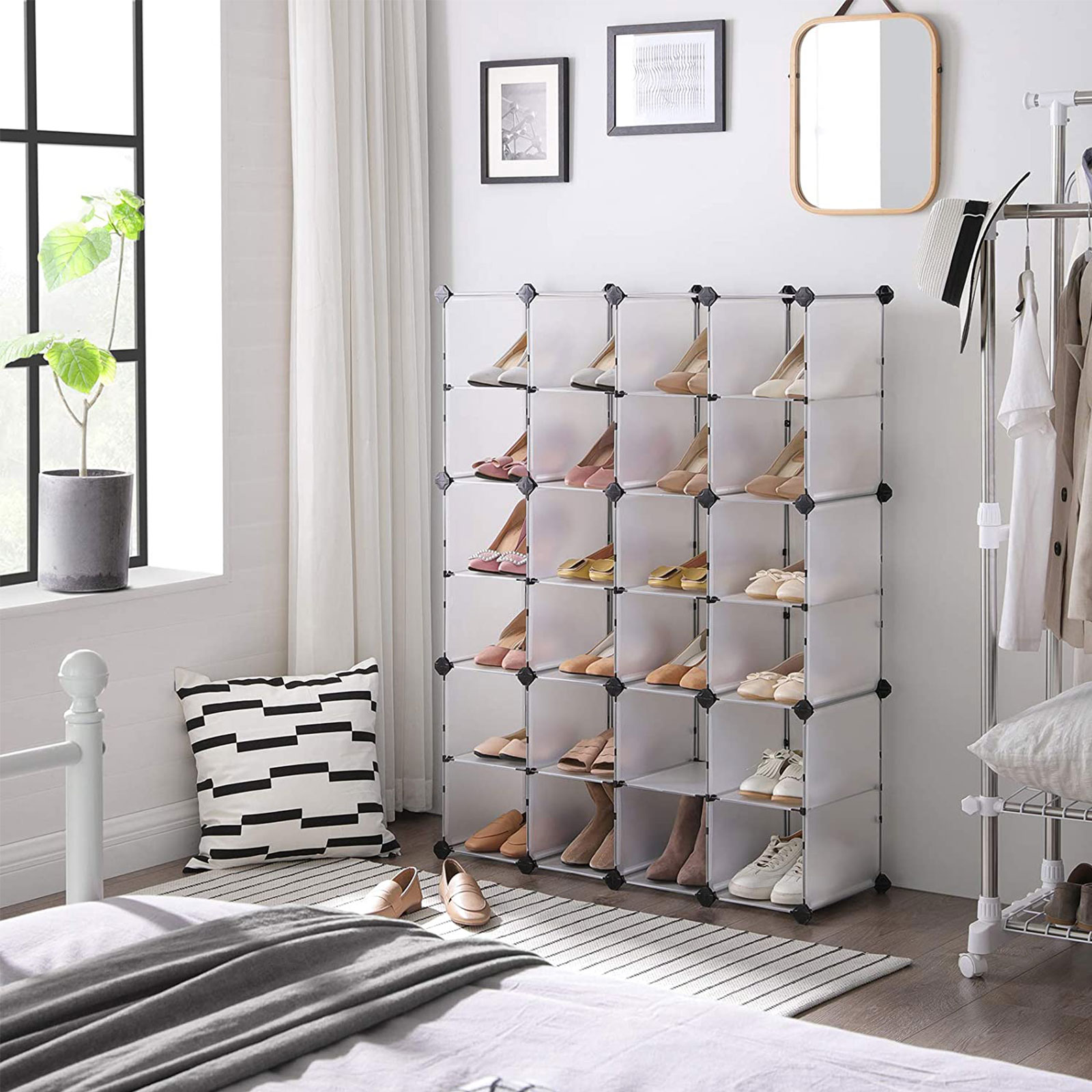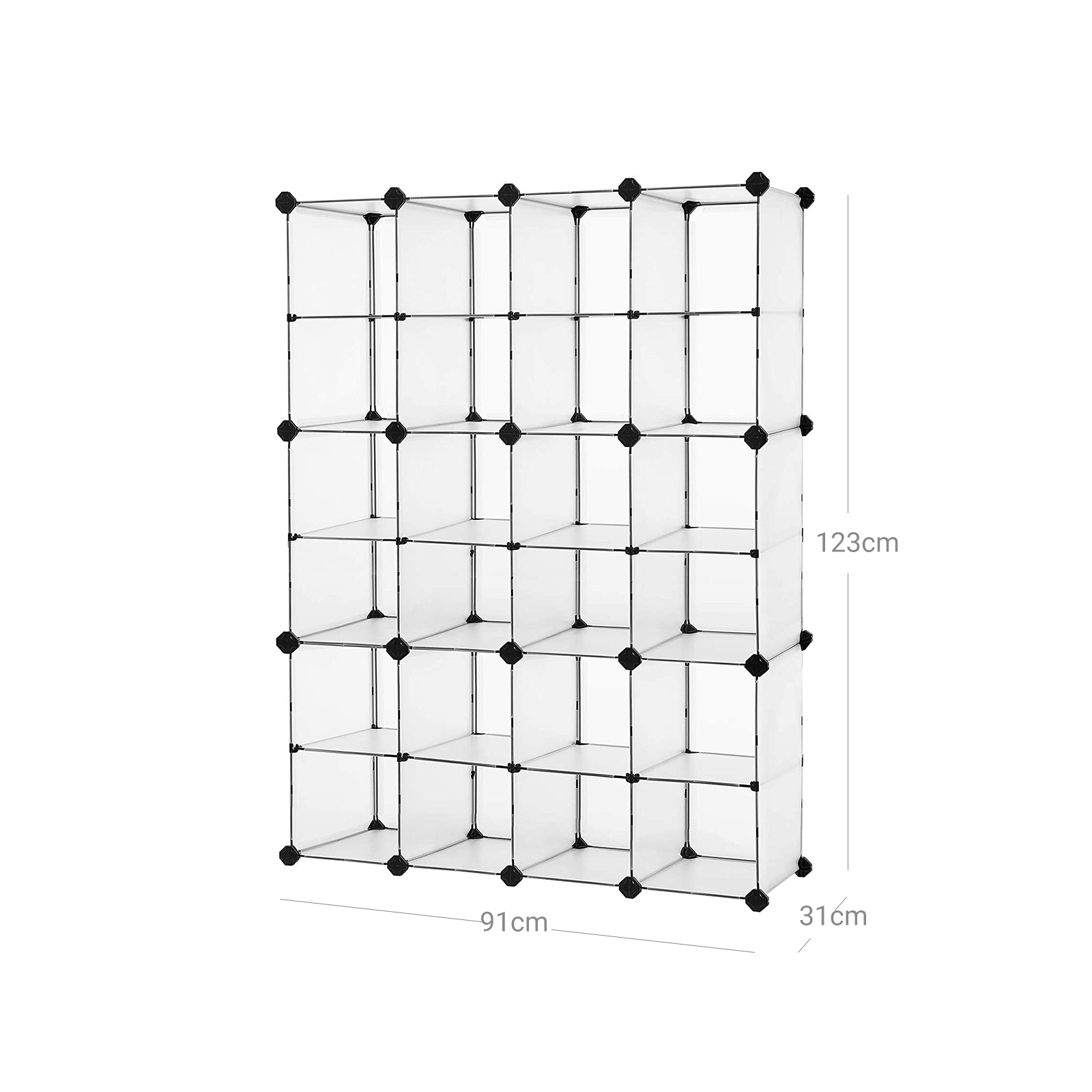 Tämän kenkähyllyn kohokohdat: – Muovilevyt on helppo puhdistaa. – Avoimet lokerot estävät epämiellyttävien hajujen muodostumisen. – Säädettävät väliseinät; erikokoiset kengät – kuten saappaat, lenkkarit tai korkokengät – sopivat täydellisesti tähän hyllyyn. – 30 lokeroa; suuri kapasiteetti; sopii vähintään 30 parille kenkiä.- Mukana toimitettu kaatumissuoja tarjoaa lisä turvallisuutta. – Auttaa sinua säilyttämään kenkiä eteisessä tai vaatteita ja leluja makuuhuoneessa. Tuotetiedot: – Väri: puoliläpinäkyvä valkoinen – Materiaali: PP-muovilevyt, metallilankakehys, ABS-muoviliittimet – Koko: 91 x 31 x 123 cm (P x L x K) – Koon koko (4 eri kokoa): 22 x 30 x 13,3 cm (P x L x K) 22 x 30 x 20 cm (P x L x K) 22 x 30 x 26,6 cm (P x L x K) 22 x 30 x 40 cm (P x L x K) – Paino: 8,7 kg – Maks. staattinen kantavuus lokeroa kohti: 10 kg – Maks. staattinen kantavuus yhteensä: 80 kg Toimitus sisältää:- 15 x muovilevy (40 x 30 cm)- 12 x muovilevy (40 x 22 cm)- 34 x muovilevy (30 x 22 cm)- 40 x liitoskappale- 72 x yksittäinen koukku- 18 x kaksoiskoukku- 1 x kaatumissuoja- 1 x vasara- 1 x ohjeet (DE, FR, EN, ES, IT)SONGMICS Huomautukset:- Tuotteen suurin staattinen kantavuus on 80 kg. Älä ylitä tätä enimmäispainoa.- Kiinnitä tämä tuote seinään mukana toimitetulla kaatumissuojalla turvallisen käytön varmistamiseksi.- Kaikki tämän tuotteen asennukseen tarvittavat tarvikkeet sisältyvät toimitukseen.