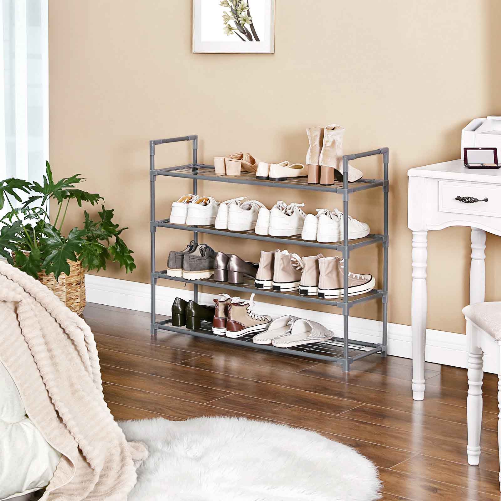 Jos sinulla on vain pieni budjetti sopivan kenkäkaapin hankkimiseen, tämä yksinkertainen mutta toimiva kenkähylly on sinulle kuin luotu. Neljä hyllyä riittää mainiosti kenkien säilytykseen, ja älä unohda, että hyllyn voi myös kääntää ylösalaisin, jolloin saat lisää säilytystilaa. Haluatko säilyttää saappaita? Ei hätää! Tämä kenkäorganisaattori on helppo koota ja säätää. Voit jättää yhden tai kaksi hyllyä pois asennuksen yhteydessä, jotta saat tilaa uusille saappaille! Mihin tämä kenkähylly kannattaa sijoittaa? Eteiseen – lisää mukavuutta Olohuoneeseen – lisää järjestystä Pukeutumishuoneeseen – lisää säilytystilaa Tuotetiedot: Väri: harmaa Materiaali: metalliputki, metalliritilälevy, muovinen liitoskappale Mitat: 91,5 x 28,5 x 76 cm (P x L x K) Hyllyjen välinen etäisyys: 20 cm Paino: 2,8 kg Hyllyn enimmäiskuormitus: 5 kg Hyllyn enimmäiskuormitus: 20 kg Toimitus sisältää: 1 x kenkähylly 1 x ohjeet (DE, EN, FR, ES, IT) SONGMICS-huomautukset:Tekstissä mainittu maks. kantavuus viittaa staattiseen maksimipainoon.