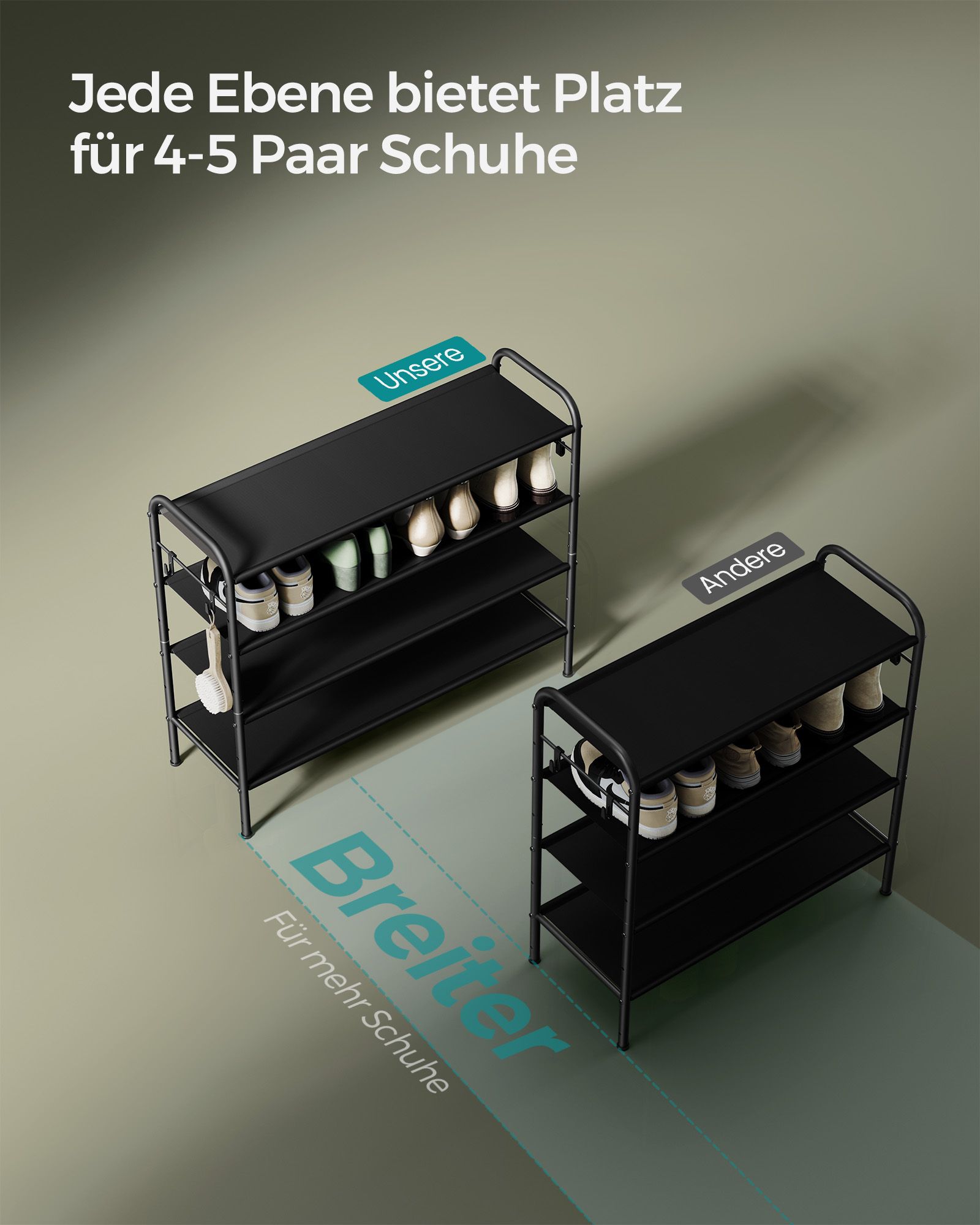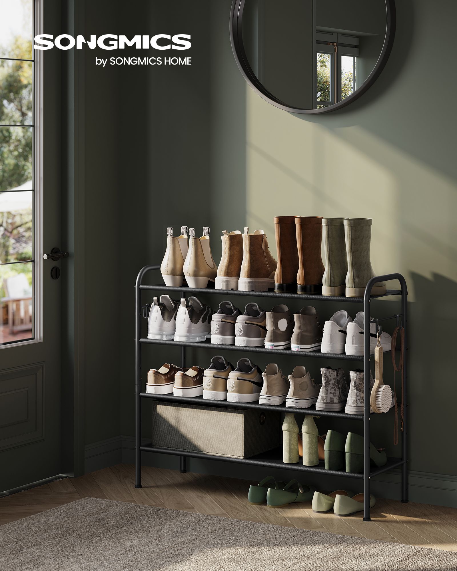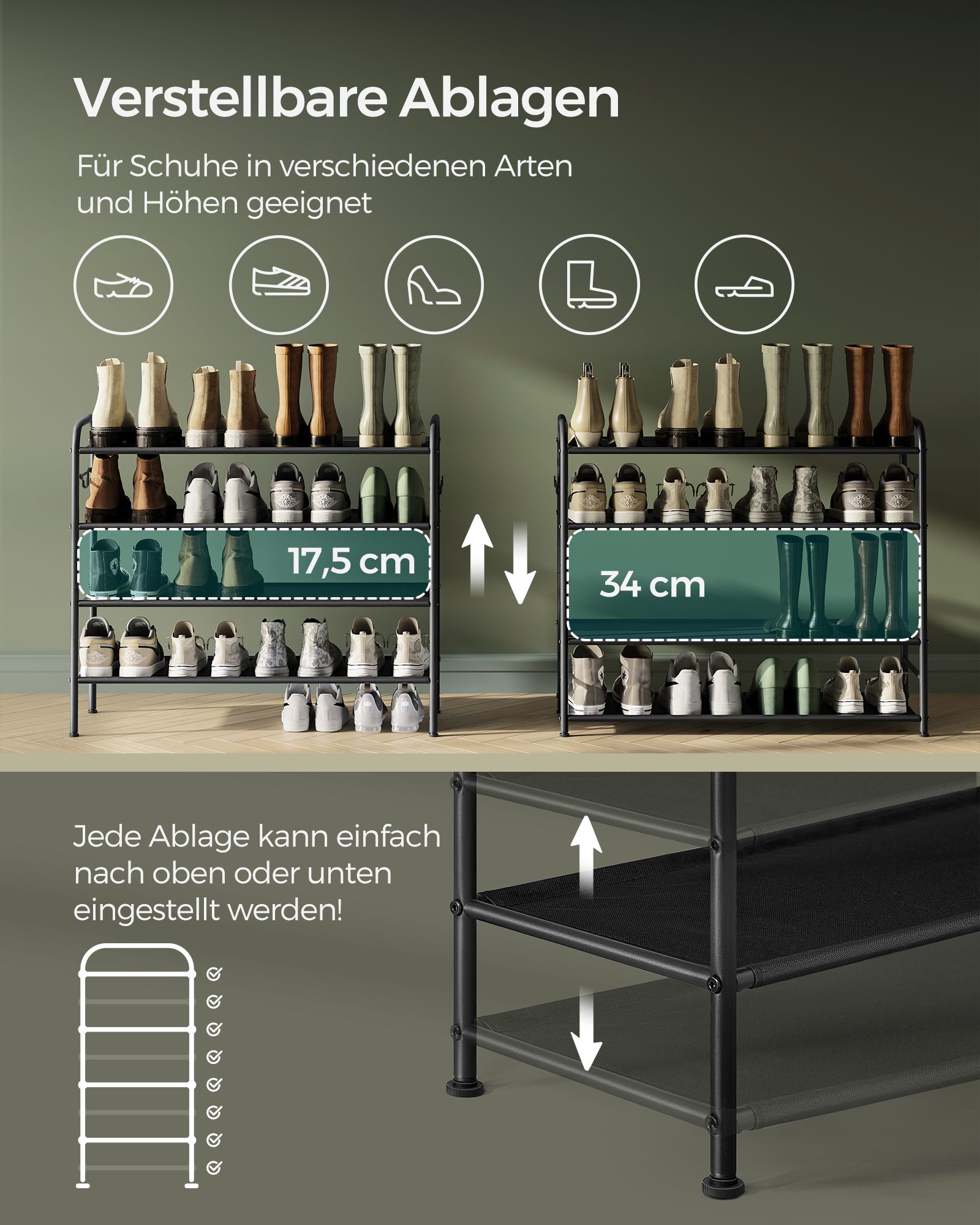 SONGMICS kenkähylly, kenkäteline, tasot, kangashylly, sivukoukut, korkeussäädettävä hylly, eteisen vaatekaappi, helppo asentaa