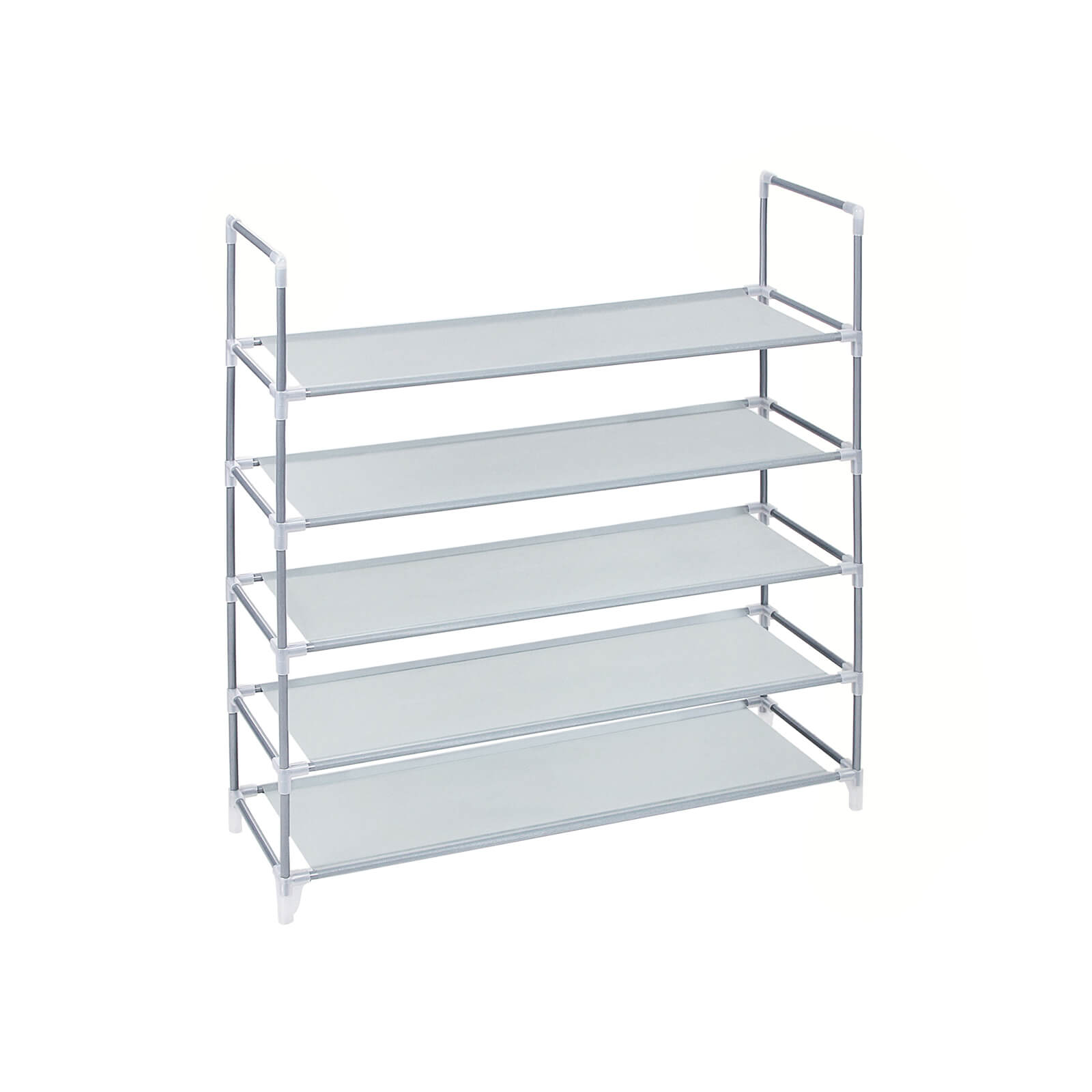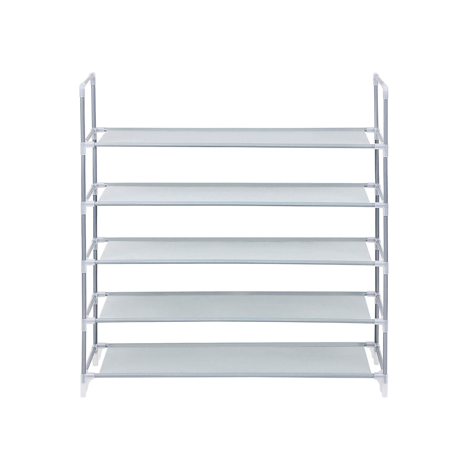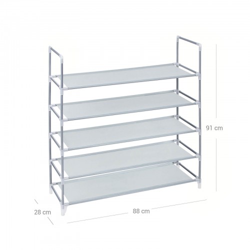 Käytännöllisen tyylikäs kenkähylly on kevyt mutta silti tukeva. Songmicsin hylly sopii minimalistisen kauneutensa ansiosta mihin tahansa sisustukseen! Viisitasoisella hyllyllä on tilaa 20 parille kenkiä, jotka voidaan säilyttää siististi kellarissa, lastenhuoneessa, eteisessä tai jopa ullakolla. Hylly on helppo koota ja purkaa. On huolehdittava siitä, että välitasojen päällystetty puoli on ylöspäin. Hyllytasot voidaan puhdistaa helposti kostealla liinalla. Tuotetiedot: Väri: harmaa Mitat: 88 x 91 x 28 cm (L x K x S) Kunkin tason korkeus: 17 cm Materiaali: Fleece-kangas (75 g/m²), teräsputki (Φ12 mm) Pakkauksen mitat: 85 x 14 x 8 cm Paino: 1,3 kg Toimitus sisältää: 1 x kenkähylly