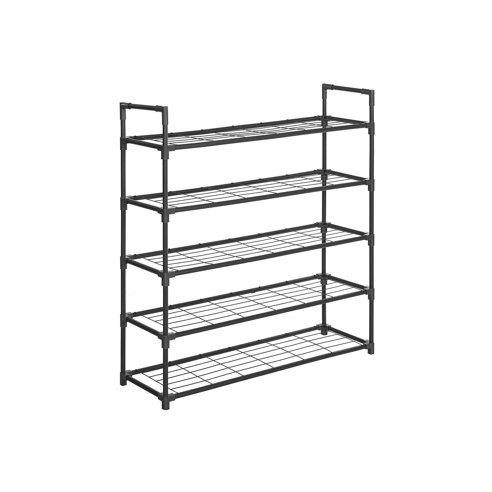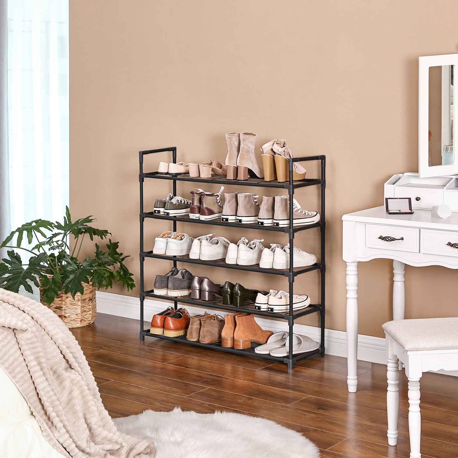 Jos sinulla on vain pieni budjetti sopivan kenkäkaapin hankkimiseen, tämä yksinkertainen mutta toimiva kenkähylly on sinulle kuin luotu. 5 hyllyä riittää mainiosti kenkien säilytykseen, ja älä unohda, että hyllyn voi myös kääntää ylösalaisin, jolloin saat lisää säilytystilaa. Haluatko säilyttää saappaita? Ei hätää! Tämä kenkähylly on helppo koota ja säätää. Voit jättää yhden tai kaksi hyllyä pois asennuksen yhteydessä, jotta saat tilaa uusille saappaille! Mihin tämä kenkähylly kannattaa sijoittaa? Eteiseen – lisää mukavuutta Olohuoneeseen – lisää järjestystä Pukeutumishuoneeseen – lisää säilytystilaa Tuotetiedot: Väri: musta Materiaali: metalliputki, metalliritilälevy, muovinen liitoskappale Mitat: 91,5 x 28,5 x 96 cm (P x L x K) Hyllyjen välinen etäisyys: 20 cm Paino: 3,5 kg Hyllyn enimmäiskuormitus: 5 kg Hyllyn enimmäiskuormitus: 25 kg Toimitus sisältää: 1 x kenkähylly 1 x ohjeet (DE, EN, FR, ES, IT) SONGMICS-huomautukset:Tekstissä mainittu maks. kantavuus viittaa staattiseen maksimipainoon.