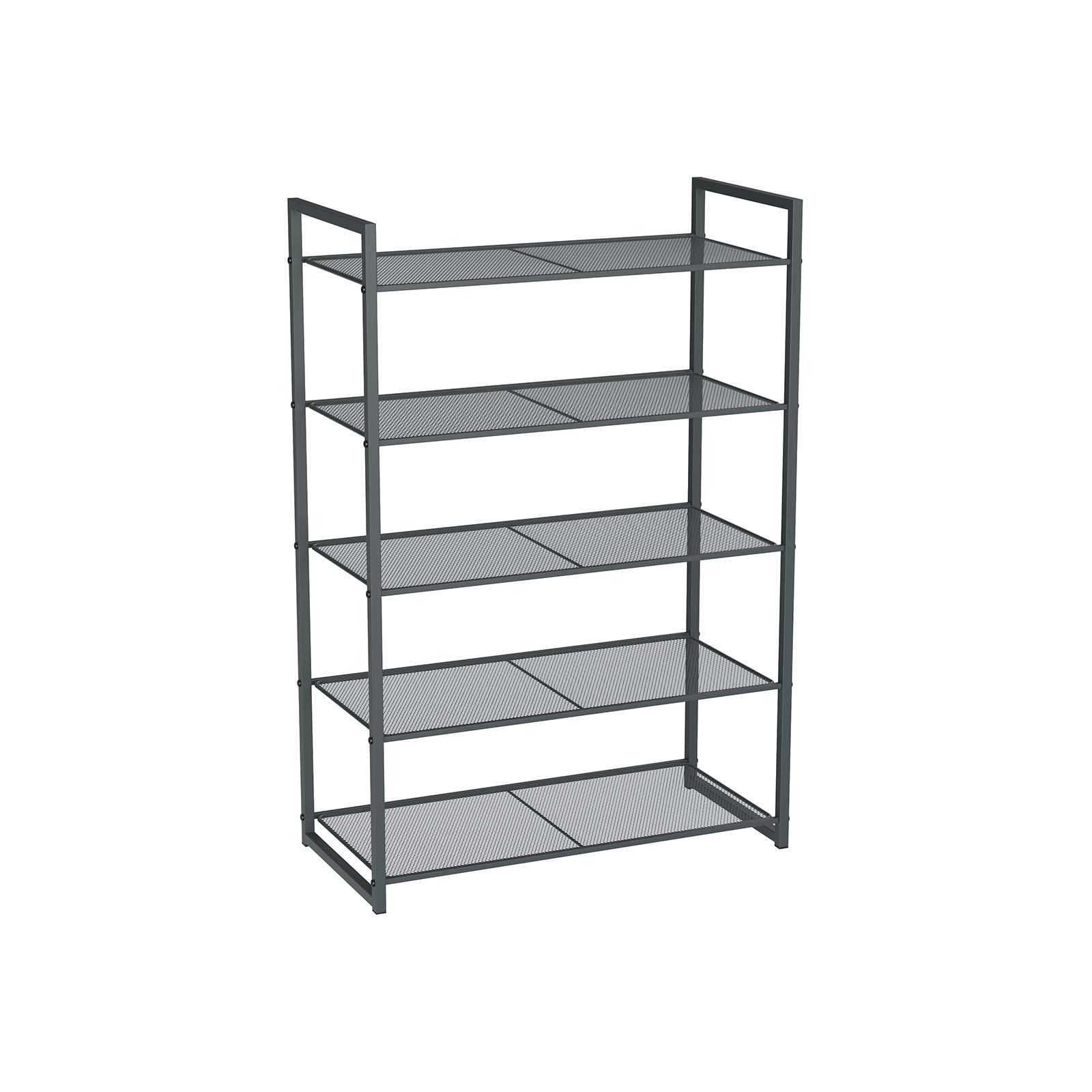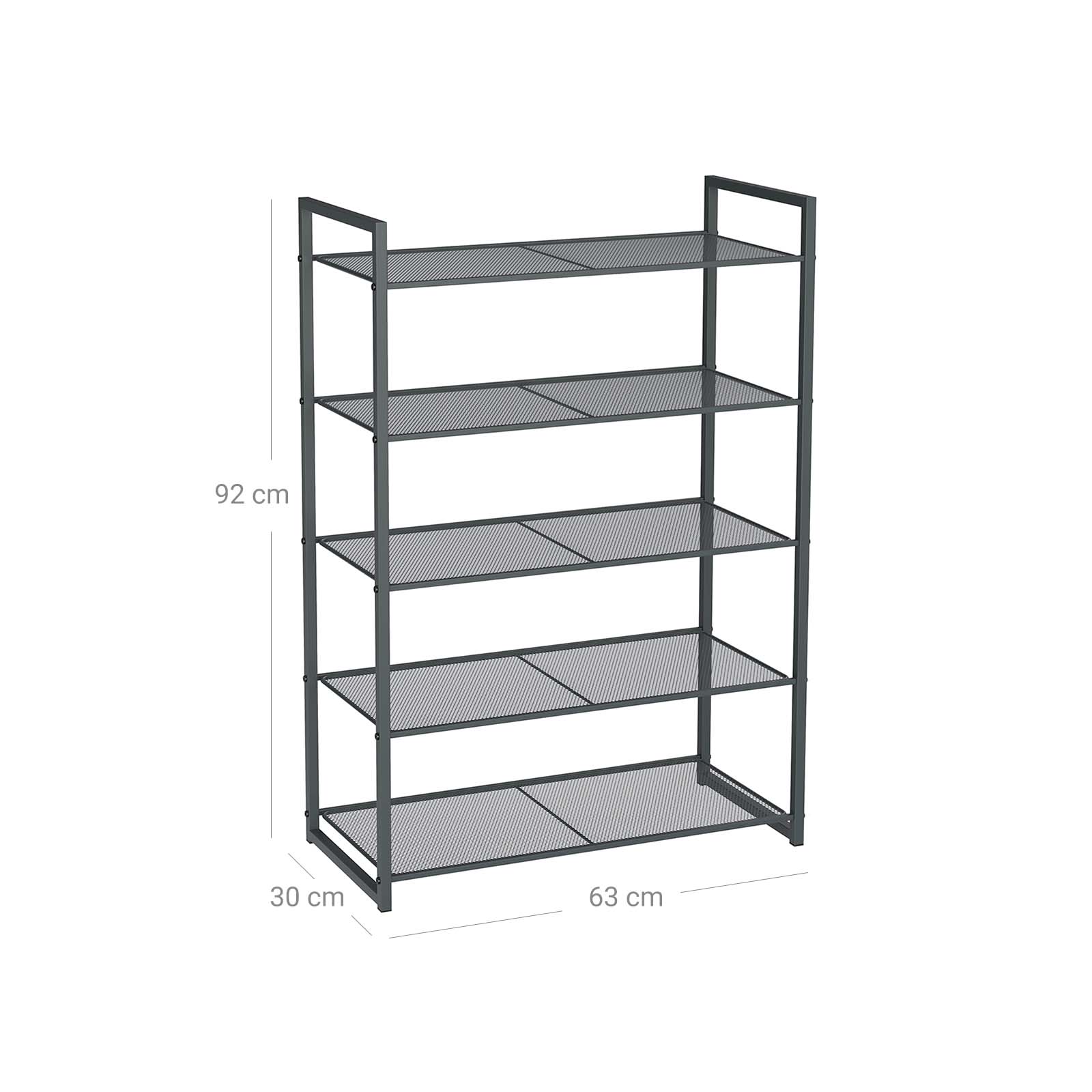 Ominaisuudet: Väri: Antrasiitinharmaa Materiaali: Rauta Tuotteen mitat: 63 x 30 x 92 cm (P x L x K) Paino: 3,7 kg Maksimikantavuus tasoa kohti: 10 kg Toimitus: 1 x Kenkähylly 1 x Asennussarja 1 x Asennusohjeet (FR, EN, DE, ES, IT) SONGMICS:n varotoimet: Turvallisuussyistä asenna kaatumisenestokit, jos pinot useita hyllyjä päällekkäin. Kaikki mainitut kantavuudet viittaavat suurimpaan staattiseen kantavuuteen.