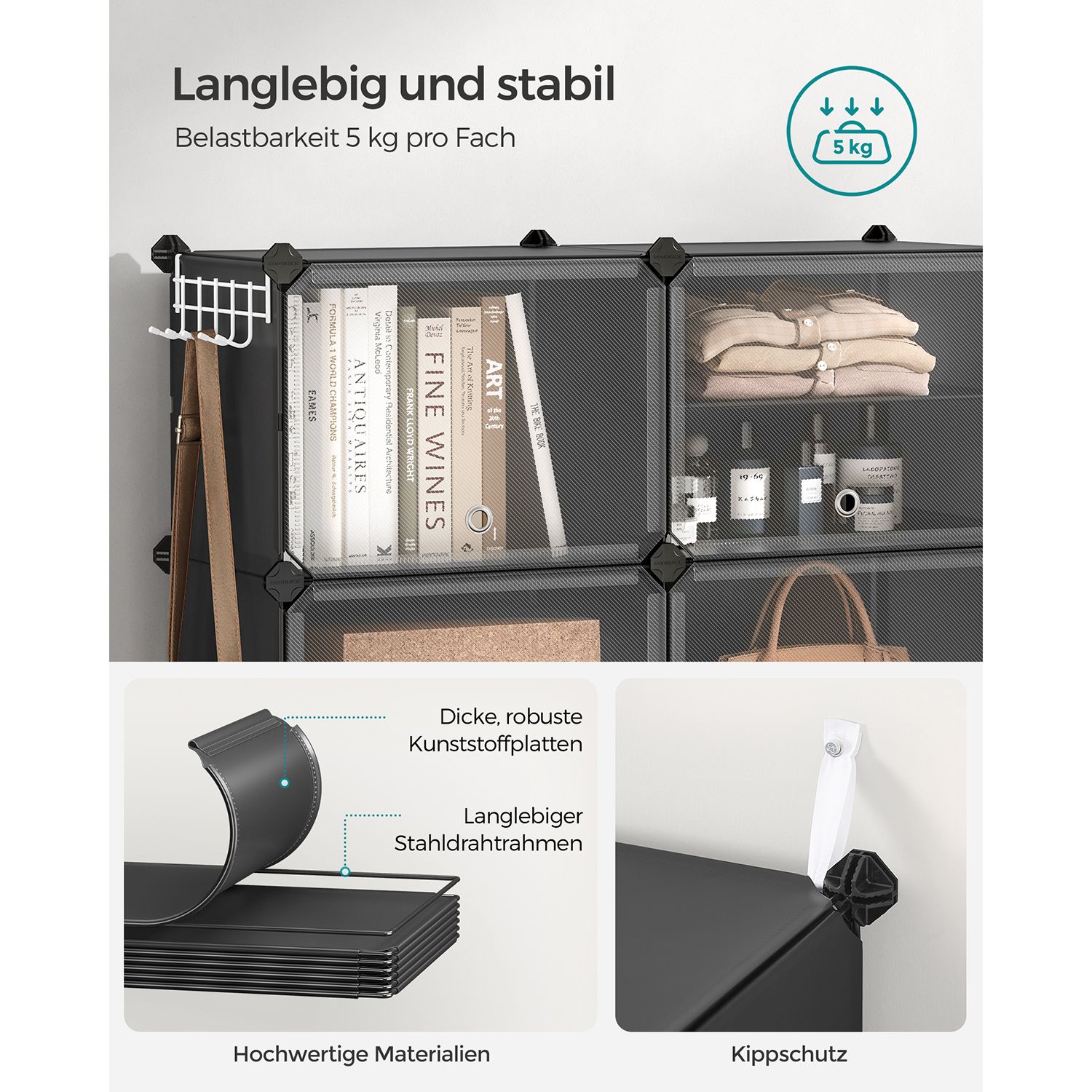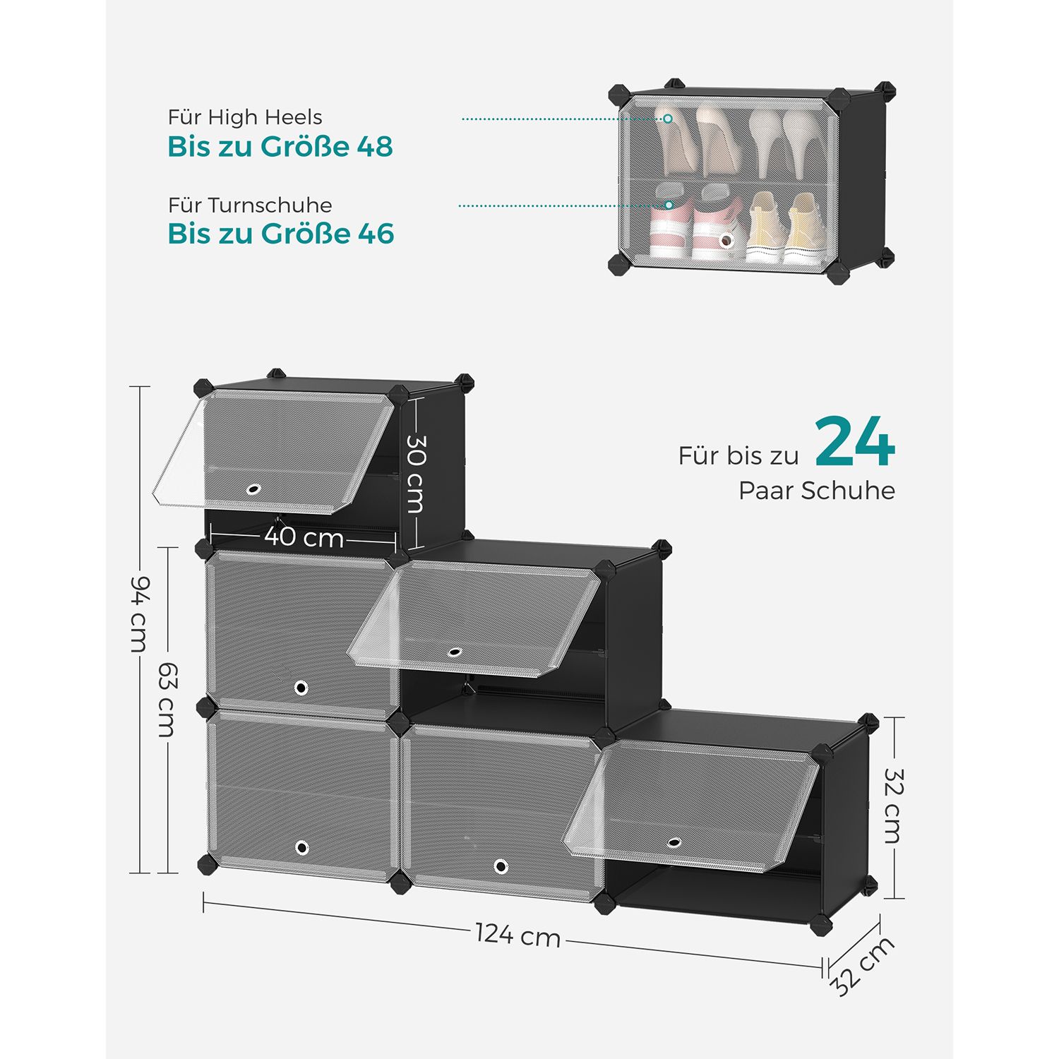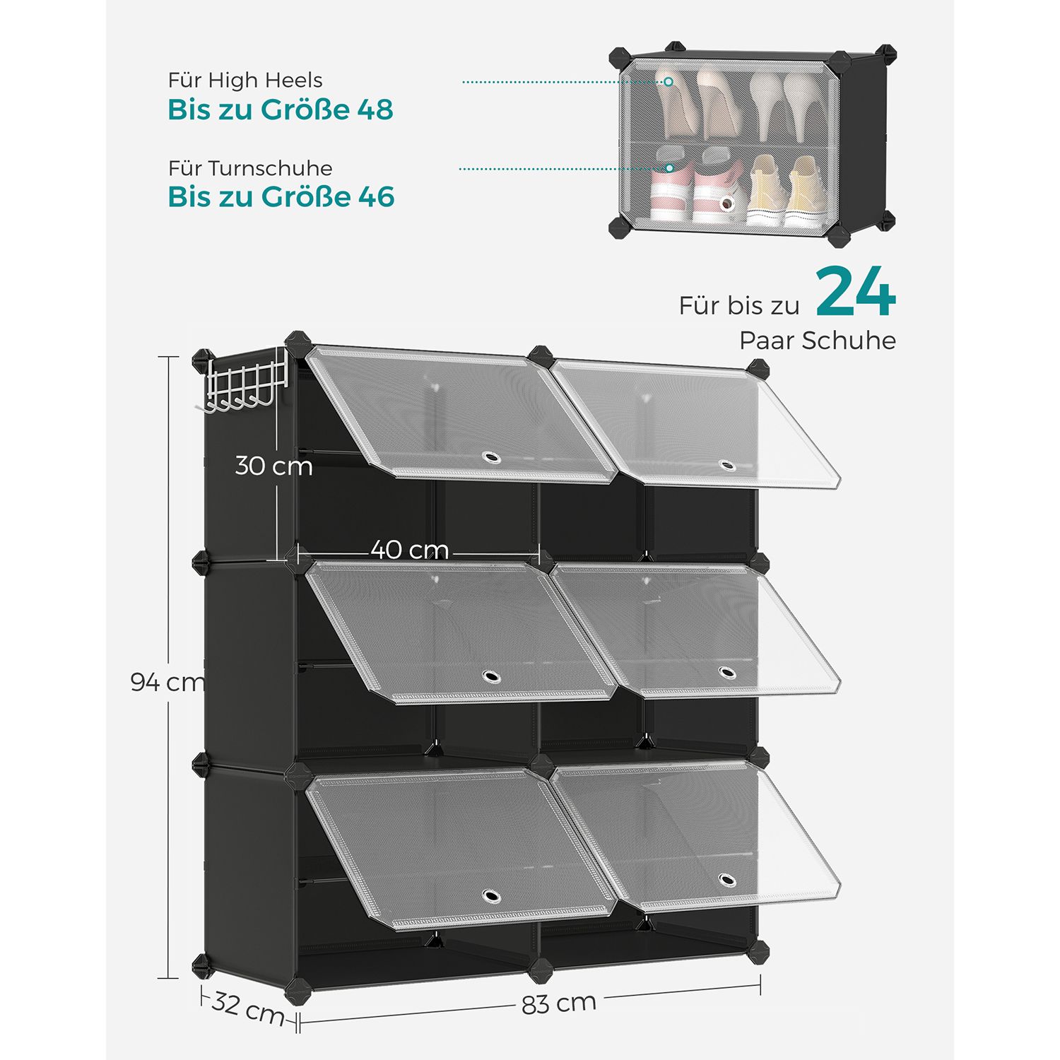 SONGMICS kenkähylly 6 lokerolla, kenkäkaappi, 30 x 40 x 30 cm per lokero, kapea, ovet, teräsrunko, muovi, eteiseen, makuuhuoneeseen, sisäänkäyntiin, musta LPC033B01