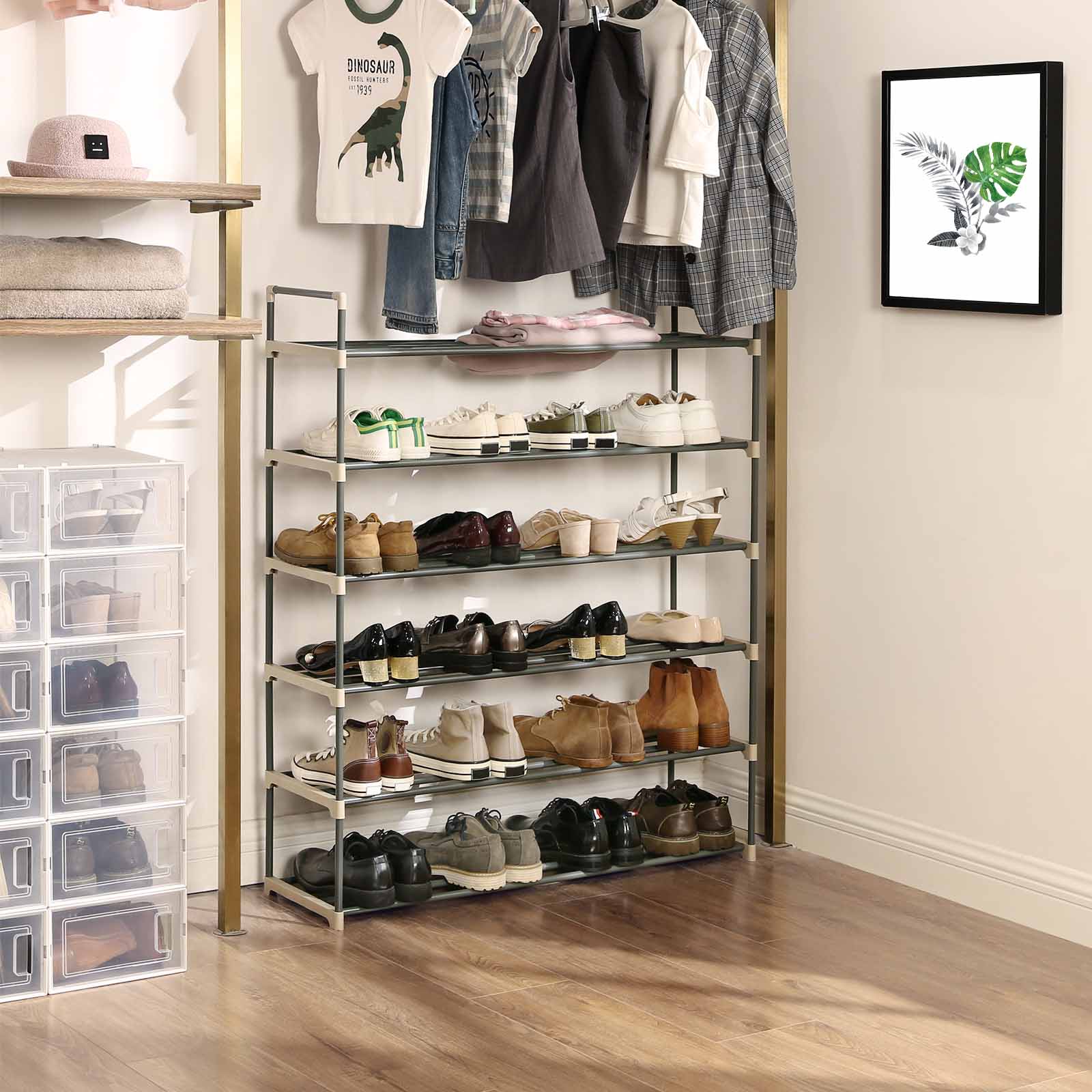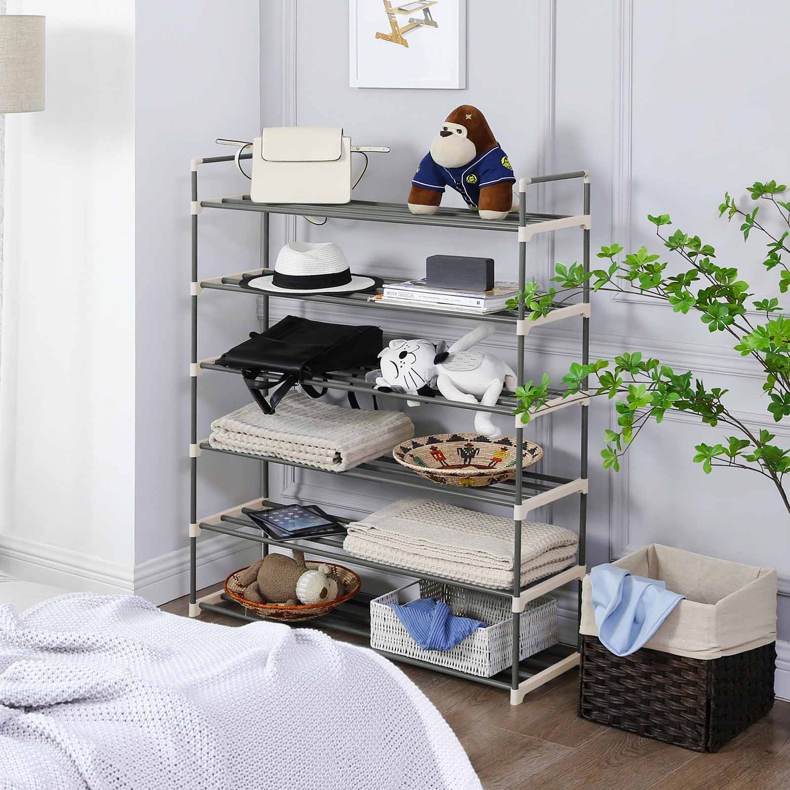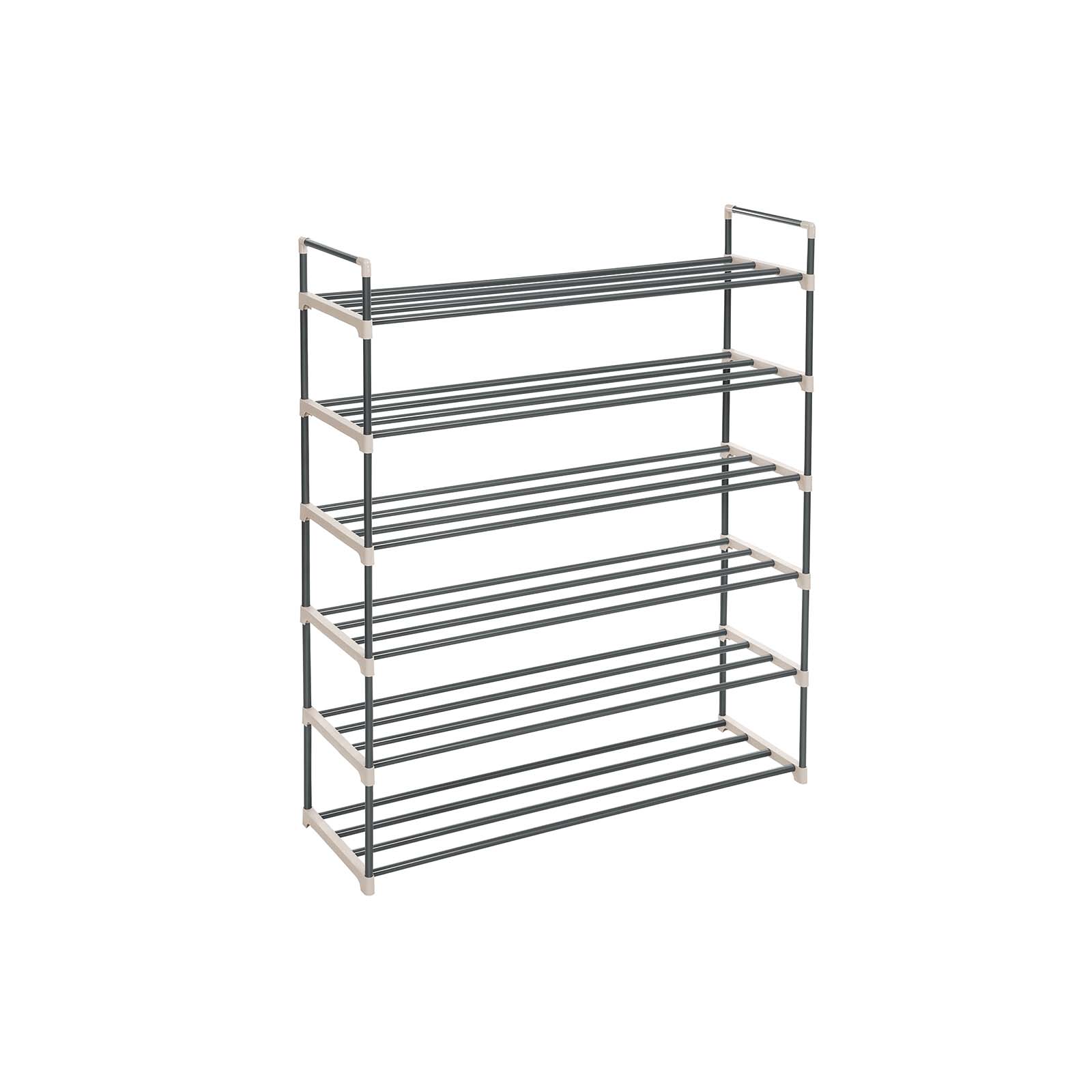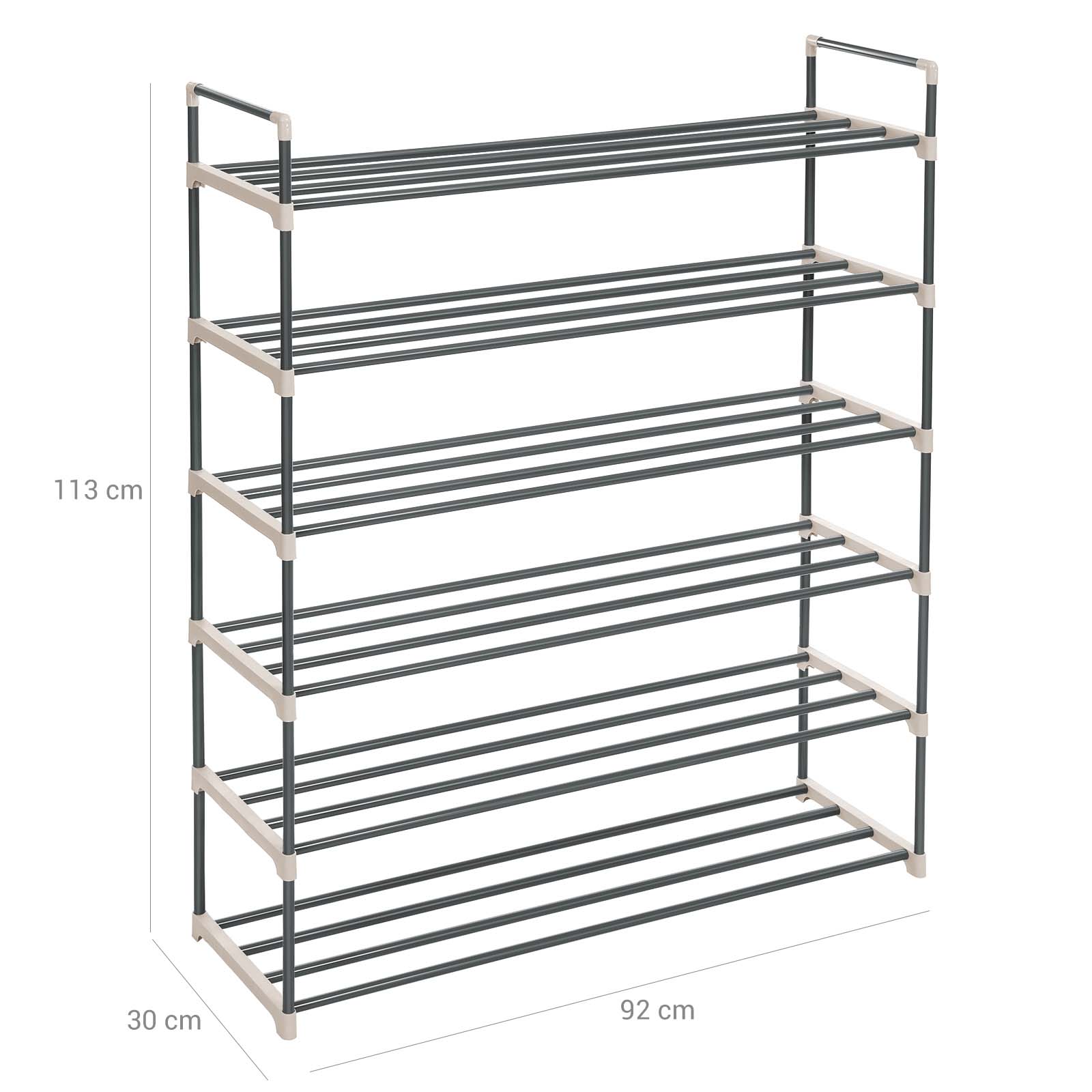 Jos sinulla on vain pieni budjetti sopivan kenkäkaapin hankkimiseen, tämä yksinkertainen mutta toimiva kenkähylly on sinulle kuin luotu. 6 hyllyä riittää mainiosti kenkien säilytykseen, ja älä unohda, että voit myös kääntää hyllyn ylösalaisin saadaksesi lisää säilytystilaa. Haluatko säilyttää saappaita? Ei hätää! Tämä kenkäorganisaattori on helppo koota ja säätää. Asennuksen yhteydessä voit jättää yhden tai kaksi hyllyä pois, jotta saat tilaa uusille saappaille! Laajennettavissa? Kyllä! Olemme ottaneet myös tässä tuotteessa huomioon, että kenkäkokoelmasi kasvaa jatkuvasti. Pinoa vain kaksi kenkähyllyä päällekkäin, niin saat suuren 12-tasoisen kenkähyllyn. Mihin tämä kenkäorganisaattori kannattaa sijoittaa?Eteisessä – lisää mukavuutta Olohuoneessa – lisää järjestystä Pukeutumishuoneessa – lisää säilytystilaa Tuotetiedot: – Väri: harmaa – Materiaali: metalliputki, muoviliitin – Mitat: 92 x 30 x 113 cm (P x L x K) – Hyllyjen välinen etäisyys: 20 cm – Paino: 2,4 kg – Hyllyn enimmäiskuormitus: 4 kg – Hyllyn enimmäiskuormitus: 24 kg – Toimitus sisältää: – 1 x kenkähylly – 1 x ohjeet (DE, EN, FR, ES, IT) kuormituskyky hyllyä kohti: 4 kg – Koko hyllyn maks. kuormituskyky: 24 kg Toimitus sisältää: – 1 x kenkähylly – 1 x ohjeet (DE, EN, FR, ES, IT) SONGMICS-ohjeet: – Älä käytä tuotetta ulkona. – Tekstissä mainittu maks. kuormituskyky viittaa staattiseen maksimipainoon.