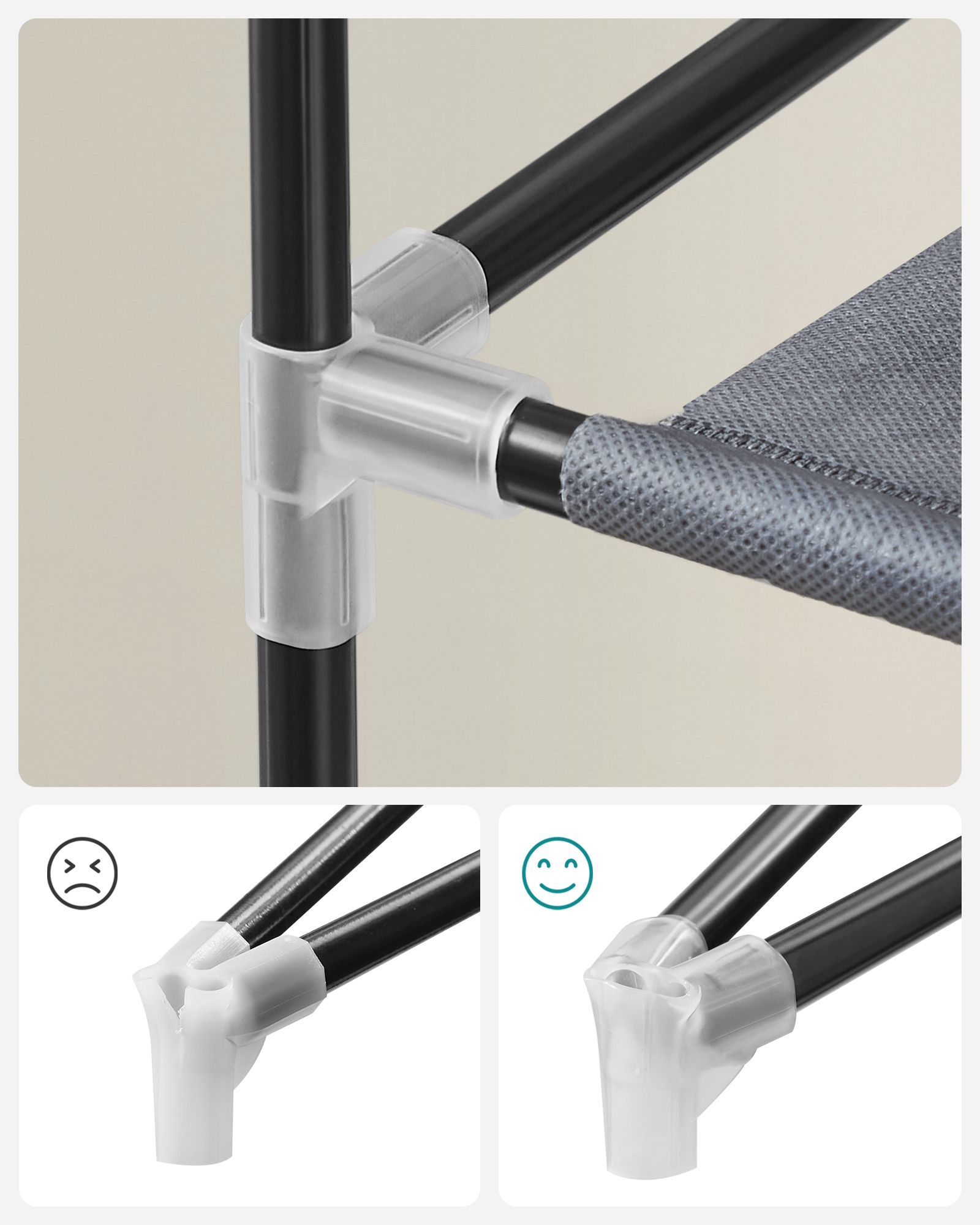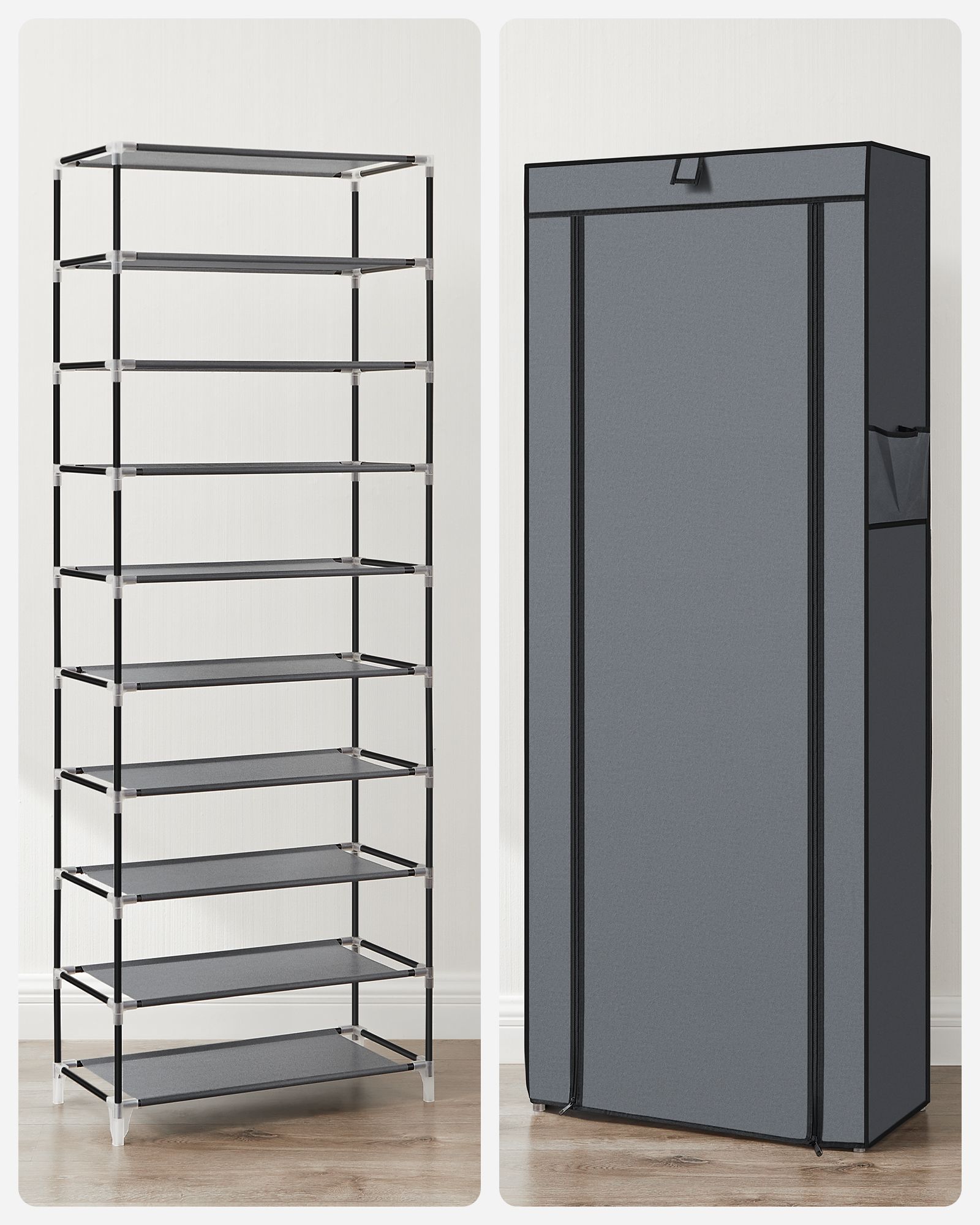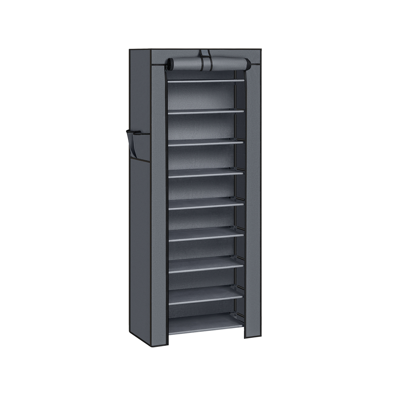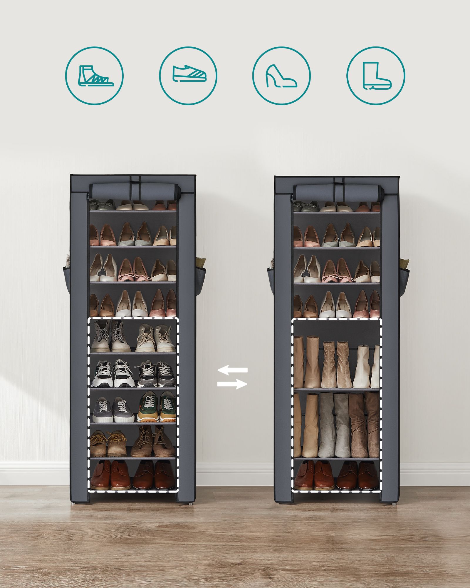 Olipa kyseessä vaatehuone, eteinen tai makuuhuone: tyylikäs kenkäkaappi sopii mihin tahansa ympäristöön. Jokaiselle kenkätelineelle mahtuu 3 paria naisten kenkiä tai 2 paria miesten kenkiä. Ovenverho, jossa on tarranauhat ja vetoketjut, suojaa kenkiä pölyltä ja lialta. Näin kenkäsi eivät enää loju ympäriinsä, vaan ovat siististi järjestyksessä uudella hyllylläsi. Kaikki on siististi ja selkeästi järjestyksessä. Tuotetiedot: – Materiaali: fleece-kangas, teräsputki – Väri: harmaa – Mitat: 58 x 160 x 28 cm (L x K x S) – Kunkin tason mitat: 58 x 27 x 17 cm – Pakkauksen mitat: 57 x 21 x 10 cm – Paino: 2,4 kg Huomautukset: – Tuotetta ei saa altistaa suoralle auringonvalolle, muuten sen käyttöikä voi lyhentyä. Säilytä tuote viileässä ja kuivassa paikassa homeen muodostumisen estämiseksi. – Vältä pakkauksen avaamista ja tuotteen kokoamista väkisin. – Jos kohtaat ongelmia kokoamisessa, ota yhteyttä asiakaspalveluumme, autamme mielellämme ongelmien ratkaisemisessa tai tarjoamme sinulle ilmaisia varaosia. – Jos haluat säilyttää saappaita, nilkkasaappaita, lumisaappaita tai paksuja kenkiä, aseta ne joko makuulle tai jätä yksi tai kaksi hyllyä pois kokoonpanosta, mikä ei vaikuta hyllyn vakauteen. Toimitussisältö: – 1 x kenkähylly ohjeineen