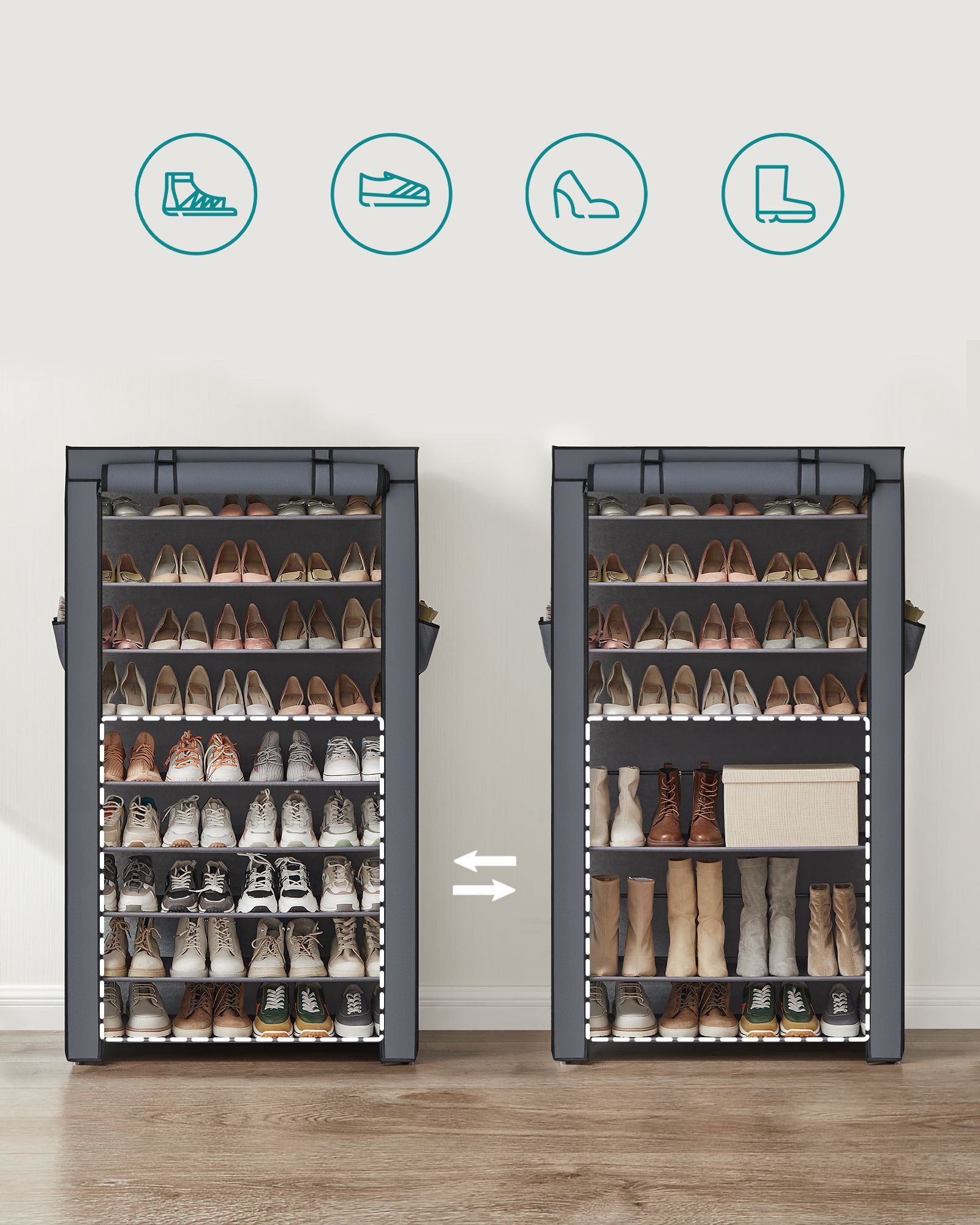 Kuvaus: Hanki tämä kenkähylly kotiisi ja siisti asuntosi. SONGMICS ei koskaan petä sinua! Pelasta kotisi kenkäkaoselta. Ovatko korkokengät, kumppanisi saappaat ja lastesi kengät hajallaan lattialla, joten sinulla on vaikeuksia löytää sopivaa paria, kun lähdet aamulla kotoa? Tästä päivästä lähtien etsiminen on ohi! Tämä kenkähylly auttaa sinua säilyttämään kaikki kenkäsi siististi. Vihdoin kengät, jotka ovat olleet pitkään piilossa kenkäkasojen alla, saavat taas mahdollisuuden tulla käytetyiksi! Mitä sinun pitäisi tehdä, jos kangashylly likaantuu? Älä huoli! Kuitukangas on helppohoitoinen ja vettä hylkivä, joten sen puhdistamiseen riittää kostealla liinalla pyyhkiminen.Haluatko säilyttää saappaasi? Ei hätää! Tämä kenkähylly on helppo koota ja säätää. Asennuksen yhteydessä voit jättää yhden tai kaksi hyllyä pois, jotta saat tilaa uusille saappaille! Huolehdimme myös siitä, että muut kenkätarvikkeet, kuten kenkävoide tai kengännauhat, voidaan säilyttää siististi. Katso vain hyllyn sivutaskut! Erittäin käytännölliset! Tuotetiedot: – Väri: harmaa – Materiaali: kuitukangas, metalliputket, muoviliittimet – Hyllyjen välinen etäisyys: 17 cm – Mitat: 88 x 28 x 160 cm (P x L x K) – Paino: 2,7 kg – Hyllyn enimmäiskuormitus: 3 kg – Hyllyjen enimmäiskuormitus yhteensä: 27 kg – Toimitus sisältää: – 1 x kenkähylly – 1 x ohjeet (DE, EN, FR, ES, IT) SONGMICS-ohjeet: – Älä käytä tuotetta, jos se on vaurioitunut tai puutteellinen. koko hyllyn enimmäiskuormitus: 27 kgToimitus sisältää:- 1 x kenkähylly- 1 x ohjeet (DE, EN, FR, ES, IT)SONGMICS-ohjeet:- Älä käytä tuotetta ulkona.