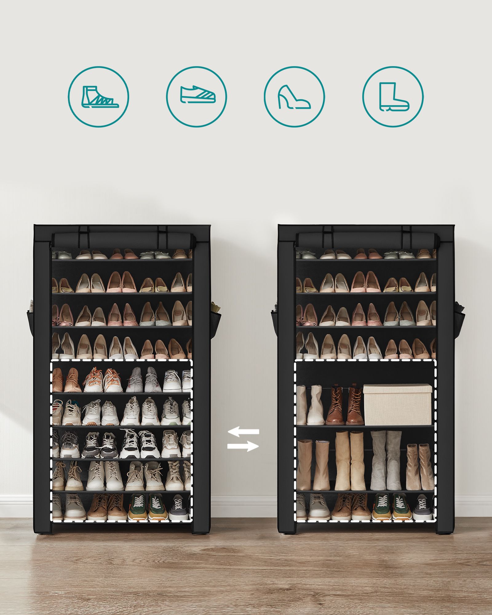 Hanki tämä kenkäteline kotiisi ja siisti asuntosi. SONGMICS ei koskaan petä sinua! Pelasta kotisi kenkäkaoselta. Ovatko korkokengät, kumppanisi saappaat ja lastesi kengät hajallaan lattialla, joten sinulla on vaikeuksia löytää sopivaa paria, kun lähdet aamulla kotoa? Tästä päivästä lähtien etsiminen on ohi! Tämä kenkähylly auttaa sinua säilyttämään kaikki kenkäsi siististi. Viimeinkin kengät, jotka ovat olleet pitkään piilossa kenkäkasojen alla, saavat taas mahdollisuuden tulla käytetyiksi! Mitä sinun pitäisi tehdä, jos kangaspäällyste likaantuu? Älä huoli! Kuitukangas on helppohoitoinen ja vettä hylkivä, joten sen puhdistamiseen riittää kostealla liinalla pyyhkiminen. Haluatko säilyttää saappaasi? Ei hätää! Tämä kenkähylly on helppo koota ja säätää. Asennuksen yhteydessä voit jättää yhden tai kaksi hyllyä pois, jotta saat tilaa uusille saappaille!Huolehdimme myös siitä, että muut kenkätarvikkeet, kuten kenkävoide tai kengännauhat, voidaan säilyttää siististi. Katso vain hyllyn sivutaskut! Erittäin käytännöllinen! Tuotetiedot: – Väri: musta – Materiaali: kuitukangas, metalliputket, muoviliittimet – Hyllyjen välinen etäisyys: 17 cm – Mitat: 88 x 28 x 160 cm (P x L x K) – Paino: 2,7 kg – Hyllyn enimmäiskuormitus: 3 kg – Hyllyn enimmäiskuormitus: 27 kg Toimitus sisältää: – 1 x kenkähylly – 1 x ohjeet (DE, EN, FR, ES, IT) SONGMICS-ohjeet: – Älä käytä tuotetta ulkona.