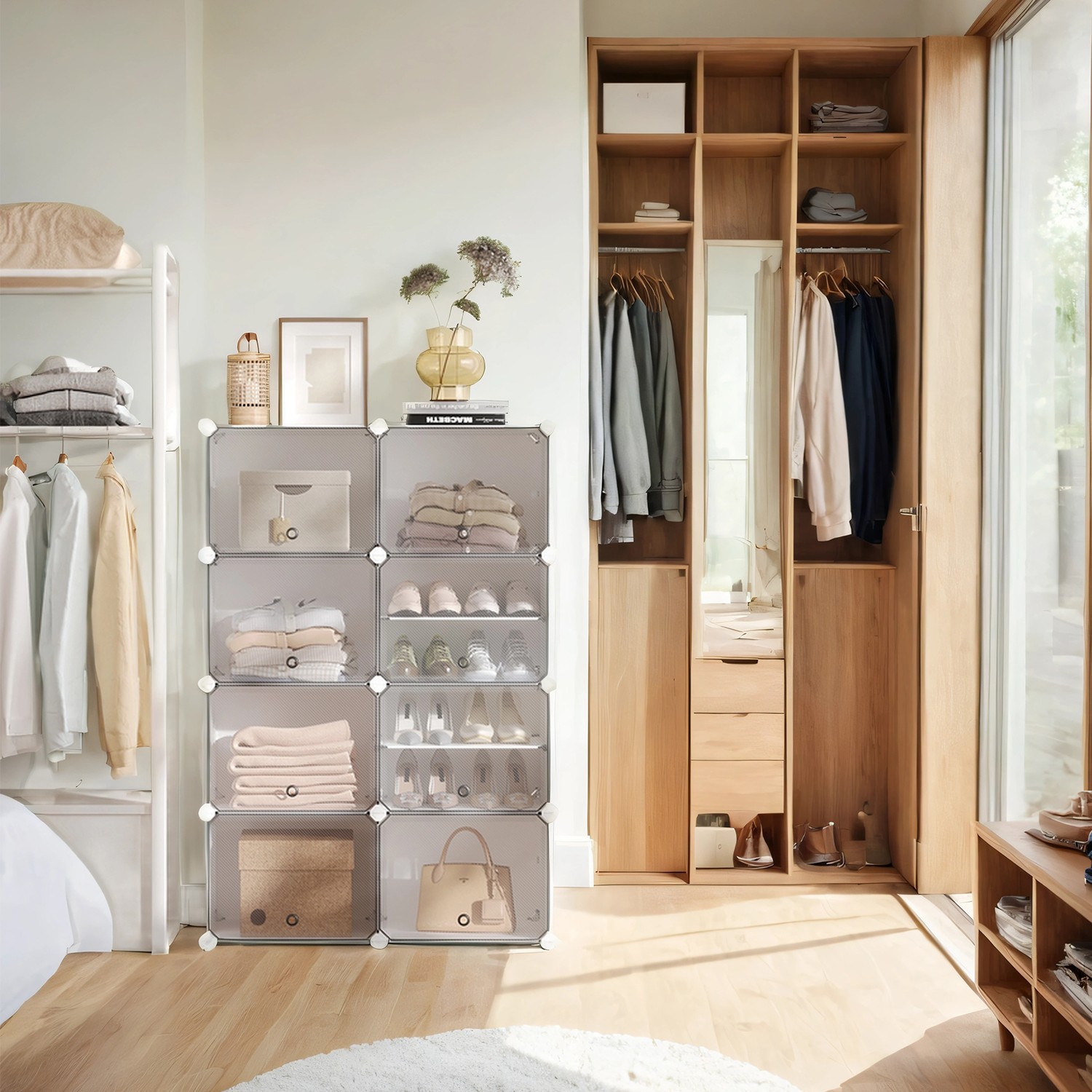 Kenkähylly, kenkäkaappi 8 lokerolla, teräsrunko, 30 x 40 x 30 cm per lokero, kapea, ovet, muovi, musta
