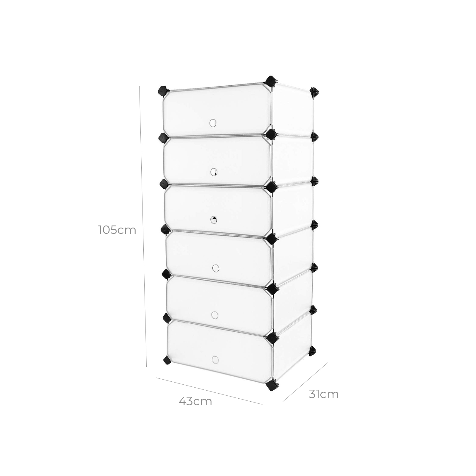 Songmics-kengähylly tarjoaa paljon säilytystilaa, erinomaista laatua ja kohtuullisen hinnan! Se yhdistää ihanteellisella tavalla keveyden ja vakauden. Asennus perustuu nerokkaaseen pistokejärjestelmään, ja graafiset asennusohjeet opastavat sinut askel askeleelta käytännöllisen tilan säästäjän luomiseen. Tarvittaessa hylly voidaan helposti purkaa, jotta se voidaan varastoida tai kuljettaa tilaa säästäen. Etsitpä sitten kenkäkaappia tai tarvitset vain säilytystilaa eteiseen – Songmics tarjoaa joustavan järjestelmänsä ansiosta sopivan ratkaisun kaikkiin näihin tehtäviin! Huomautukset: Koska kaappi on valmistettu pääasiassa PP-muovista, vältä painamasta kaappia kovalla paineella, lyömästä sitä voimakkaasti tai altistamasta sitä terävien/terävien esineiden kosketukselle. Varo myös istumasta kaapin päälle. Pidä kaappi poissa syttymislähteistä ja avotulesta. Kun kiinnität liitoskappaleita, huomaa, että pyöreiden pintojen, joissa on ”Songmics”-logo, tulee olla kaikki ulospäin. Kun kiinnität ovea, aseta rautalanka kulmaan liitoskappaleen sisäisen aallotuksen varrelle ja rautalanka tulee olla ”aivan alhaalla” kiinnitysurassa. Kiinnitä ovet tasojen rakenteen mukaan.Kun kiinnität levyjä, huomaa, että levyjen syvennetyt kulmat on asetettava liitoskappaleiden kiinnityskoloihin painamalla ne loppuun asti. Tätä varten jokainen liitoskappale on painettava aina tason rakentamisen jälkeen, kunnes osat ovat ”aivan alhaalla” ja lukittuvat paikalleen. On ehdottomasti huolehdittava tarkasta istuvuudesta, muuten kaappi näyttää vääntyneeltä.Levyt koostuvat metallikehyksestä, joka on päällystetty tukevalla muovikalvolla, asetettu reunojen yli ja sitten hitsattu. Kirjojen, käsipainojen tai muiden raskaiden esineiden säilyttämistä kaapissa ei suositella. Tuotetiedot: Mitat: 43 x 105 x 31 cm (L x K x S) Materiaali: PP-muovi (levy) + ABS-muovi (liitoskappale)Väri: puoliläpinäkyvä valkoinenKunkin hyllyn enimmäiskuormitus: 10 kgToimitus sisältää:8 x PP-levy (40 x 30 cm; puoliläpinäkyvä valkoinen)12 x PP-levy (30 x 17 cm; puoliläpinäkyvä valkoinen)6 x PP-levy (40 x 17 cm; puoliläpinäkyvä valkoinen) 6 x ovi (40 x 17 cm; puoliläpinäkyvä valkoinen) 28 x muovinen liitoskappale (musta) 1 x puinen vasara 1 x ohjeet (DE, EN, FR, IT, ES) 1 x kaatumissuoja (2 sarjaa ruuveja, tulppia ja nailonhihnoja)