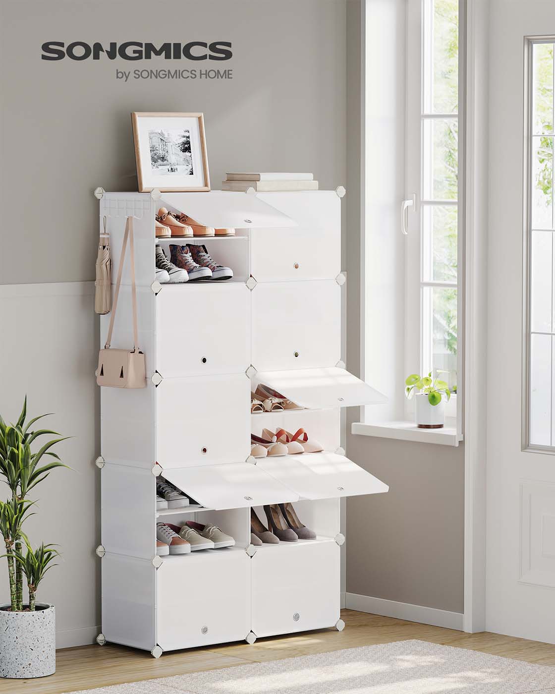 SONGMICS kenkähylly 10 lokerolla, kenkäkaappi, 30 x 40 x 30 cm per lokero, kapea, ovilla, teräsrunko, muovi, eteiseen, makuuhuoneeseen, sisäänkäyntialueelle, musta LPC035B01