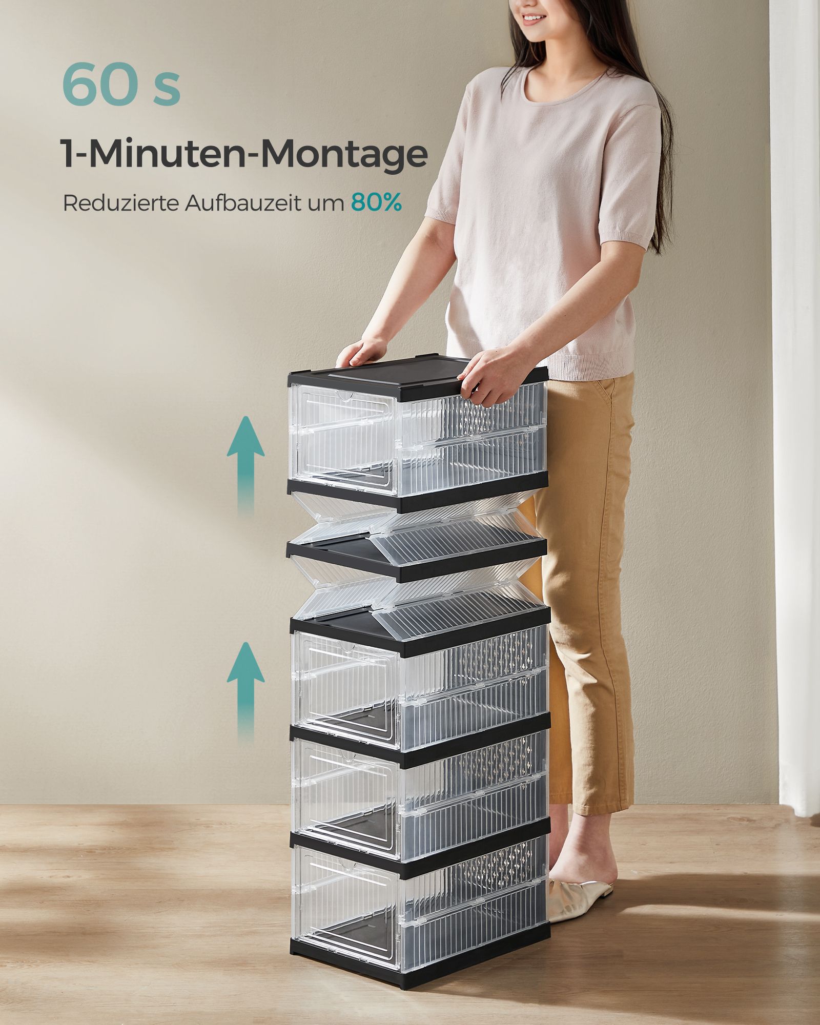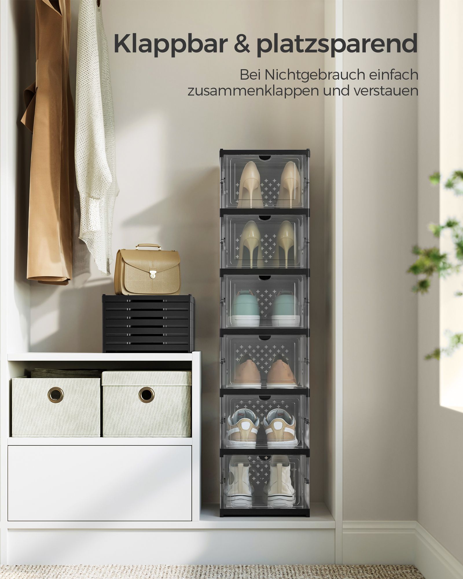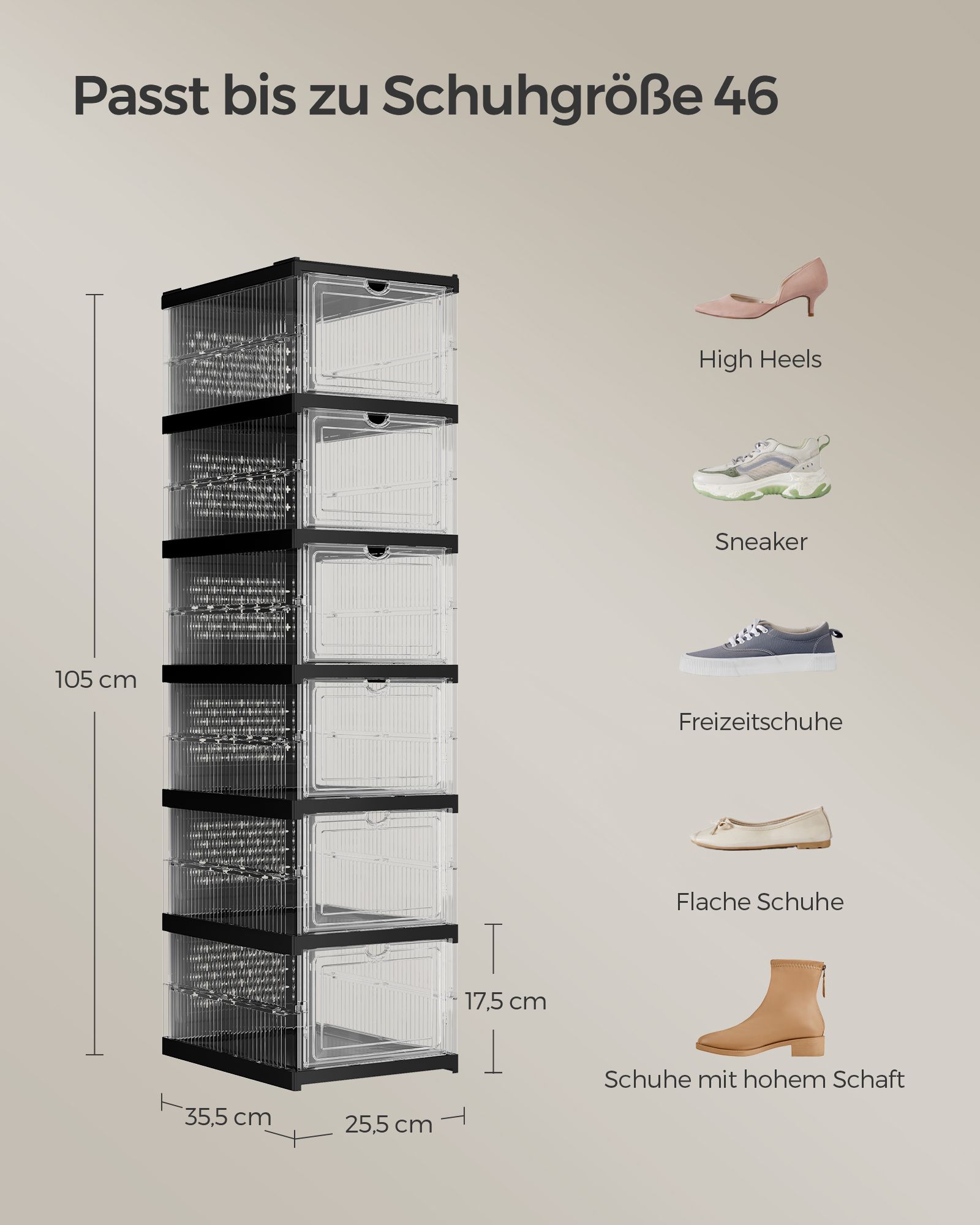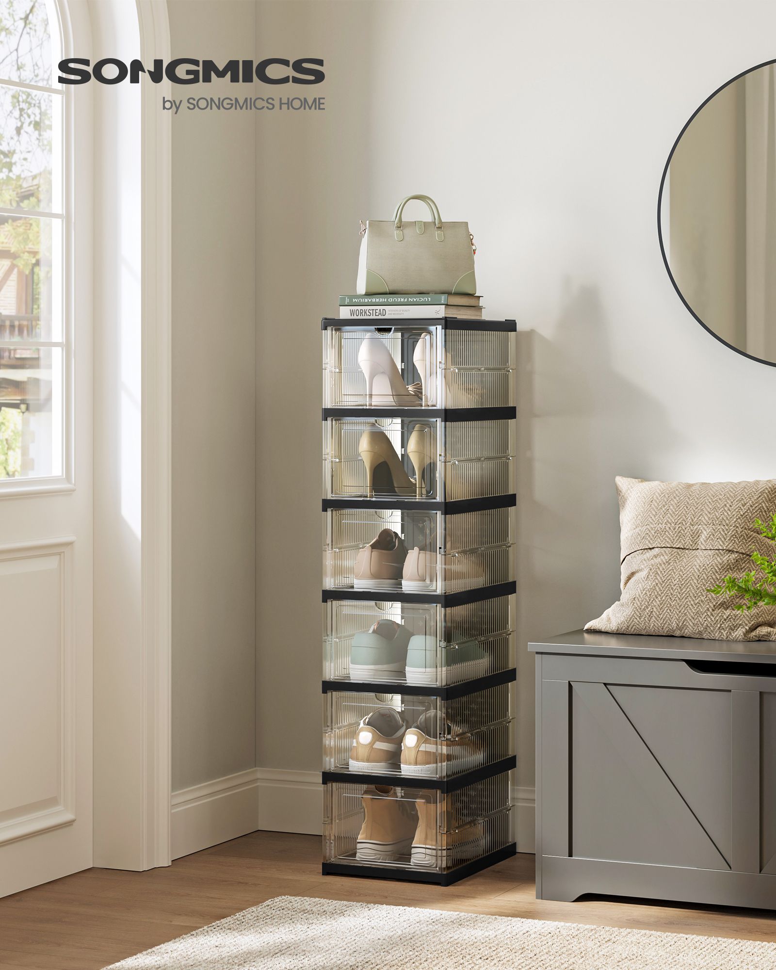 SONGMICS kenkäkaappi, 6 kenkälaatikkoa, integroitu kenkäorganisaattori, taitettava, kannettava, kengille kokoon 46 asti, 1 minuutin asennus, läpinäkyvä-mustanmusta LSP205B01