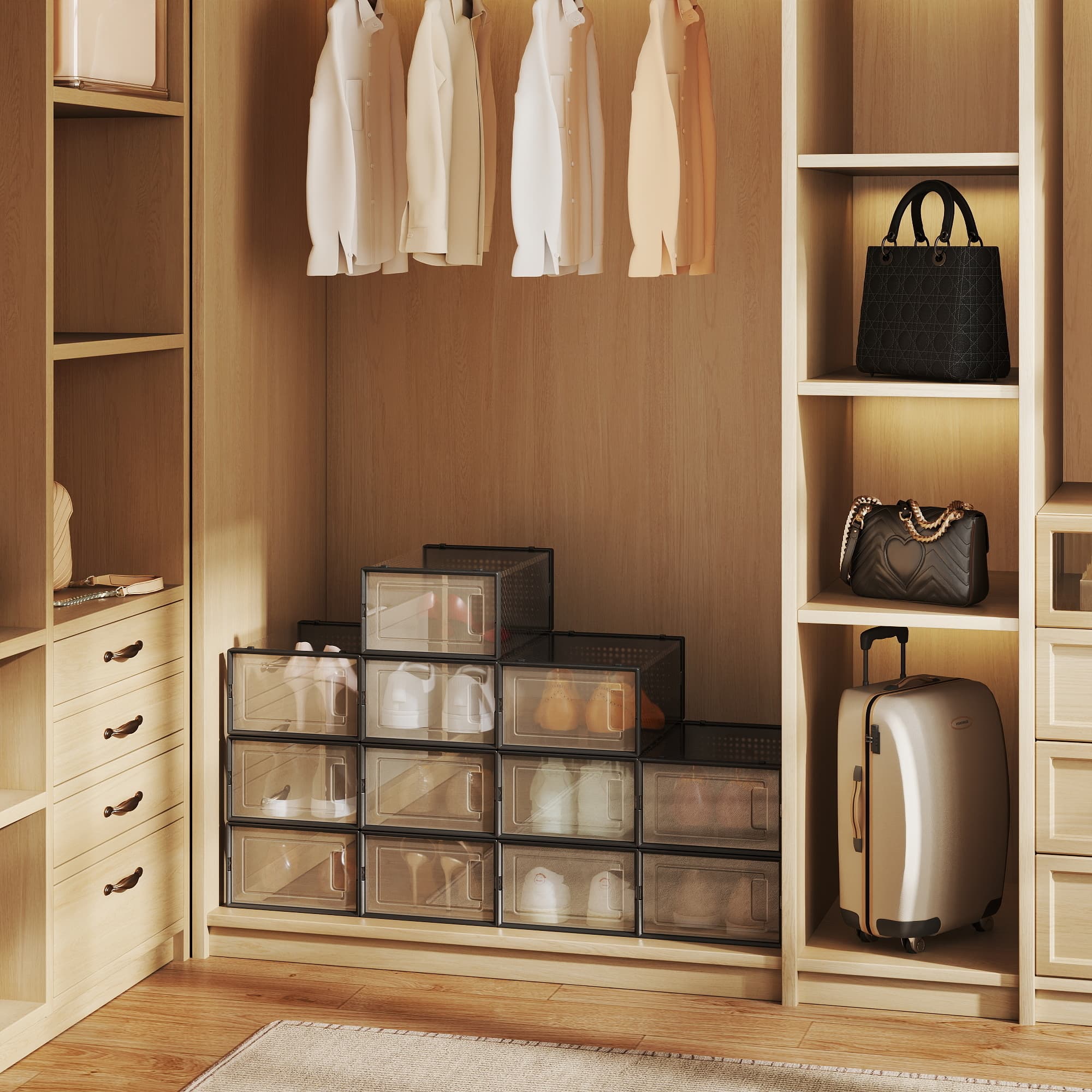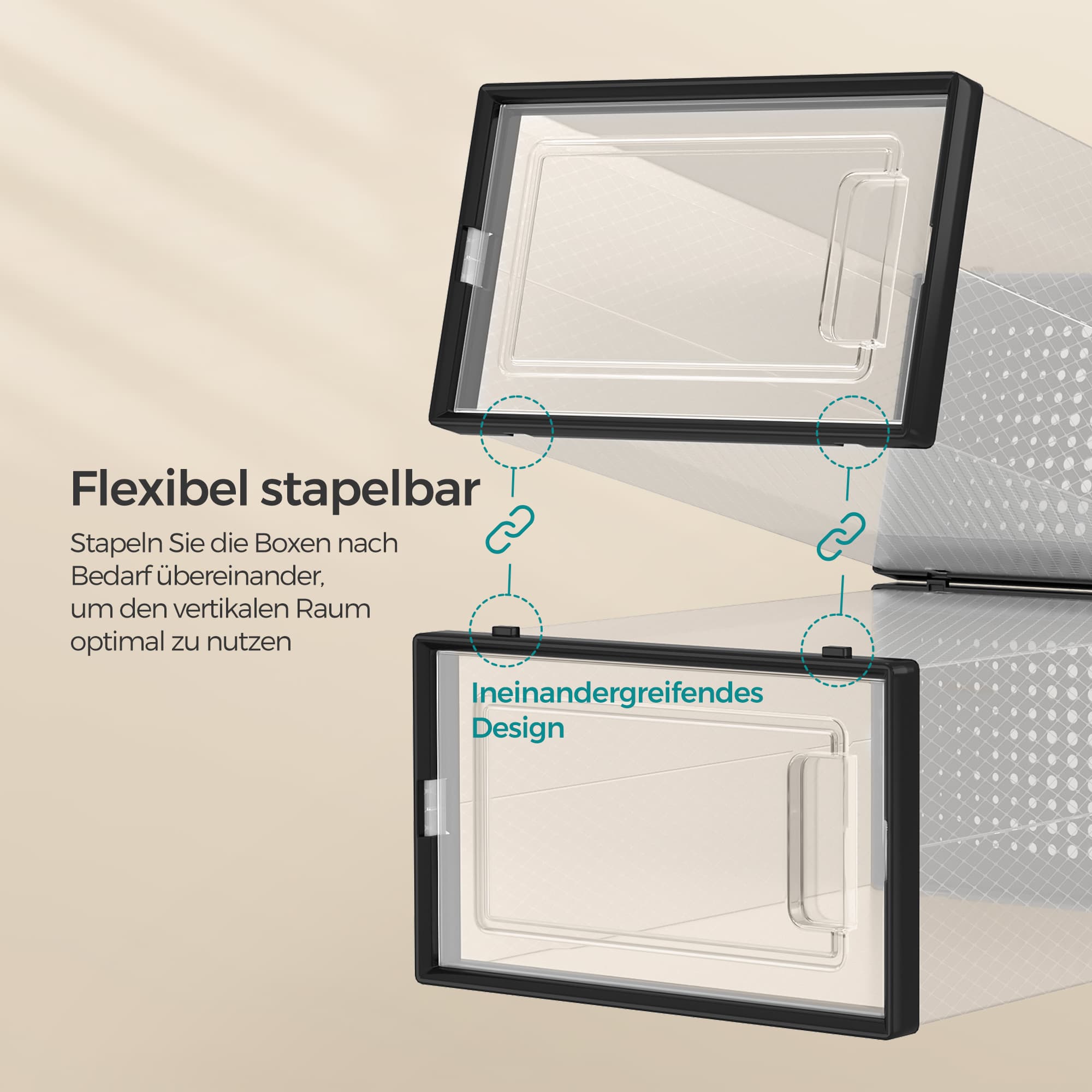 Kenkälaatikot, 12 kpl:n sarja, muoviset kenkäorganisaattorit, taitettavat ja pinottavat, kengille kokoon 44 asti, läpinäkyvä-mustat