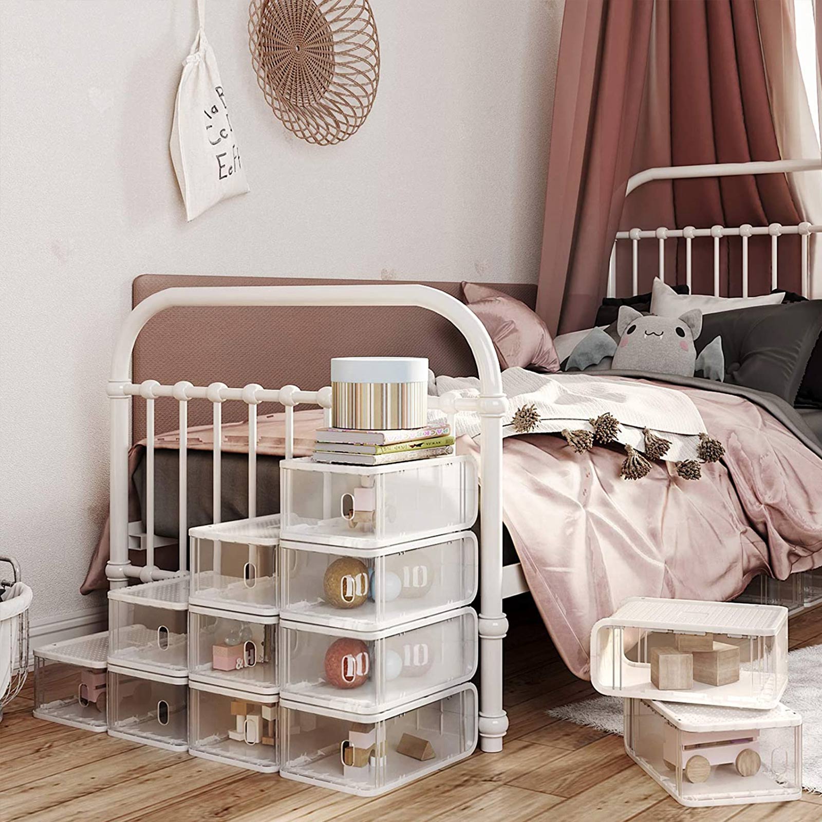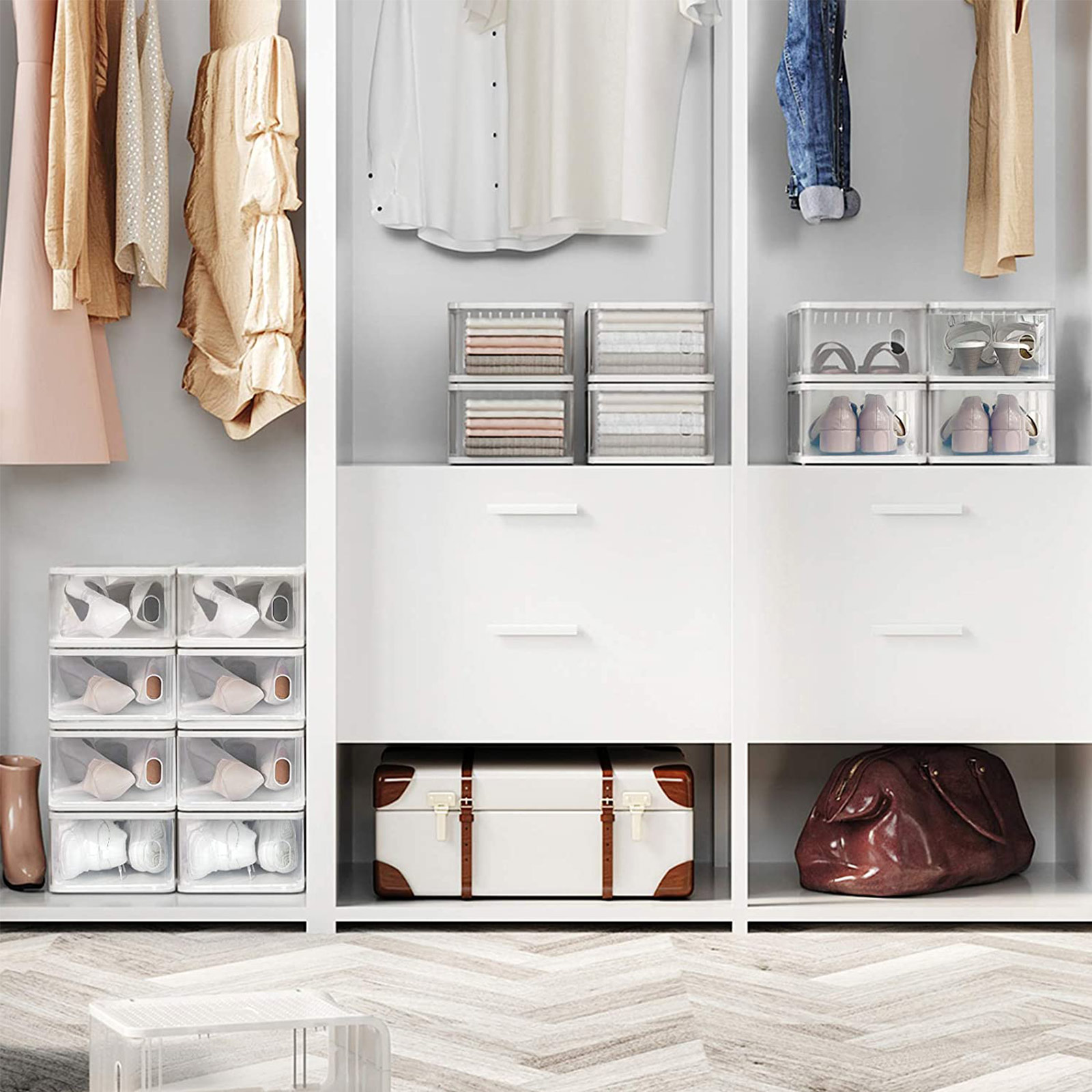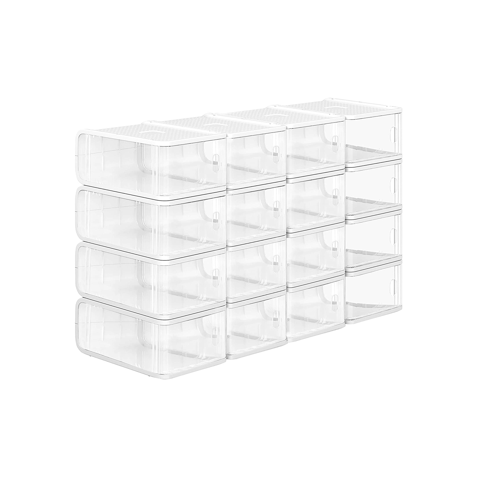 Nämä SONGMICS:n pinottavat kenkälaatikot auttavat sinua paitsi pitämään kenkäsi siististi järjestyksessä, myös näkemään kaikki laatikoihin säilötyt kengät yhdellä silmäyksellä ja pääsemään niihin nopeasti käsiksi.Pinoa laatikot ja kengät päällekkäin: Valmistettu kestävästä PP-muovista, nämä kenkäorganisaattorit lupaavat pitkän käyttöiän ja suojaavat kenkiäsi pölyltä ja kosteudelta. Älykkään muotoilun ansiosta, jossa laatikoiden ylä- ja alaosat sopivat tarkasti toisiinsa, useita muovilaatikoita voidaan pinota vakaasti päällekkäin. Näin saat tilaa säästävän kenkäkaapin. Sopii kengille, joiden koko on enintään 41: Sisämitat 19,5 x 27,5 x 10,5 cm, joten kenkälaatikkomme ovat riittävän suuria kenkien, joiden koko on enintään 41, säilyttämiseen. Lisäksi nämä laatikot ovat monikäyttöisiä ja sopivat esimerkiksi myös kenkävoiteiden tai -harjojen säilytykseen. Säilytä kaikki kenkäsi näissä SONGMICS-muovilaatikoissa, jotta et enää kompastu kaaoksessa hajallaan oleviin kenkiin eteisessäsi! Tuotetiedot:Väri: läpinäkyvä, valkoinen Materiaali: PP-muovi (polypropeeni) Kotelon koko: 21,5 x 32,5 x 13,5 cm (P x L x K) Kotelon sisämitat: 19,5 x 27,5 x 10,5 cm (P x L x K) Paino: 7,6 kg Toimitus sisältää: 16 x kenkälaatikko SONGMICS-ohjeet: Mittaa kenkäsi ennen ostamista ja tarkista, että ne mahtuvat näihin kenkälaatikoihin.