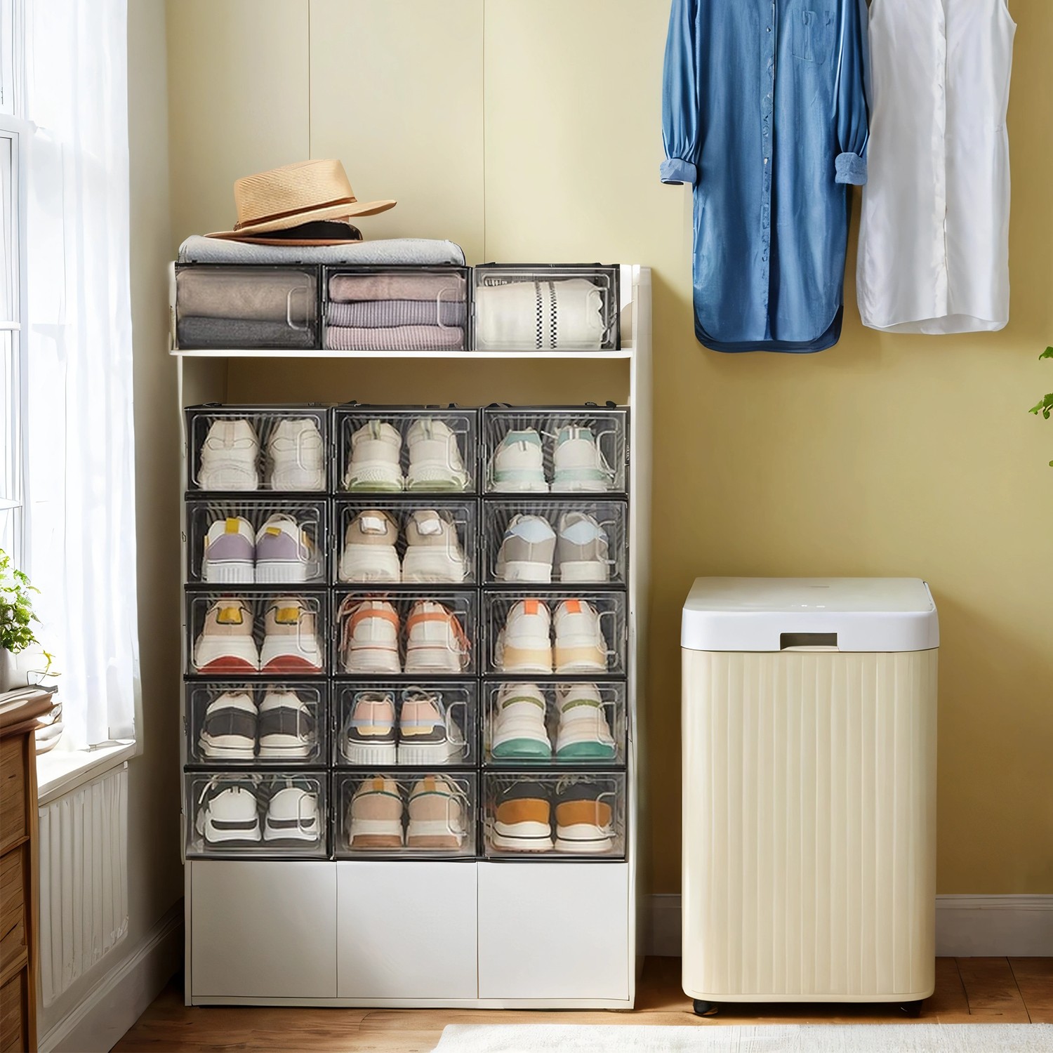 Tuotetiedot: – Väri: läpinäkyvä musta – Materiaali: PET-runko, ABS-kehys – Kenkälaatikon koko: 33,5 x 23 x 14 cm (S x L x K) – Kenkälaatikon sisämitat: 30 x 22,6 x 13,5 cm (S x L x K) – Kokonaispaino: 6,9 kg Toimitus sisältää: – 18 x kenkälaatikko – 1 x ohjeet SONGMICS Huomautukset: – Kokoa tuote tarkasti ohjeiden mukaisesti. – Mittaa kenkäsi ennen ostamista ja tarkista, että ne mahtuvat näihin kenkälaatikoihin.