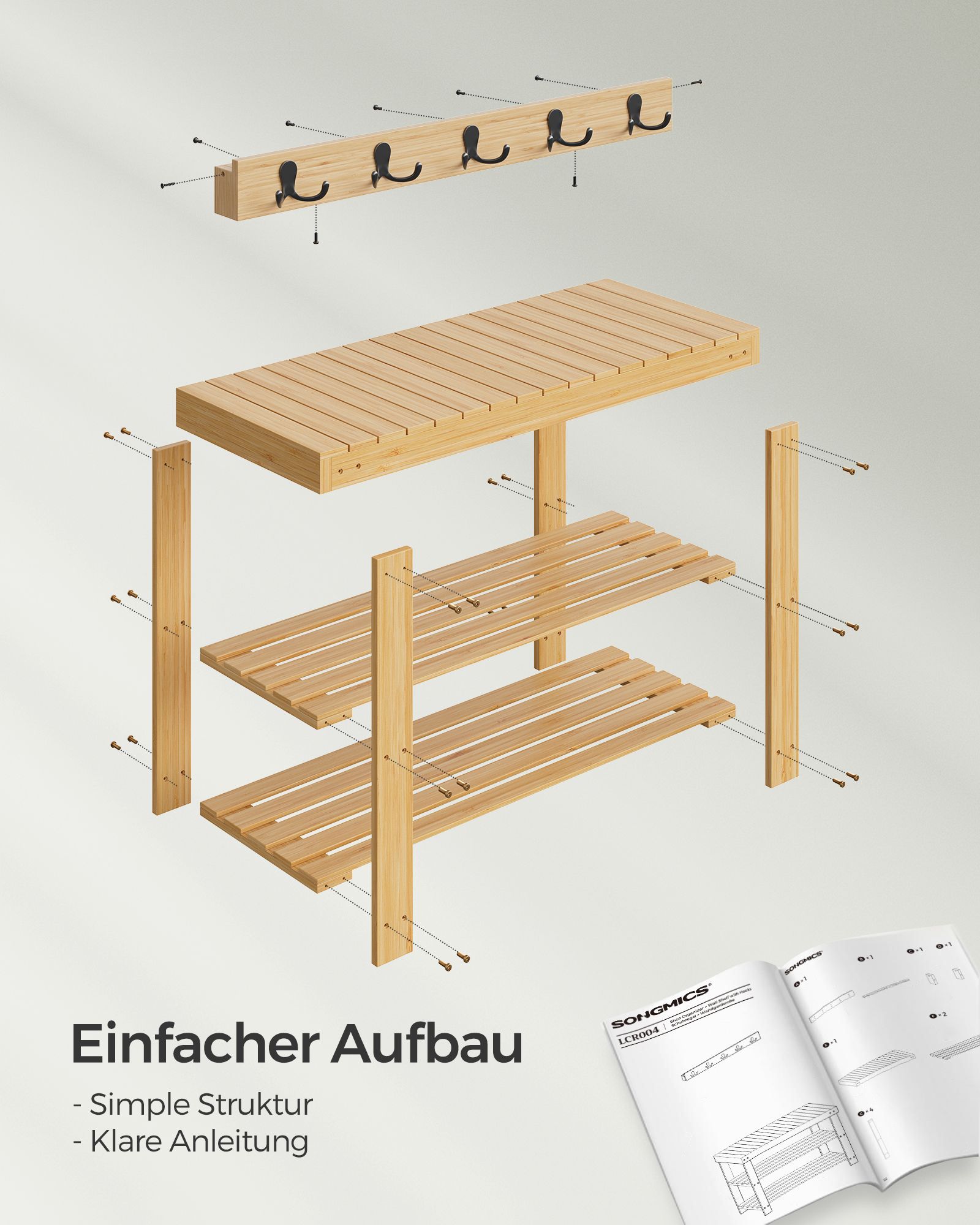 SONGMICS kenkäpenkki seinävaatekaappi-setti, kenkähylly istuimella, monikäyttöinen, 5 kaksinkertaista metallikoukkua, 3-tasoinen bambusta valmistettu kenkäpenkki, eteiseen, makuuhuoneeseen tai olohuoneeseen
