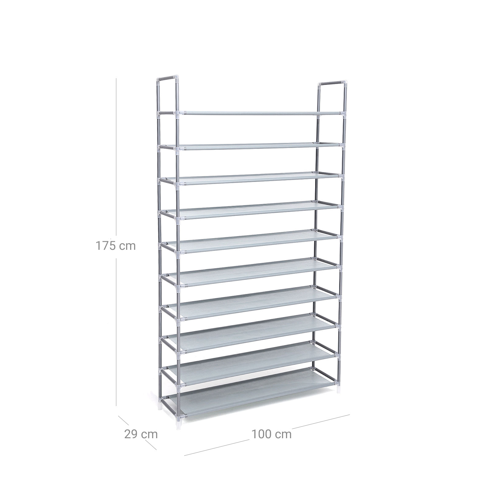 Hanki tämä kenkäteline kotiisi ja siisti asuntosi. SONGMICS ei koskaan petä sinua! Pelasta kotisi kenkäkaoselta. Ovatko korkokengät, kumppanisi saappaat ja lastesi kengät hajallaan lattialla, joten sinulla on vaikeuksia löytää sopivaa paria, kun lähdet aamulla kotoa? Tästä päivästä lähtien etsiminen on ohi! Tämä kenkäteline auttaa sinua säilyttämään kaikki kenkäsi siististi. Vihdoin kengät, jotka ovat olleet pitkään piilossa kenkäkasojen alla, saavat taas mahdollisuuden tulla käytetyiksi! Mitä sinun pitäisi tehdä, jos kangashylly likaantuu? Älä huoli! Kuitukangas on helppohoitoinen ja vettä hylkivä, joten sen puhdistamiseen riittää kostealla liinalla pyyhkiminen. Haluatko säilyttää saappaasi? Ei hätää! Tämä kenkähylly on helppo koota ja säätää. Voit jättää yhden tai kaksi hyllyä pois asennuksessa, jotta saat tilaa uusille saappaille! Tuotetiedot: – Väri: harmaa – Materiaali: kuitukangas, metalliputket, muoviliittimet – Mitat: 100 x 29 x 175 cm (P x L x K) – Korkeus hyllyjen välillä: 17 cm – Paino: 4,1 kg – Maks. kuormituskyky hyllyä kohti: 4 kg – Koko hyllyn maks. kuormituskyky: 40 kg Toimitus sisältää: – 1 x kenkähylly – 1 x ohjeet (DE, EN, FR, ES, IT) SONGMICS-huomautukset: – Älä käytä tuotetta ulkona.