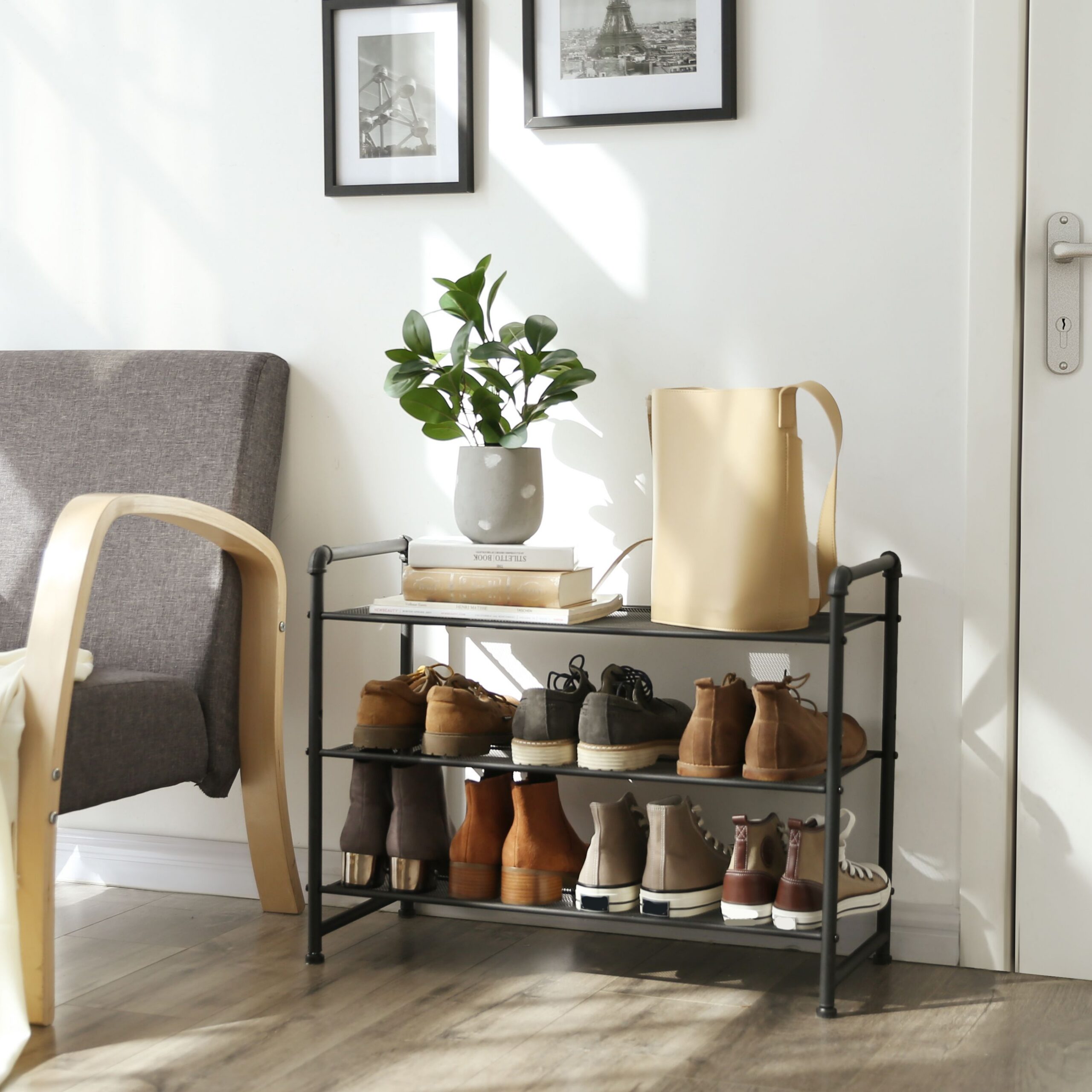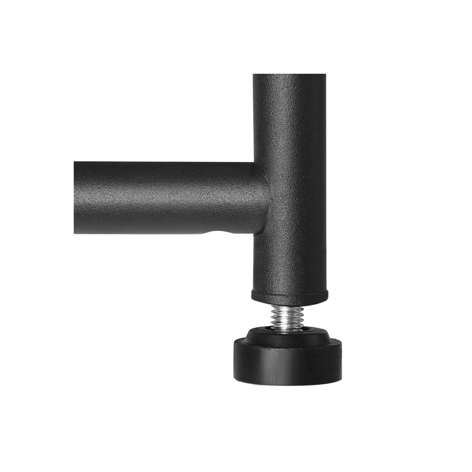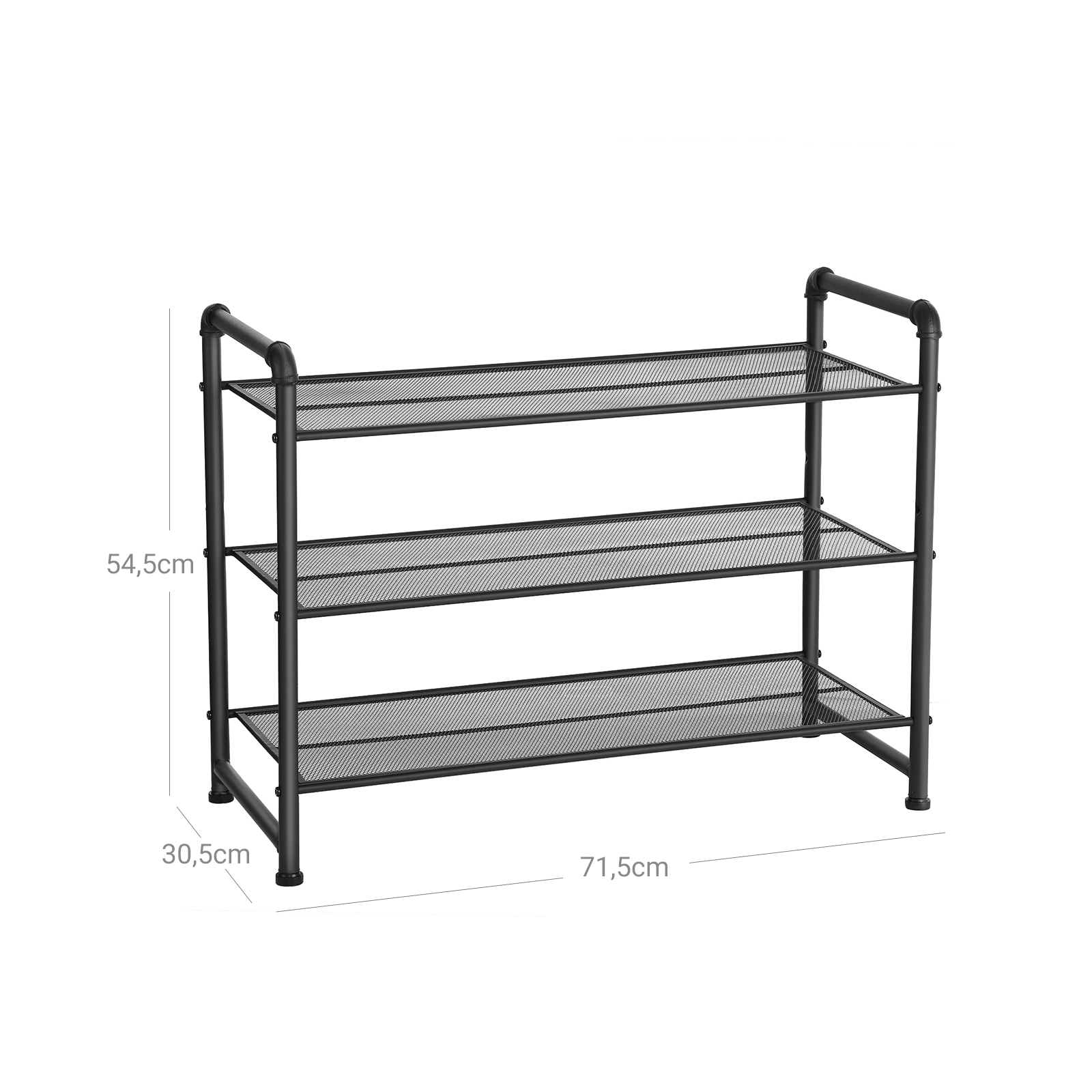 Teollinen muotoilu vesiputkilla Karhea, mattamusta pinta tuo hyllyyn hieman tehdashenkistä tyylikkyyttä. Tiheä metalliverkko Tiheä metalliverkko estää pieniä esineitä putoamasta hyllyltä. Jopa korkokengät ovat turvassa. Helppo asennus Käytä mukana toimitettua kuusiokoloavainta ja ruuvaa 3 hyllytasoa kiinni molemmille sivukehyksille – ja huonekalu on käyttövalmis! Tuotetiedot:Väri: mattamusta Materiaali: rauta Koko: 71,5 x 30,5 x 54,5 cm (P x L x K) Nettopaino: 3,2 kg Maks. kantavuus tasoa kohti: 10 kg Toimitus sisältää: 1 x kenkähylly 1 x lisävarustepussi 1 x ohjeet (DE, IT, FR, EN, ES)