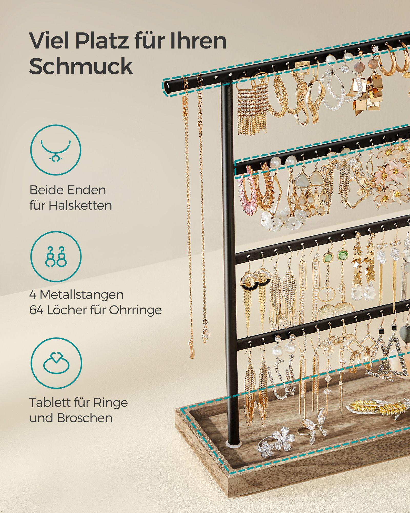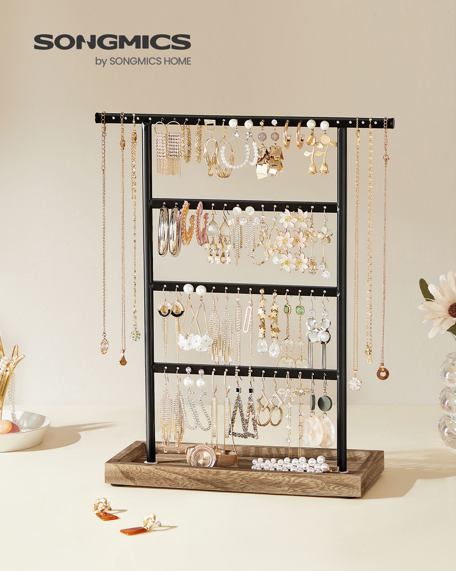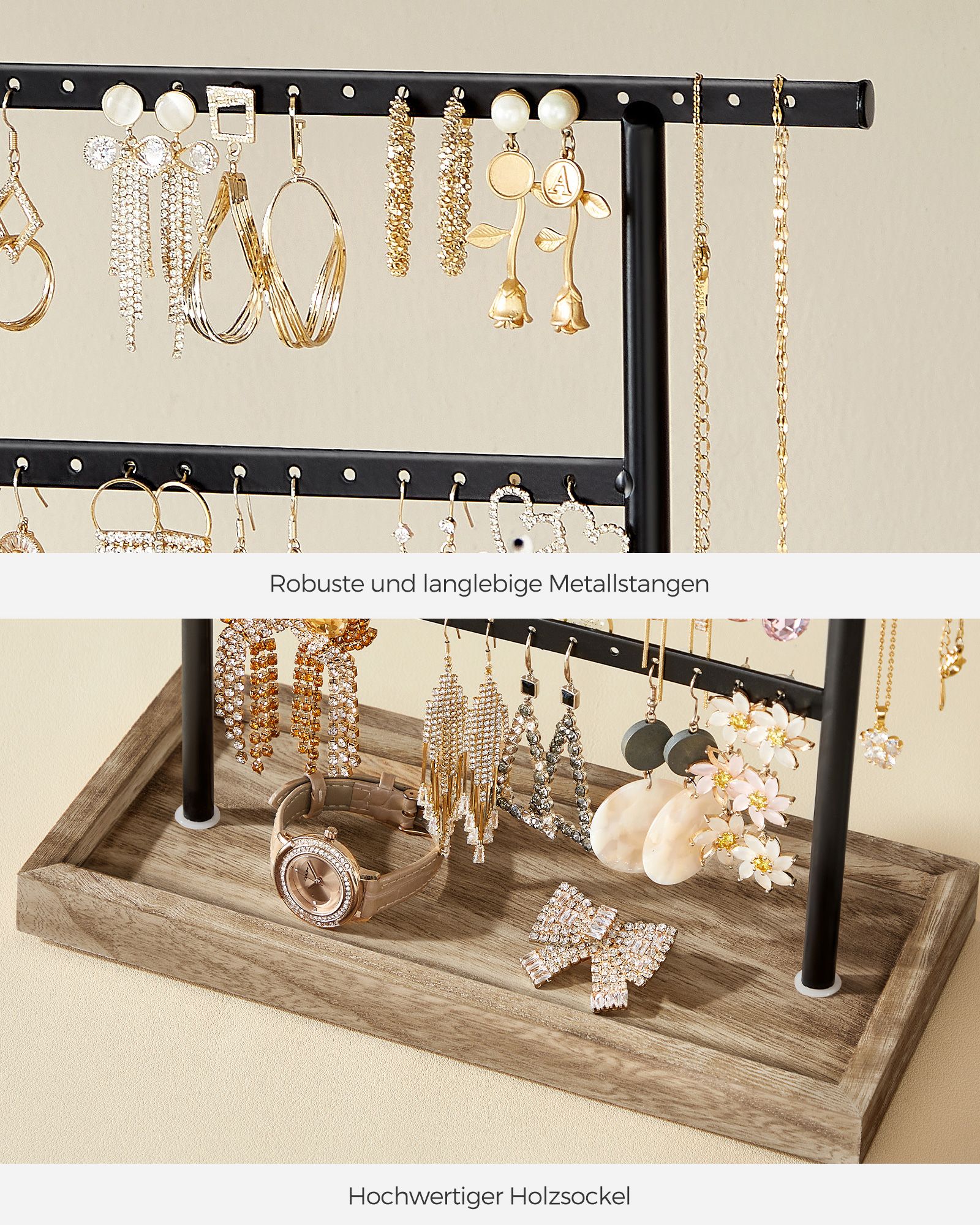 SONGMICS koruteline, koruteline korutelineellä, 4 tankoa, ketjuteline, puinen jalusta, korujen säilytyskorvakorut, nappikorvakorut, vintage-tyyli