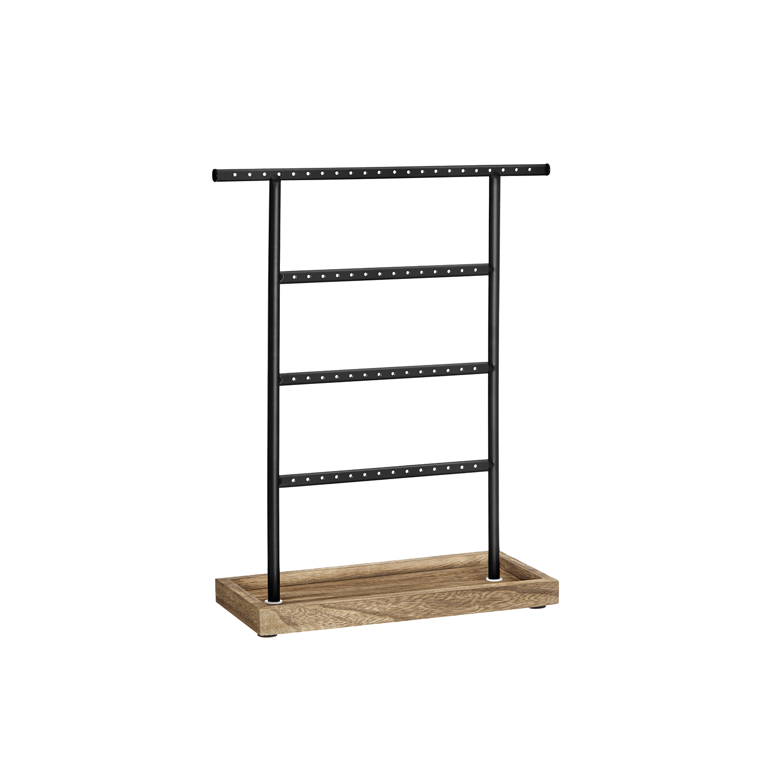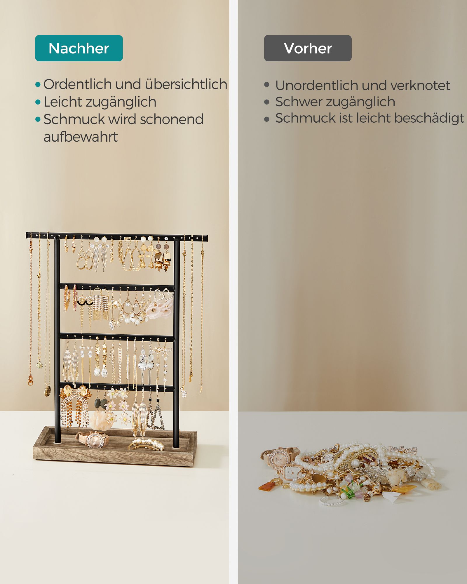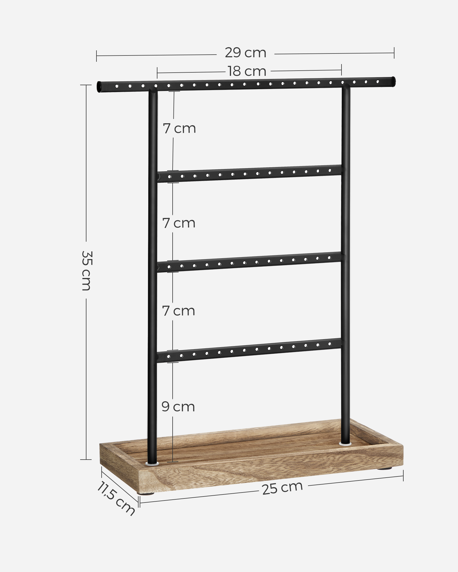 SONGMICS koruteline, koruteline korutelineellä, 4 tankoa, ketjuteline, puinen jalusta, korujen säilytyskorvakorut, nappikorvakorut, vintage-tyyli
