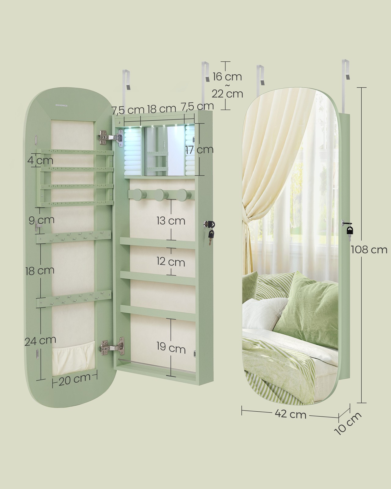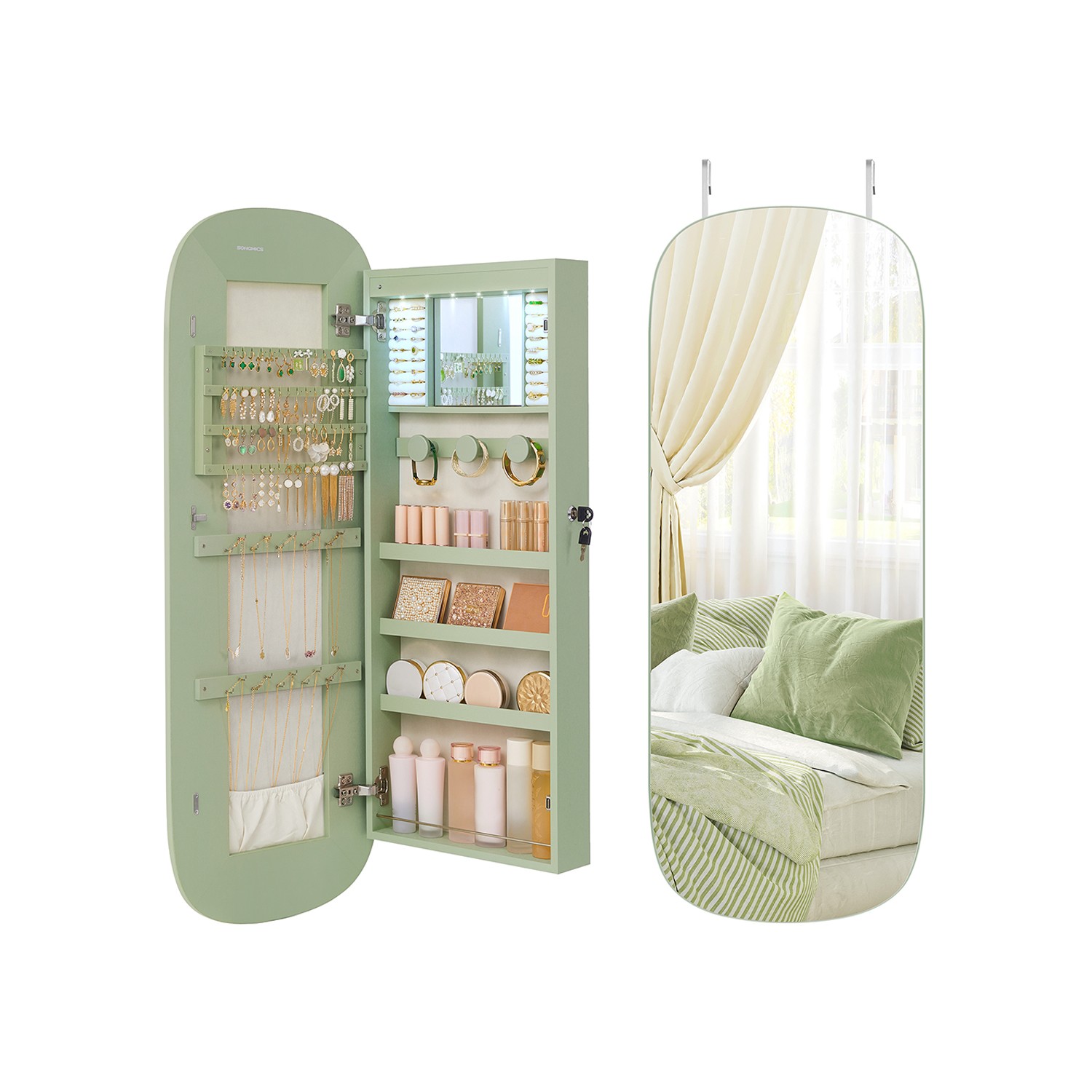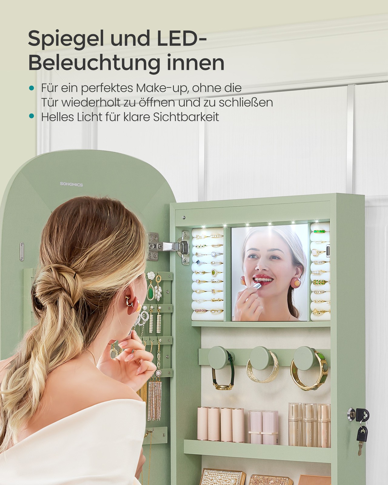 SONGMICS korukotelo, peilikaappi, korujen säilytyslaatikko LED-valaistuksella, lukittava, seinäkaappi peilillä, korvakoruille, kaulakoruille
