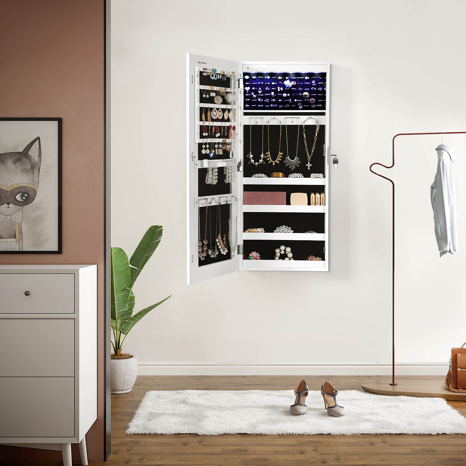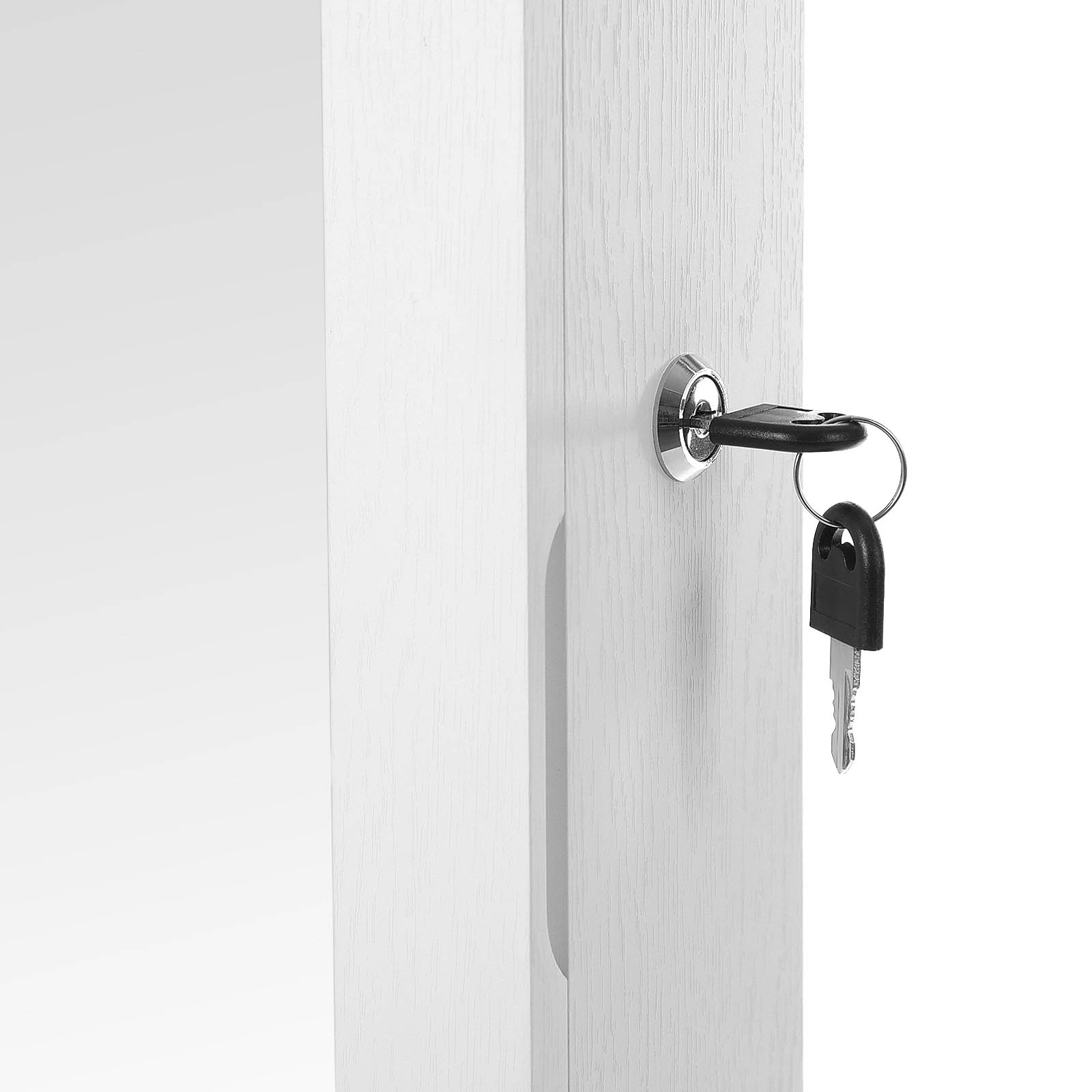 Uusi punainen mekko istuu kuin valettu, sujautat jalkaasi korkokengät ja ihailet asuasi tämän huomiota herättävän korukaapin suuressa peilissä, joka voidaan ripustaa makuuhuoneesi oveen tai kiinnittää seinälle. Hetkinen! Jotain puuttuu vielä! Sopivat korvakorut ja kimaltava kaulakoru viimeistelevät tyylisi. Onneksi sinun ei tarvitse etsiä sopivia koruja kauan, sillä ne ovat siististi rivissä peilikaapin oven takana.Korujen ystäville on tarjolla seuraavat edut: Leveä peili kapealla kehyksellä suuremman peilipinnan saavuttamiseksi Voidaan ripustaa ovenkarmiin tai kiinnittää seinälle 5 riviä, joissa kussakin 18 korvakorutelineitä (yhteensä 90) ja 6 korvakorupaikkaa (yhteensä 30) 6 riviä, joissa kussakin 13 paikkaa sormuksille (yhteensä 78) 2 x 12 koukkua ketjuille jne. (yhteensä 24) LED-sisävalaistus (automaattinen päälle- ja poiskytkentä) Lukittava Tuotetiedot: Väri: valkoinen Materiaali: MDF (keskitiheä kuitulevy)Koko: 37,2 x 9,5 x 90,3 cm (P x L x K) Paino: 8 kg Toimitus sisältää: 1 x korukaappi 1 x säilytyslaatikko lisävarusteille 1 x ohjeet (DE, EN, FR, ES, IT) SONGMICS-huomautukset: Pidä lapset poissa lisävarusteista ja pakkausosista tämän tuotteen kokoamisen aikana. Niiden nieleminen tai hengittäminen voi aiheuttaa hengenvaarallisia tilanteita.