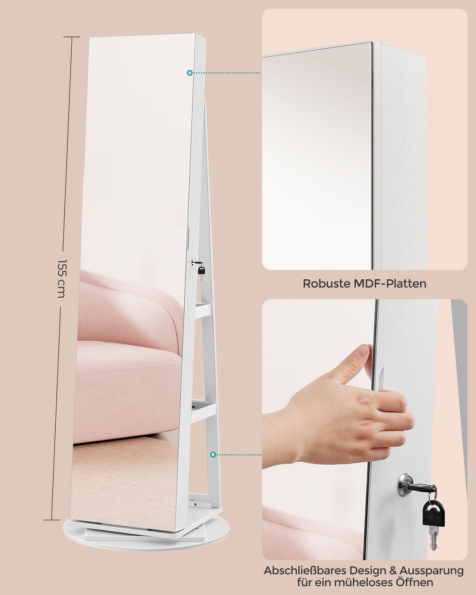SONGMICS peilikaappi, korukaappi peilillä, LED-sisävalaistus, kehyksetön kokovartalopeili, 3 hyllyä, 360° kääntyvä, lukittava, valkoinen puukuviolla JJC007W01