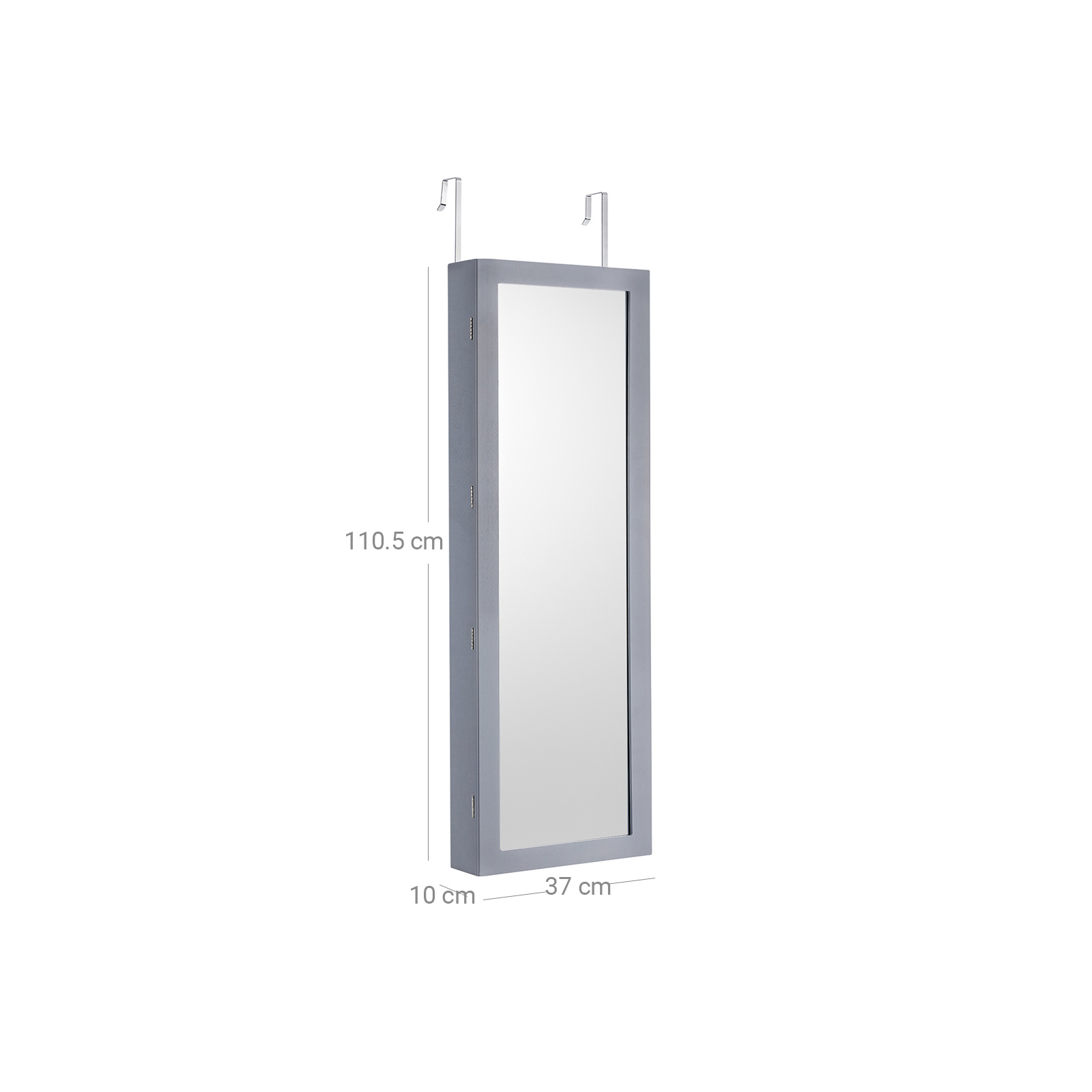 Tuotetiedot: – Väri: harmaa – Materiaali: MDF (keskitiheä kuitulevy), sametti, lasi – Koko: 37 x 10 x 120 cm (P x L x K) – Peilin mitat: 110 x 27,3 cm (P x L) – Paino: 9,96 kg Toimitus sisältää: – 1 x korukaappi – 2 x koukku – 1 x säilytyslaatikko lisävarusteille – 1 x käyttöohje (DE, EN, FR, ES, IT) SONGMICS Huomautukset: – Poista paristot, jos LED-valoa ei käytetä pitkään aikaan. – Älä sijoita tätä tuotetta kosteaan ympäristöön, jotta se ei väänny.