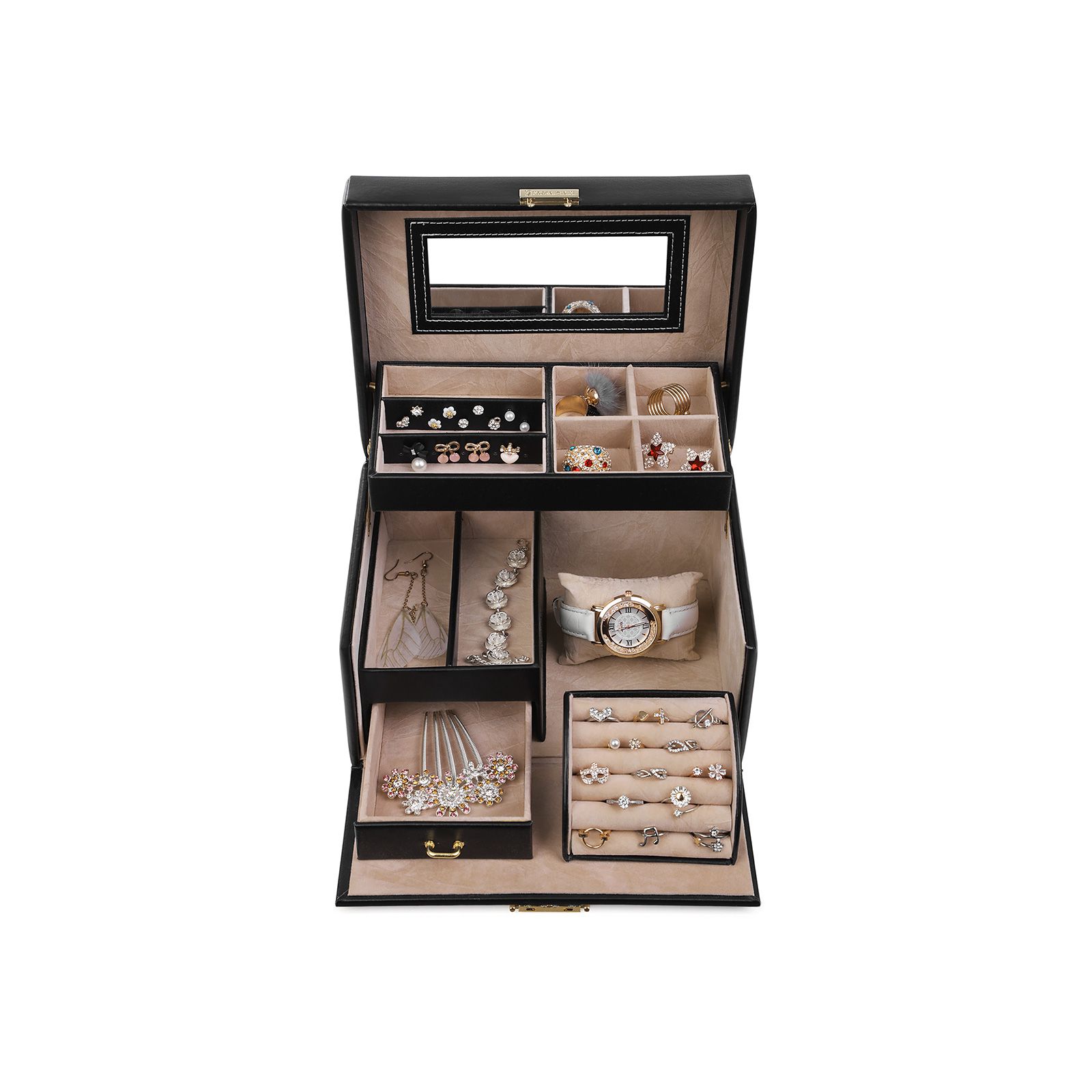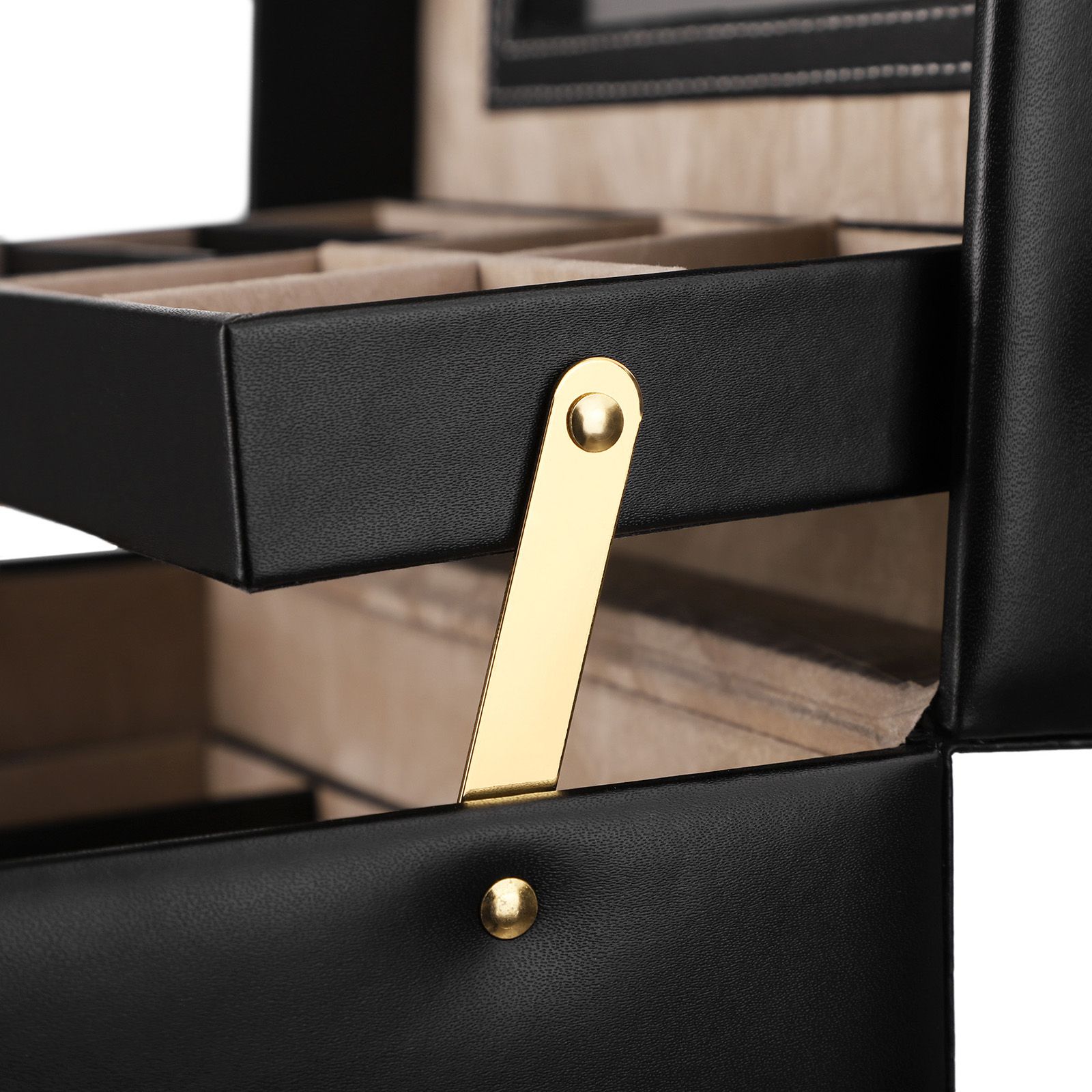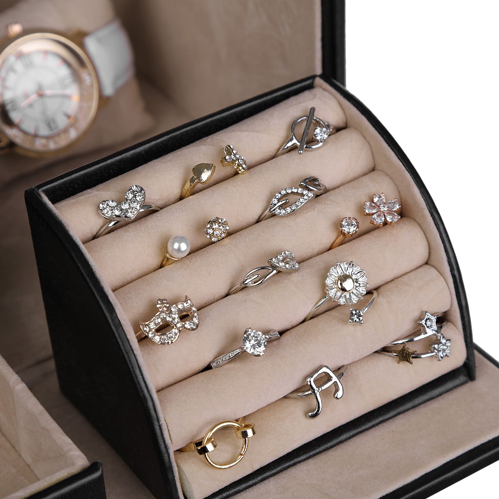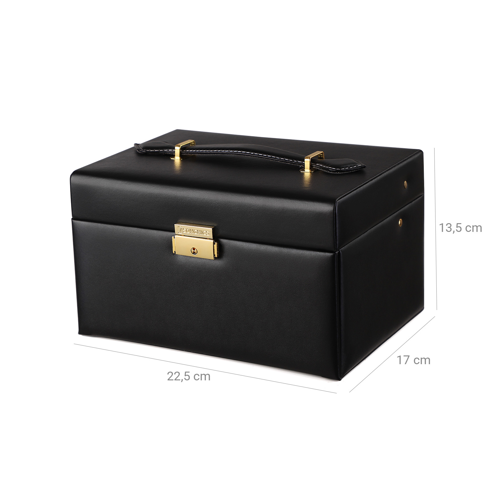 Kaunis, tyylikäs ja ajaton korukotelo – todellinen katseenvangitsija jokaisessa modernissa kodissa! Tämä tyylikäs korukotelo vakuuttaa paitsi elegantilla muotoilullaan myös toiminnallisuudellaan. Se sopii täydellisesti kellojen, kaulakorujen, korvakorujen ja monien muiden korujen säilytykseen – myös matkoilla. Lisäksi se suojaa arvokkaita lempikoruja pölyltä ja naarmuilta. Tämä Songmicsin tyylikäs korurasia on huolellisesti valmistettu ja helppohoitoinen, ja se on ehdoton hankinta kaikille korujen ystäville. Tuotetiedot: Väri: musta Materiaali: Pinta: keinonahka; runko: keskitiheä puukuitulevy; sisäosa: sametti Mitat: 22,5 x 17 x 13,5 cm Ensimmäinen taso: Vasemmalla puolella on 2 rengaslevyä, jotka on jaettu 3 yhtä suureen lokeroon (mitat: 9,5 x 3 cm). Oikealla puolella on 4 pientä lokeroa (4,5 x 4,5 cm). Taso: 2 yhtä suurta lokeroa (13 x 4,5 cm). Taso: 1 suuri lokero (13 x 8,5 cm). Toisen tason oikealla puolella on kellotyyny (9 x 6,5 cm) ja rengasnauha (10 x 7 x 7 cm). Nettopaino: 1,06 kg. Toimitus sisältää: 1 x korukotelo, 2 x avain.