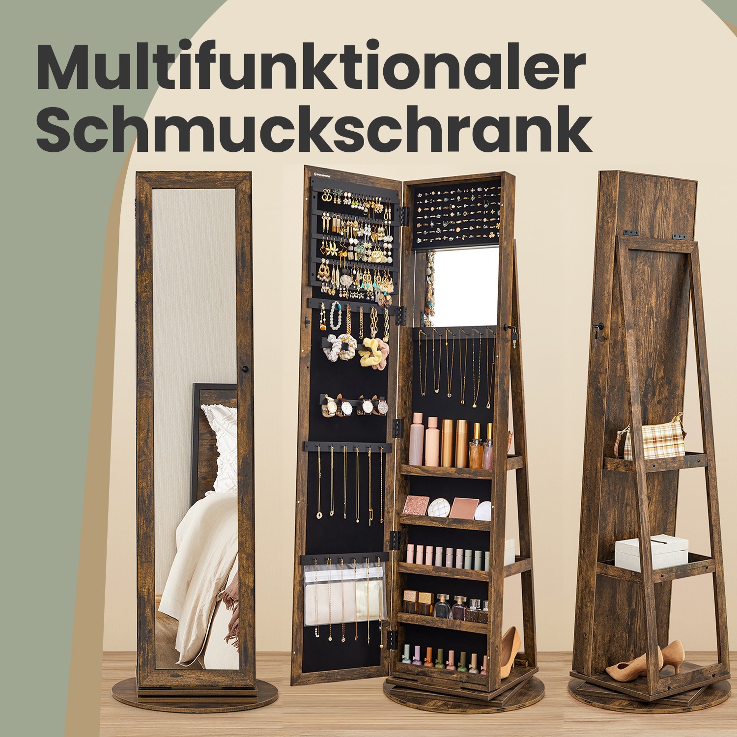 Korujen ystäville Tämä tilava korukaappi on suunniteltu korujen ystäville. Sen koko on 37 x 9,5 x 155 cm, joten se on 35 cm korkeampi kuin useimmat korukaapit ja tarjoaa runsaasti tilaa yli 200 korulle. Ei vain koruille Kaapin 5 hyllylle voi sijoittaa hajuvesiä, ihonhoitotuotteita, meikkejä ja kynsilakkoja. Kahdelle hyllylle ja takaseinälle mahtuu käsilaukku, taitetut vaatteet, kirjat ja kasvit. Kätevä peili sisällä Sisällä olevan peilin ansiosta voit viimeistellä meikkisi ilman, että sinun tarvitsee mennä peilipöydän ääreen tai sulkea korukaapin ovea. Turvallinen ja vakaa Tämä korukaappi on valmistettu kestävästä puumateriaalista ja se on lukittava. Kaapin ovi sulkeutuu tiiviisti magneetin ansiosta. Tuotetiedot: – Väri: vintage-ruskea – Materiaali: MDF (keskitiheä kuitulevy), lasipeili, samettiverhoilu – Kokonaismitat: 54 x 54 x 161 cm (P x L x K) – Kaapin mitat: 37 x 9,5 x 155 cm (P x L x K) – Ulkopeilin mitat: 26 x 144 cm (P x K) – Sisäpeilin koko: 34,5 x 23 cm (P x K) – Paino: 21,4 kg Toimitus sisältää: – 1 x korukaappi – 1 x lisävarustepaketti – 1 x ohjeet (DE, EN, FR, ES, IT) SONGMICS-ohjeet:- Älä altista tuotetta voimakkaalle auringonvalolle pitkäksi aikaa. – Sijoita tuote kuivaan paikkaan. – Turvallisuussyistä lapset eivät saa kiivetä tuotteen päälle tai leikkiä sillä.