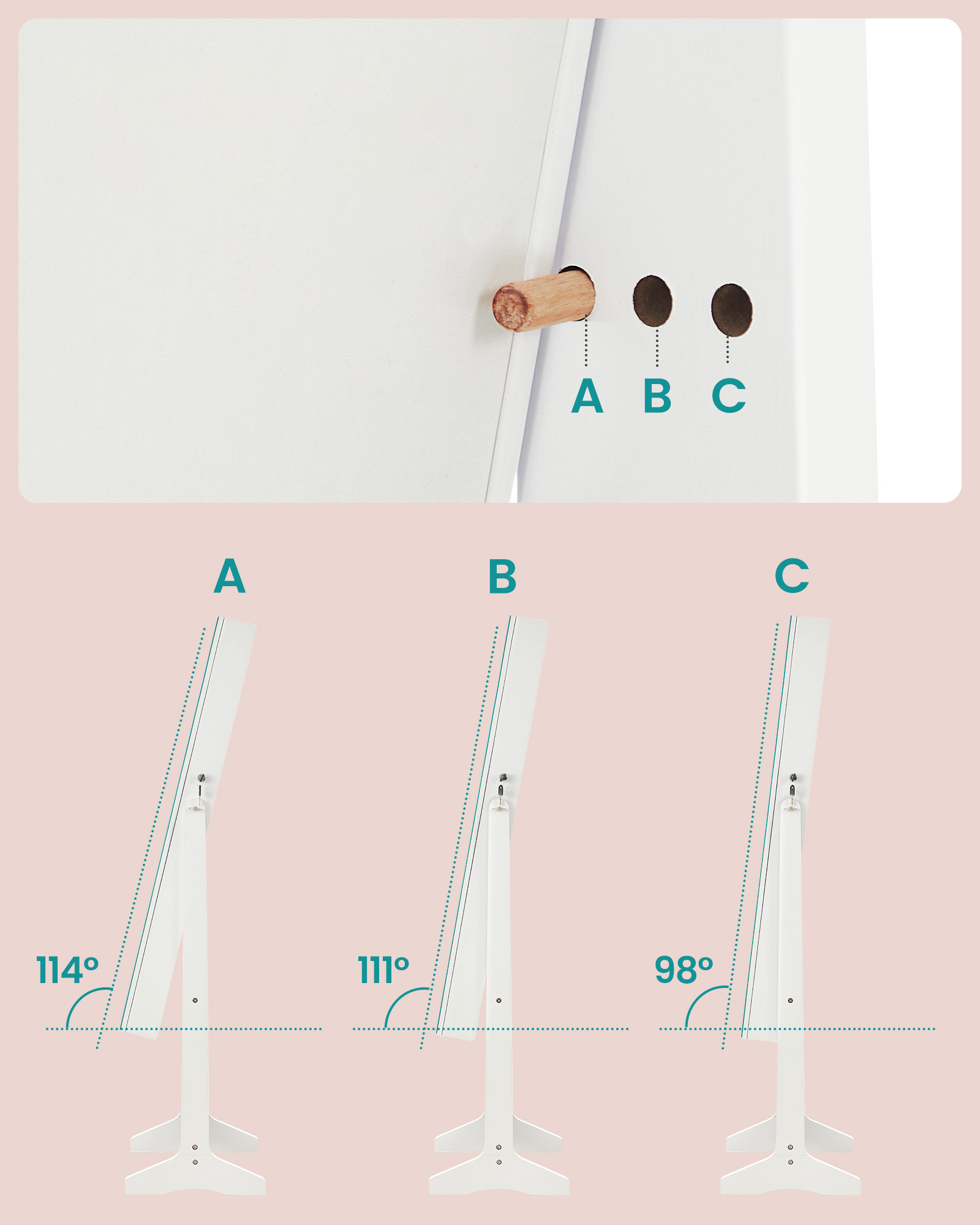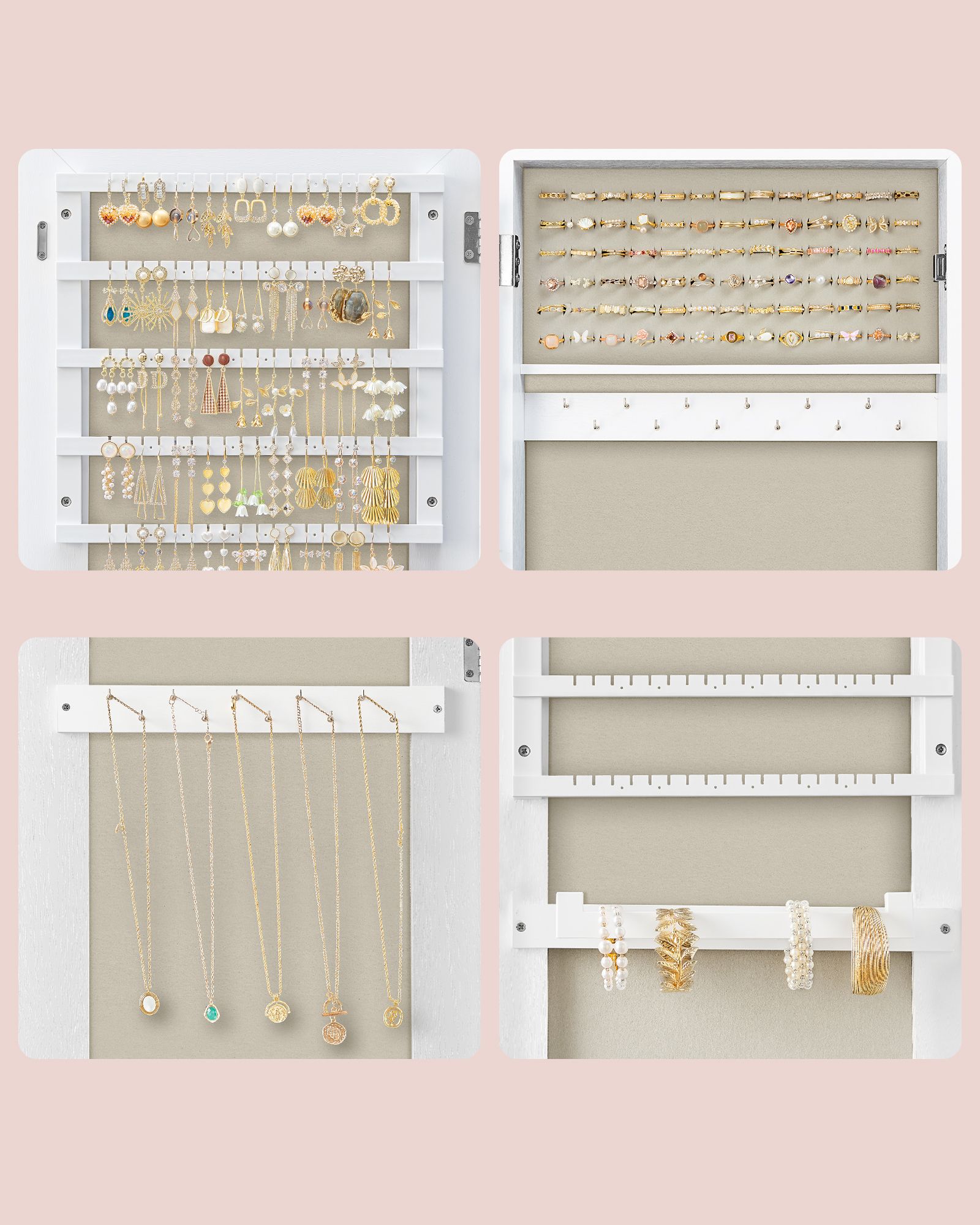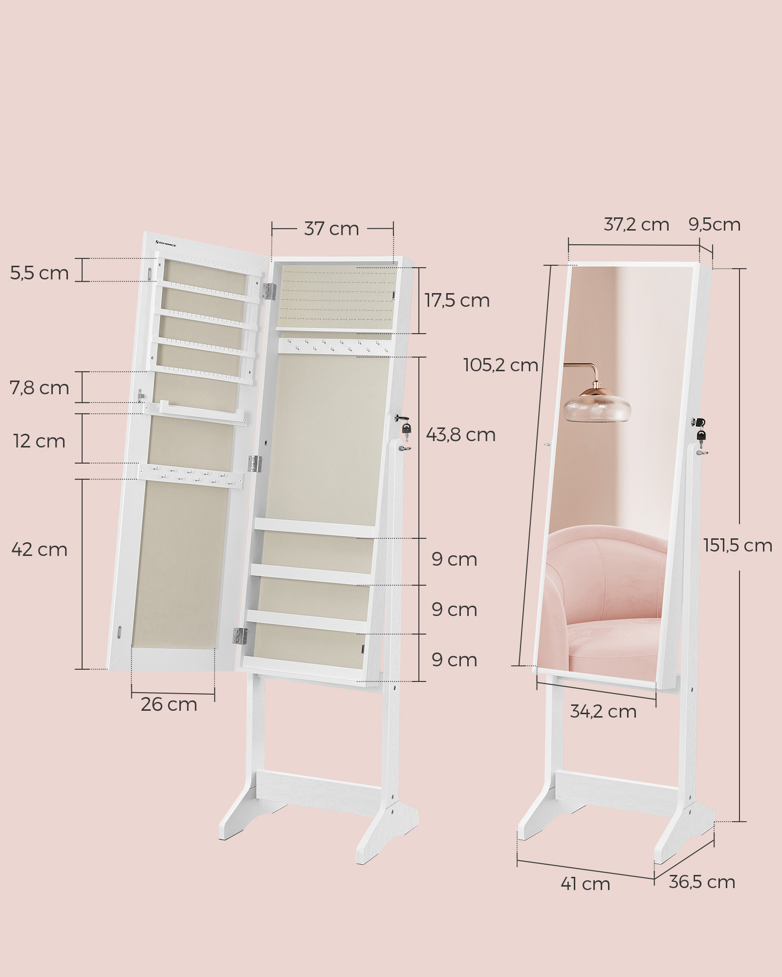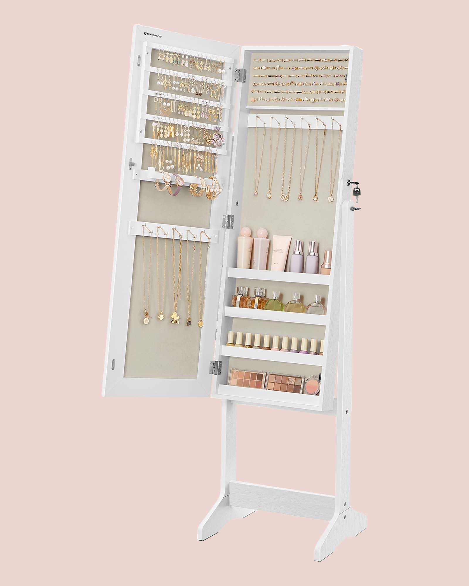 SONGMICS peilikaappi Armoire seisova kokovartalopeili lukittava korujen säilytyslaatikko lahjaidea valkoinen pinta ja beige vuori JJC069W02