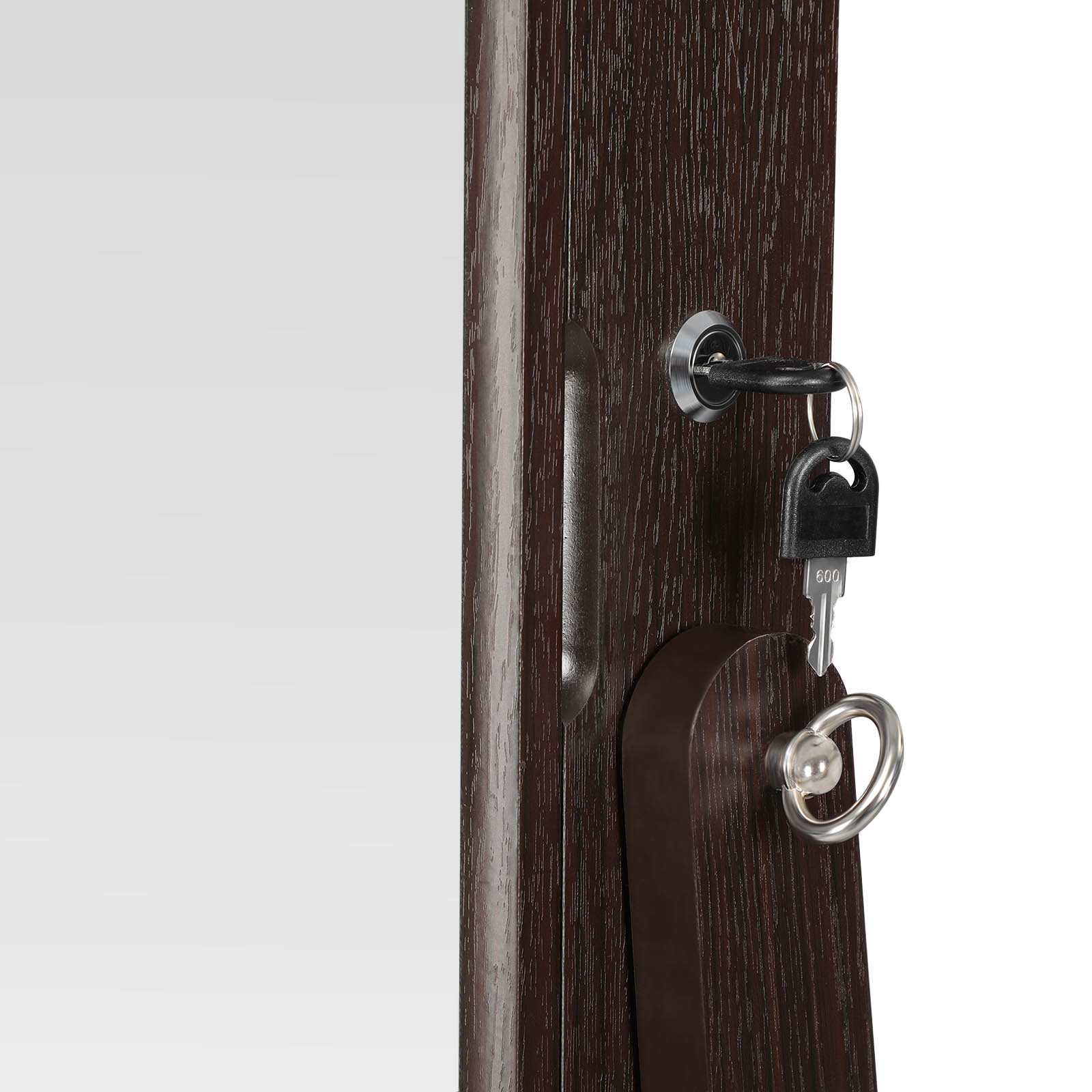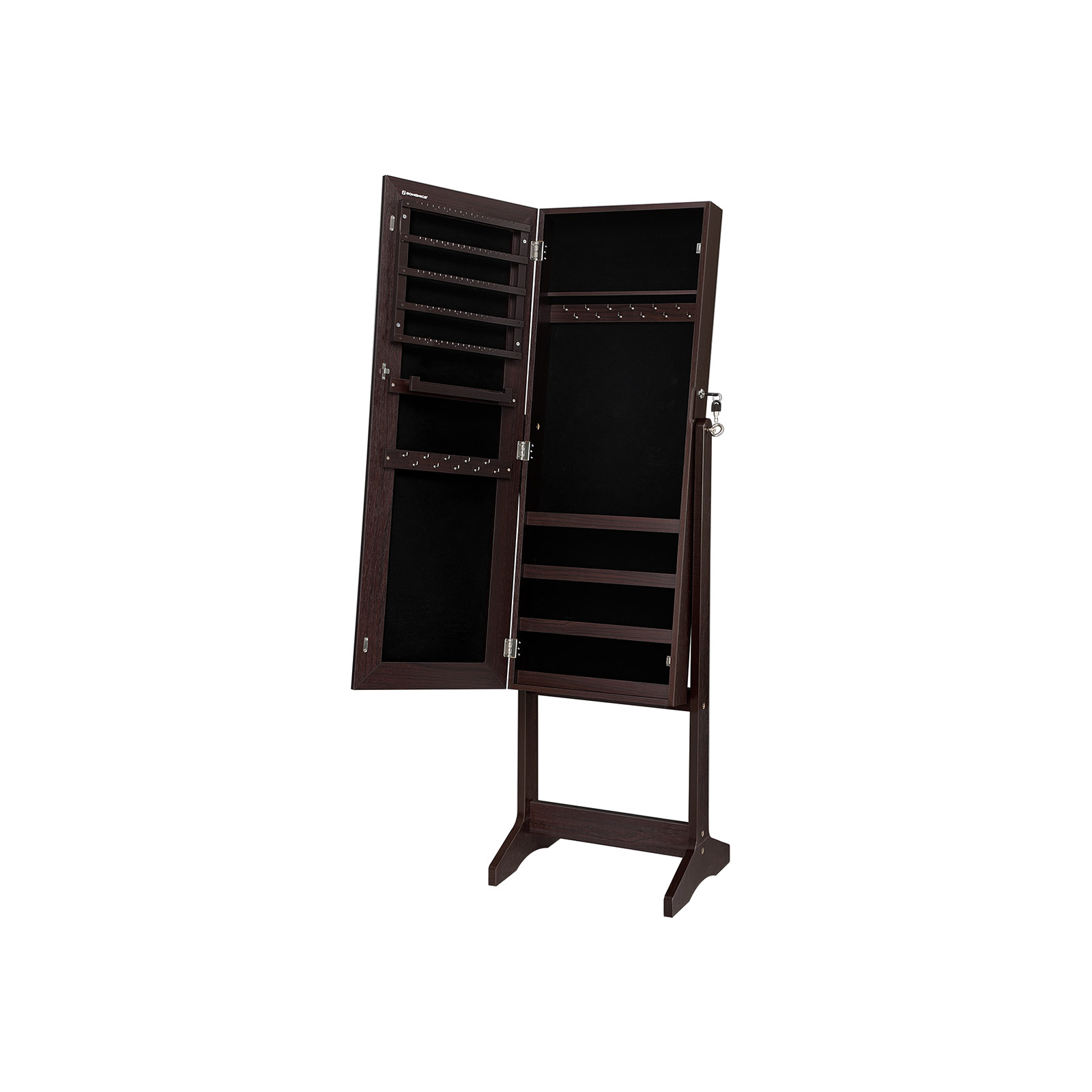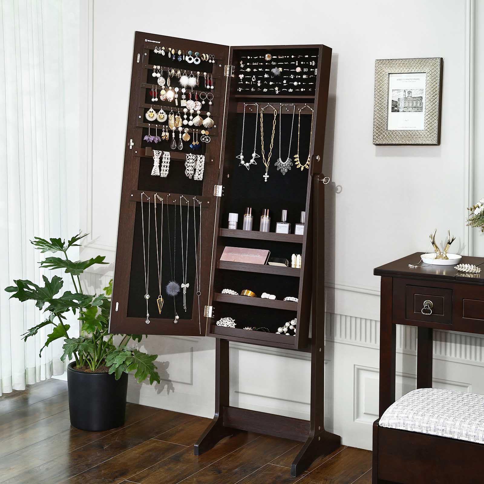 Uusi punainen mekko istuu kuin valettu, sujautat jalkaasi korkokengät ja ihailet asuasi tämän huomiota herättävän korukaapin suuressa peilissä. Hetkinen! Jotain puuttuu vielä! Sopivat korvakorut ja kimaltava kaulakoru viimeistelevät tyylisi. Onneksi sinun ei tarvitse etsiä sopivia koruja kauan, sillä ne ovat siististi rivissä peilikaapin oven takana. Korujen ystäville tarjotaan seuraavat edut:Koko vartalon peili hillityllä kehyksellä, joka lisää peilin pinta-alaa 5 riviä, joissa kussakin 18 korvakorutelineitä (yhteensä 90) ja 6 korvakorupaikkaa (yhteensä 30) 6 riviä, joissa kussakin 13 paikkaa sormuksille (yhteensä 78) 2 x 12 koukkua ketjuille jne. (yhteensä 24) 4 säädettävää kallistuskulmaa Lukittava Tuotetiedot: Väri: ruskea Materiaali: MDF (keskitiheä kuitulevy) Kokonaismitat: 41,1 x 36,5 x 151,5 cm (P x L x K) Kaapin rungon mitat: 37,2 x 9,5 x 108,3 cm (P x L x K) Paino: 11,3 kg Toimitus sisältää: 1 x korukaappi 1 x säilytyslaatikko lisävarusteille 1 x ohjeet (DE, EN, FR, ES, IT) SONGMICS-huomautukset: Pidä lapset poissa kaikista lisävarusteista ja pakkausosista tämän tuotteen kokoamisen aikana. Niiden nieleminen tai hengittäminen voi aiheuttaa hengenvaarallisia tilanteita.