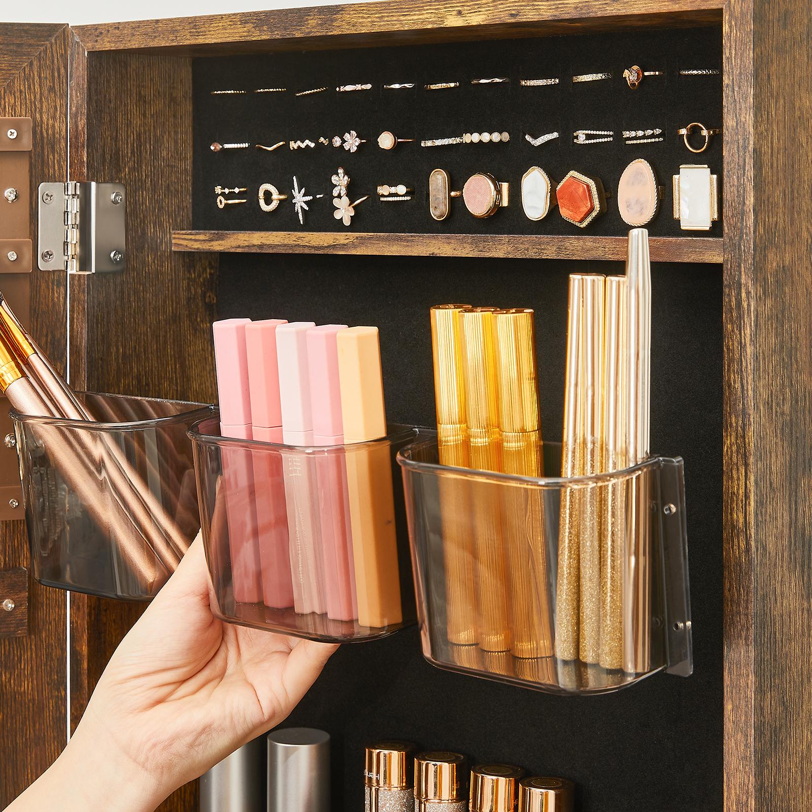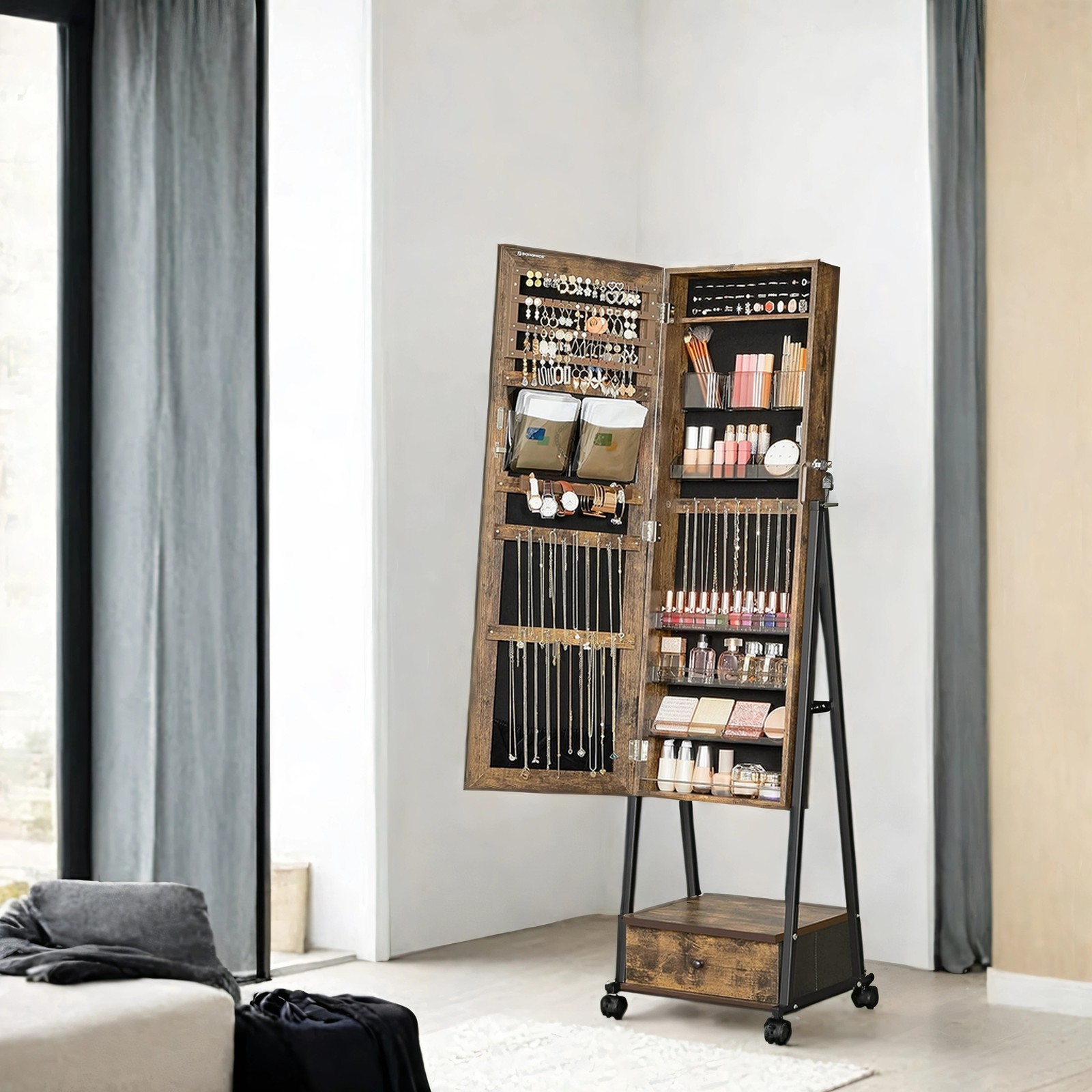 Sano hyvästit kaaokselle Tilava kaappi, kokovartalopeili, hylly ja laatikko – säilytä kaikki tarvitsemasi tässä toimivassa kaapissa ja säästä aikaa ja tilaa. Tämän huonekalun tilavan ja fiksun rakenteen ansiosta voit järjestellä tavarasi kuin ammattilainen. Säilytystilaa, kestävyyttä ja tyyliä – arvostamme kaikkia näitä tekijöitä tässä korukaapissa: – Valmistettu korkealaatuisesta puumateriaalista, joka takaa hyvän kestävyyden päivittäisessä käytössä – Useita lokeroita, koukkuja, reikiä ja paikkoja erilaisten asusteiden säilyttämiseen – Yksinkertainen mutta tyylikäs muotoilu, joka tuo huoneeseesi lämpöä ja charmia – Lahjoita tämä tyylikäs korukaappi rakkaillesi ja tuo iloa heidän kasvoilleen Tuotetiedot:- Väri: vintage-ruskea-musta – Materiaali: MDF (keskitiheä kuitulevy), metalli, lasipeili, kuitukankaasta valmistettu laatikko MDF-etupuolella – Kokonaismitat: 41,5 x 37 x 152,5 cm (P x L x K) – Kaapin rungon mitat: 37 x 10,5 x 108,5 cm (P x L x K) – Paino: 14,2 kg Toimitus sisältää: – 1 x korukaappi – 1 x lisävarustepaketti – 1 x kaatumissuoja – 1 x ohjeet (DE, EN, FR, ES, IT) SONGMICS Huomautukset:- Älä altista tuotetta voimakkaalle auringonvalolle pitkäksi aikaa. – Sijoita tuote kuivaan paikkaan. – Turvallisuussyistä lapset eivät saa kiivetä tuotteen päälle tai leikkiä sillä.